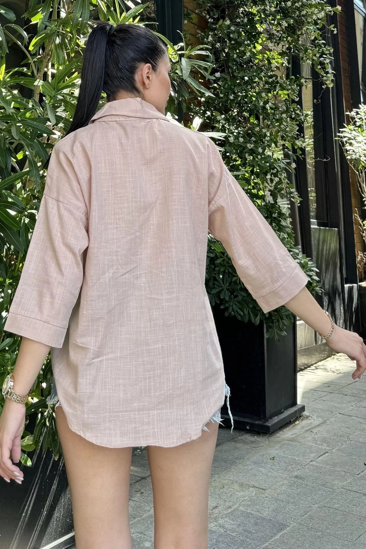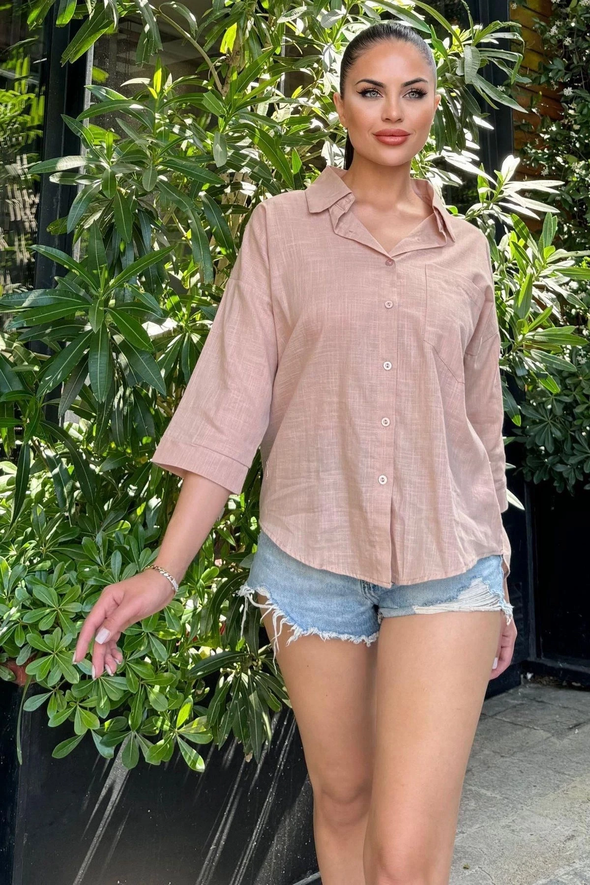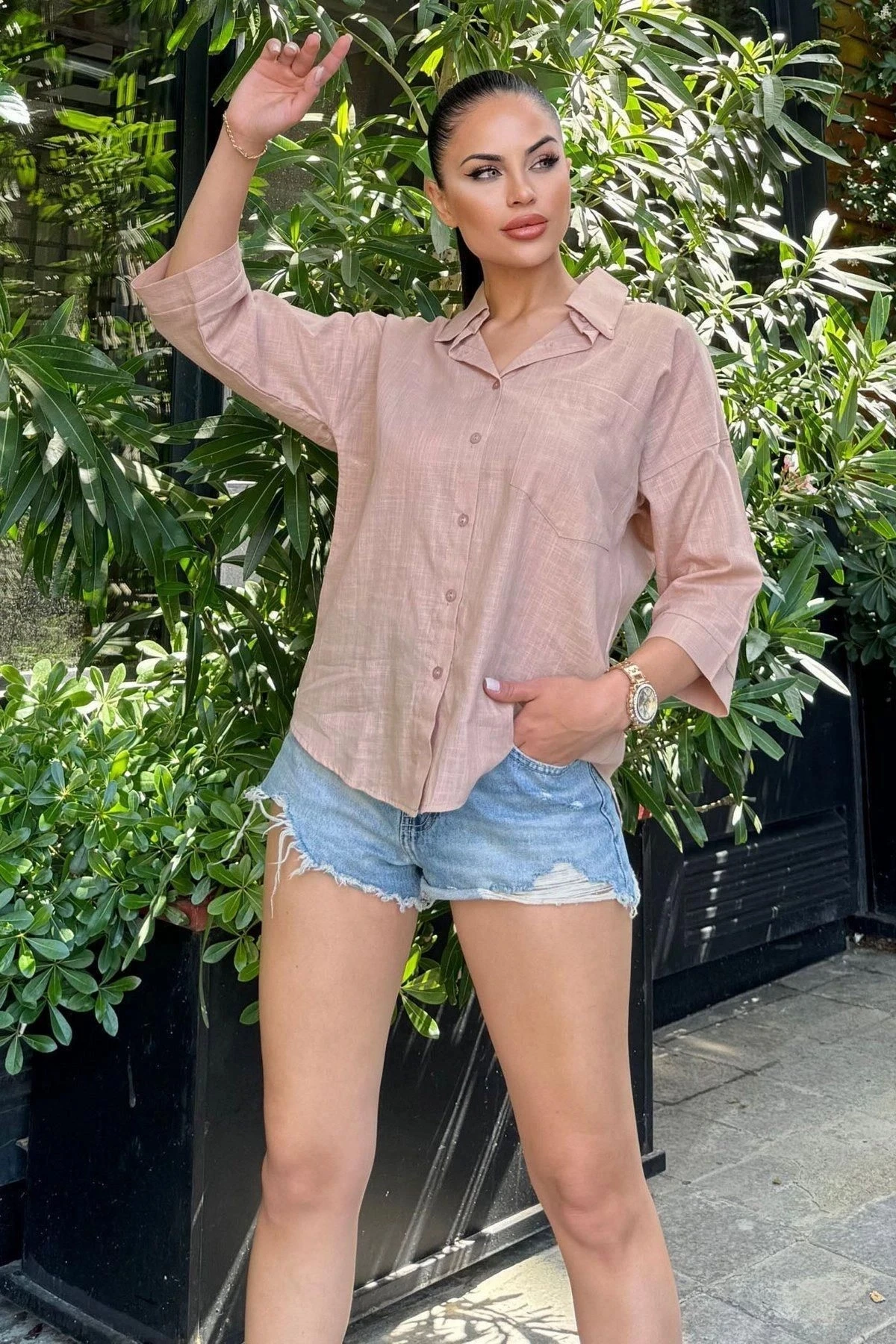 Kadın Kahve Truvakar Kol, Oval Kesim, Terletmez, Flamlı Keten Salaş Gömlek