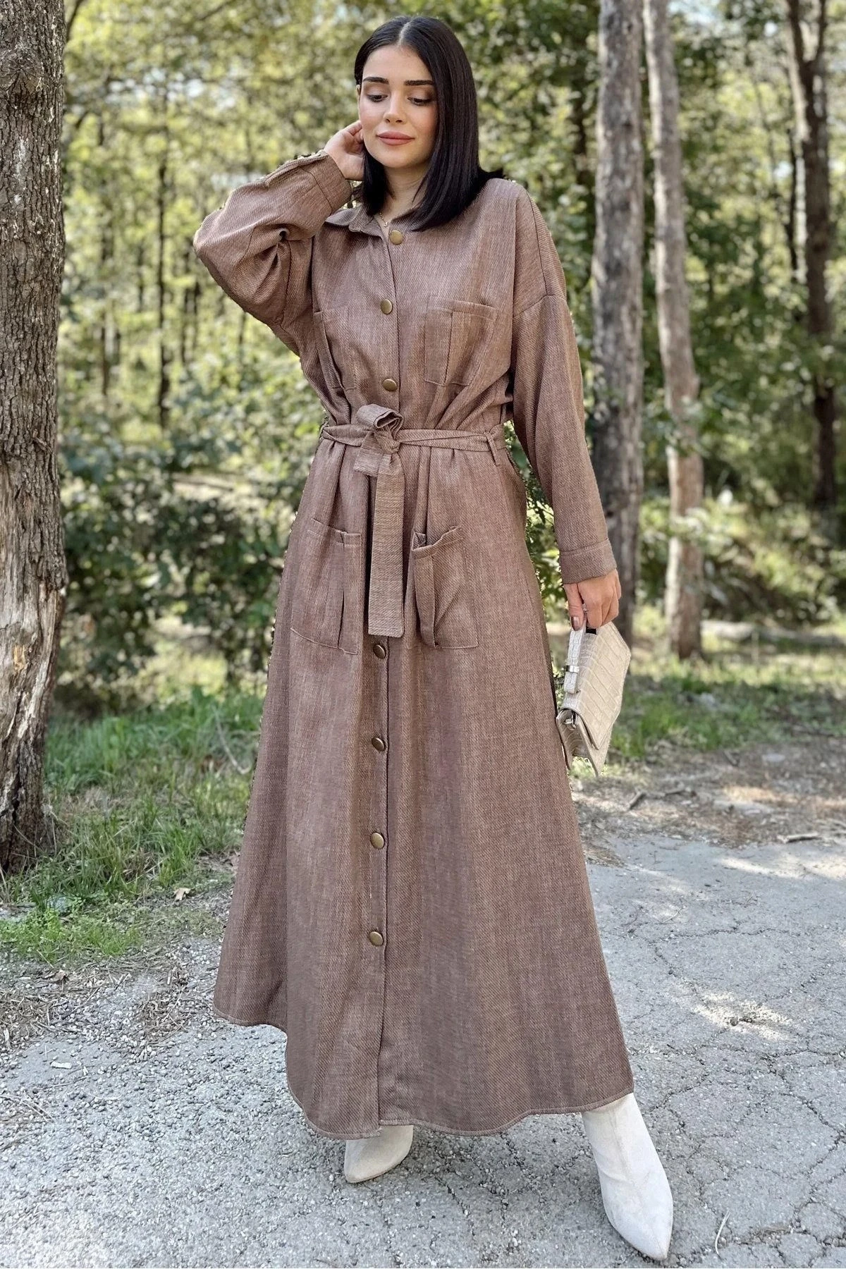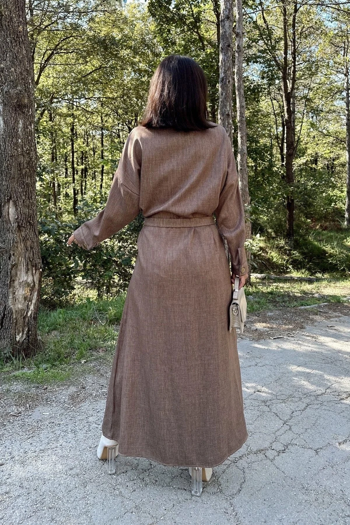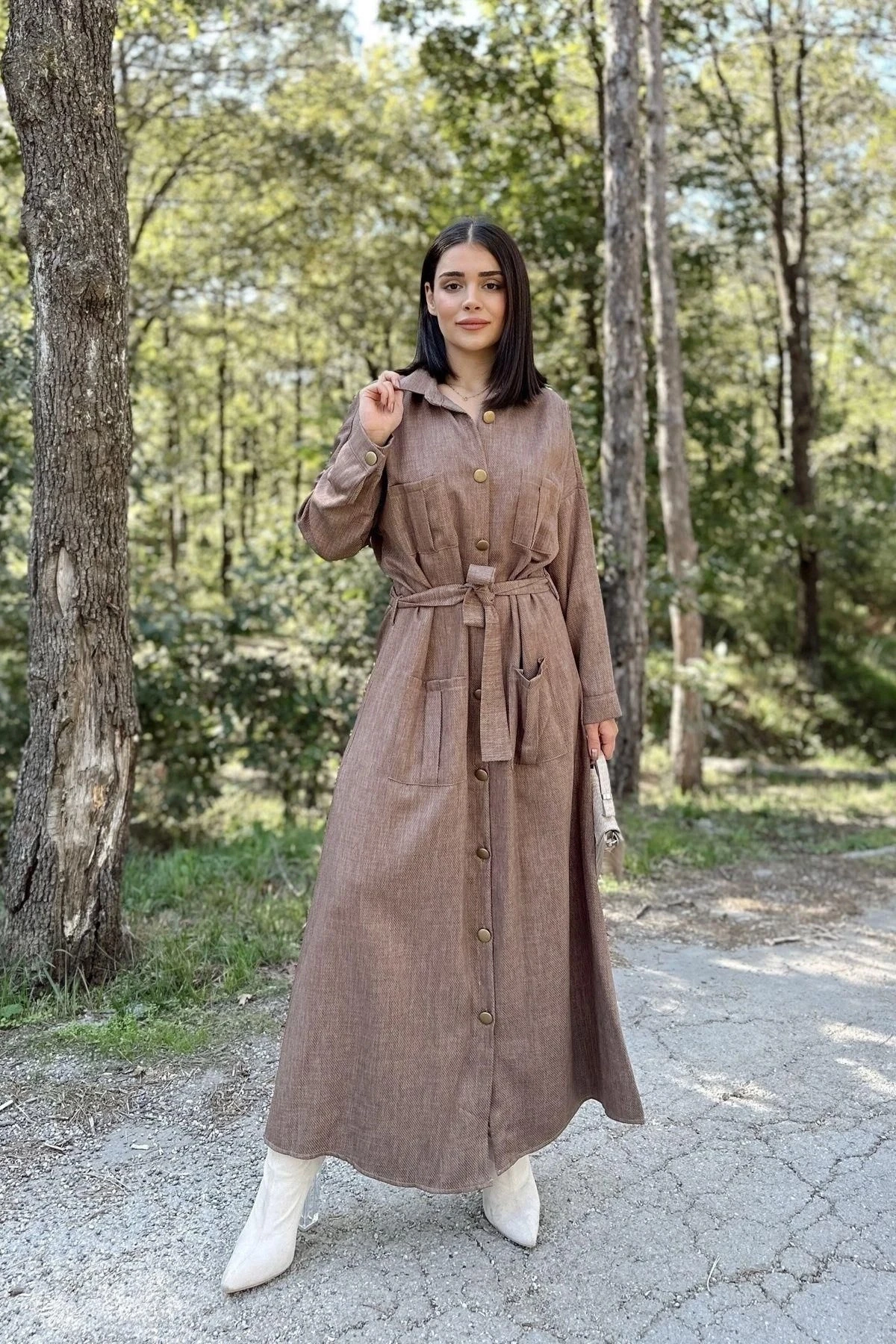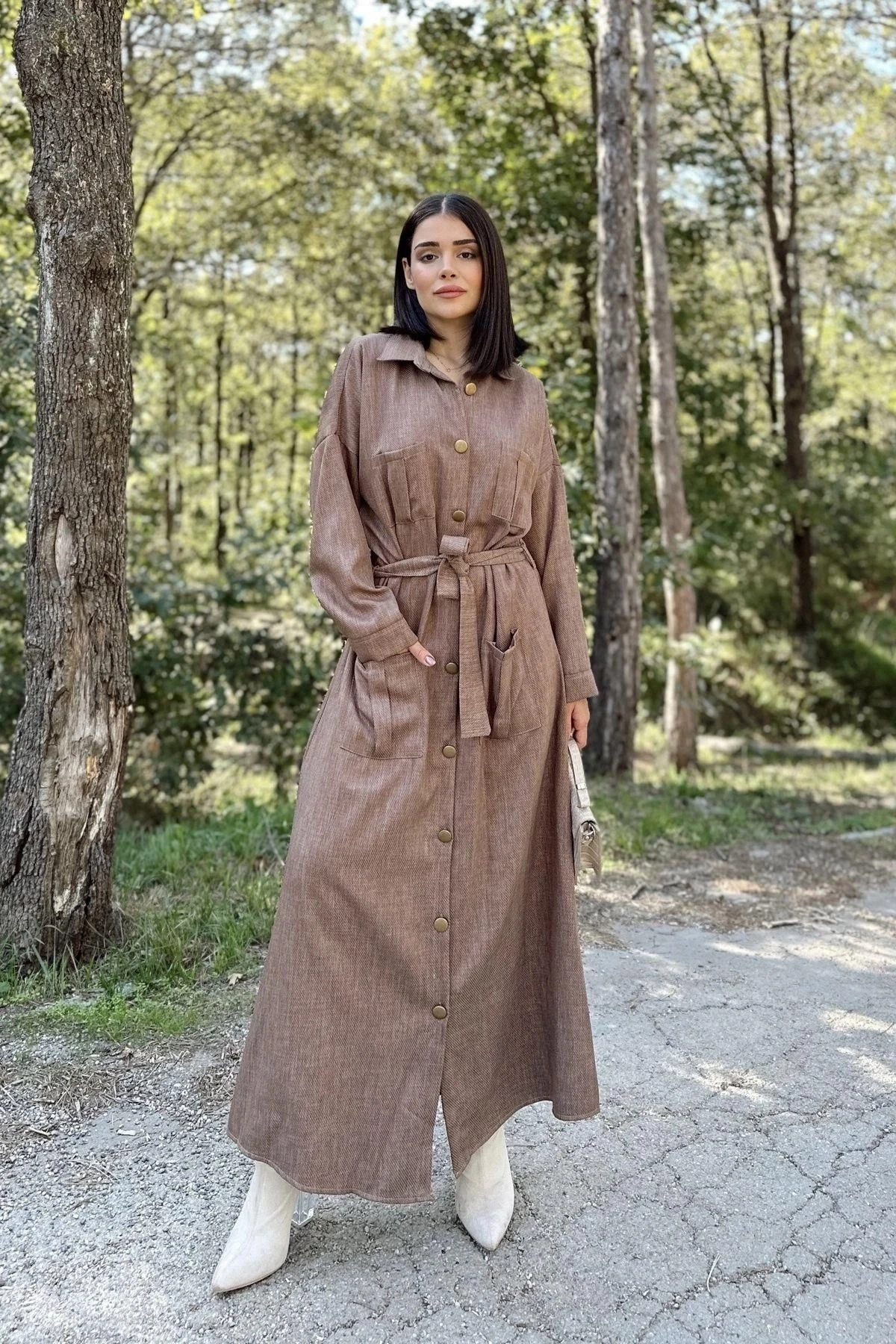 Kadın Kahve Uzun Kol, Rahat Beli Kemerli, 4 Cepli, Gabardin Keten, Maksi Gömlek Elbise