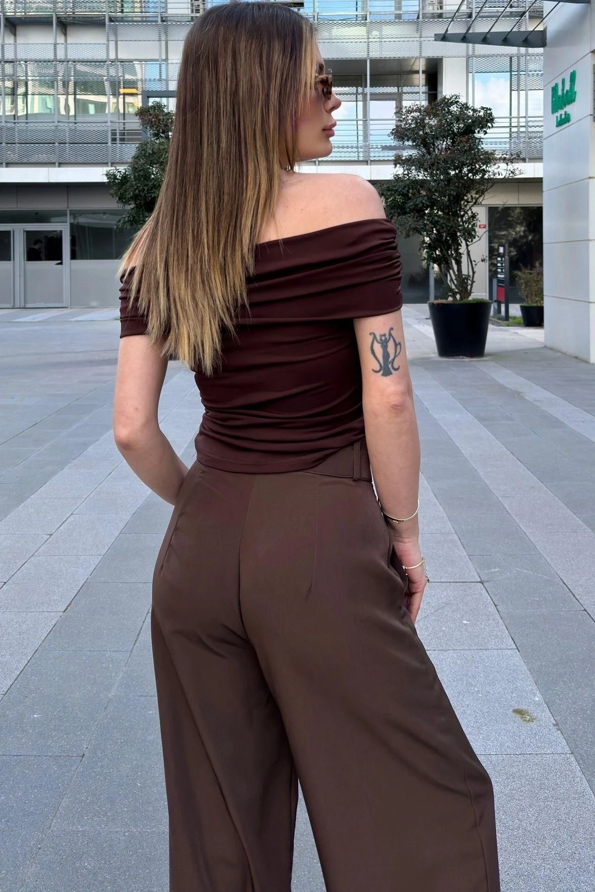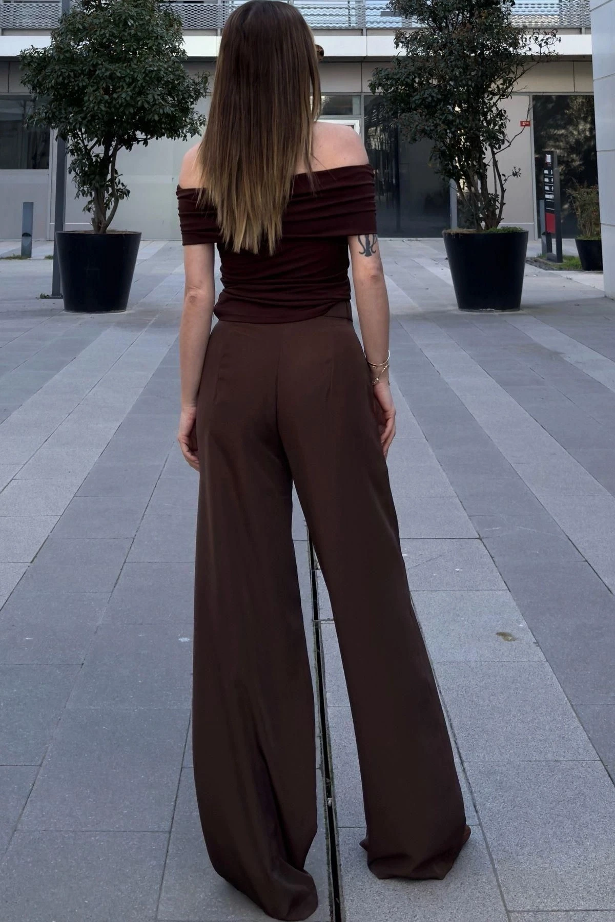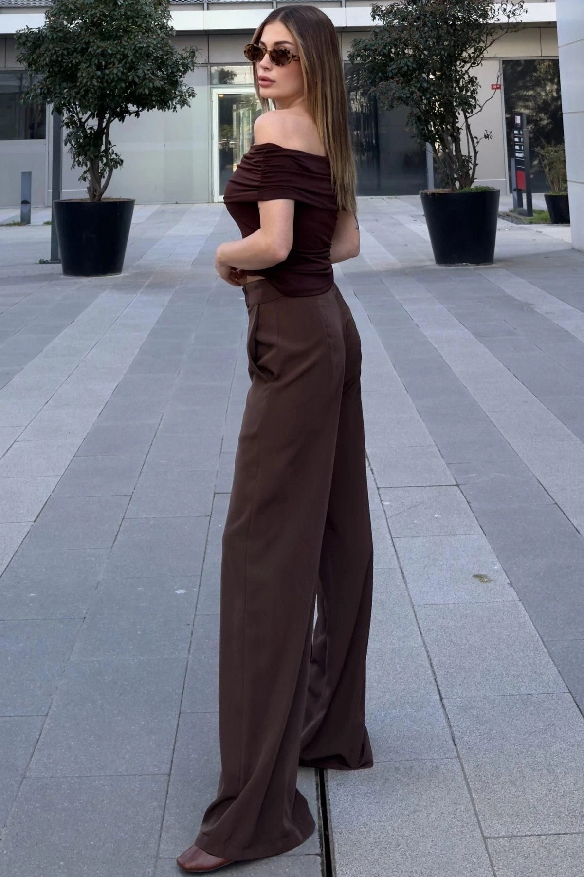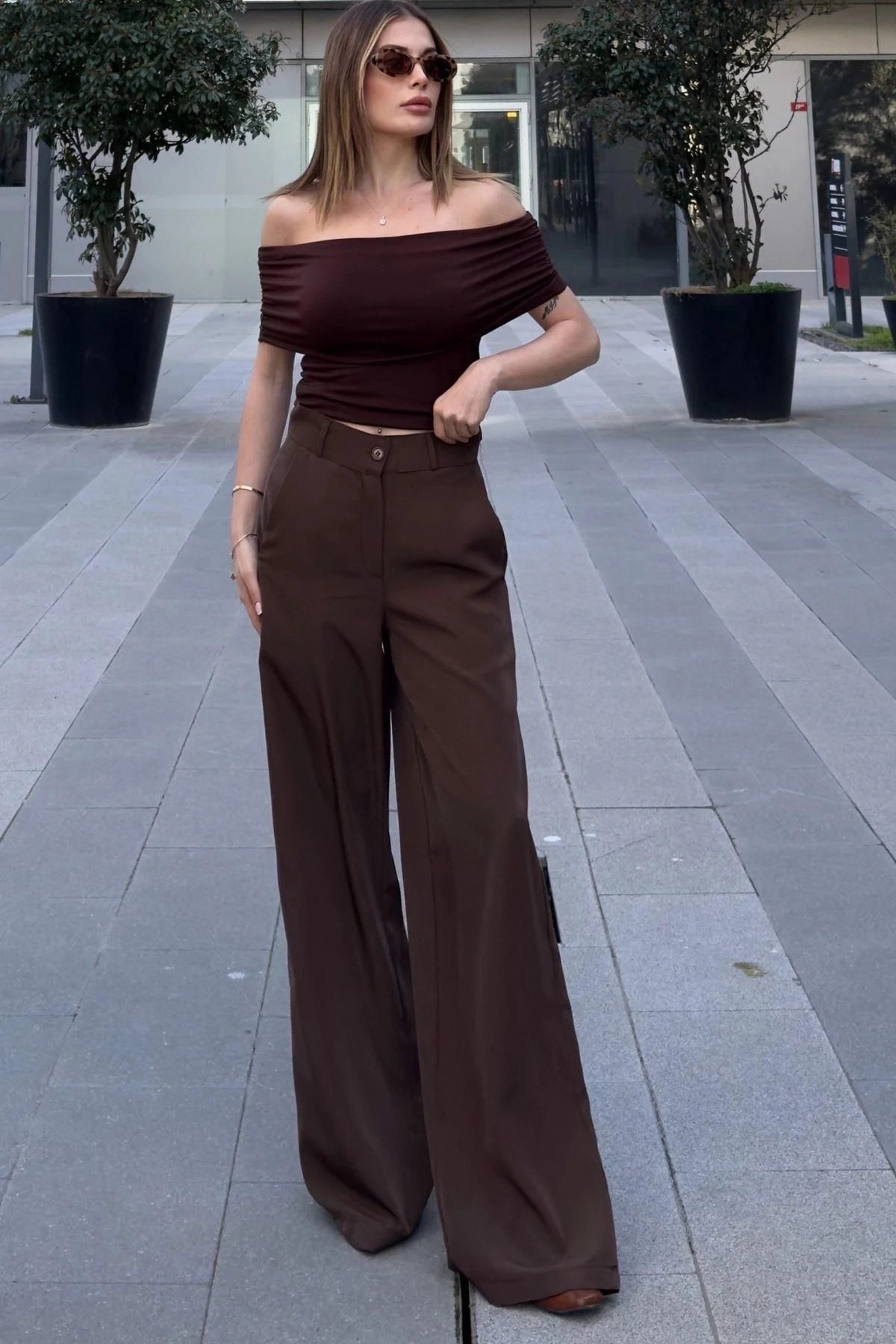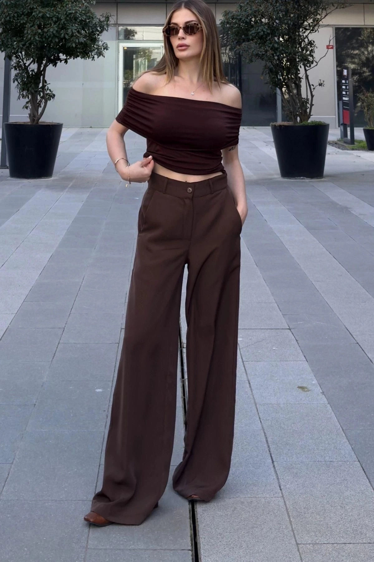 Kadın Kahve Yüksek Bel, Cepli, Bol Paça Pantolon