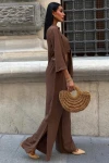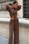 Kadın Kahverengi Ayrobin Uzun Bağlamalı Gömlek Yırtmaçlı Takım