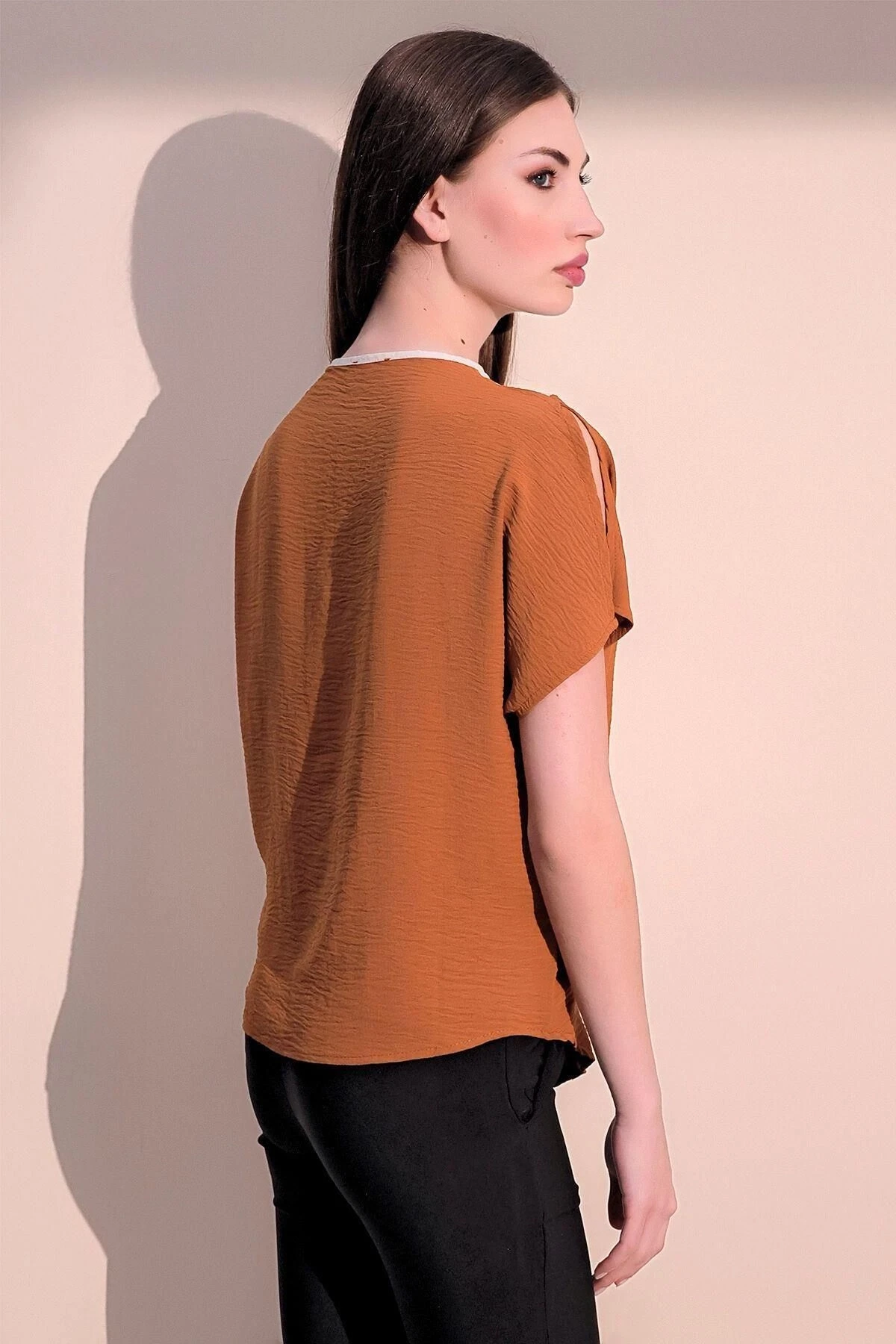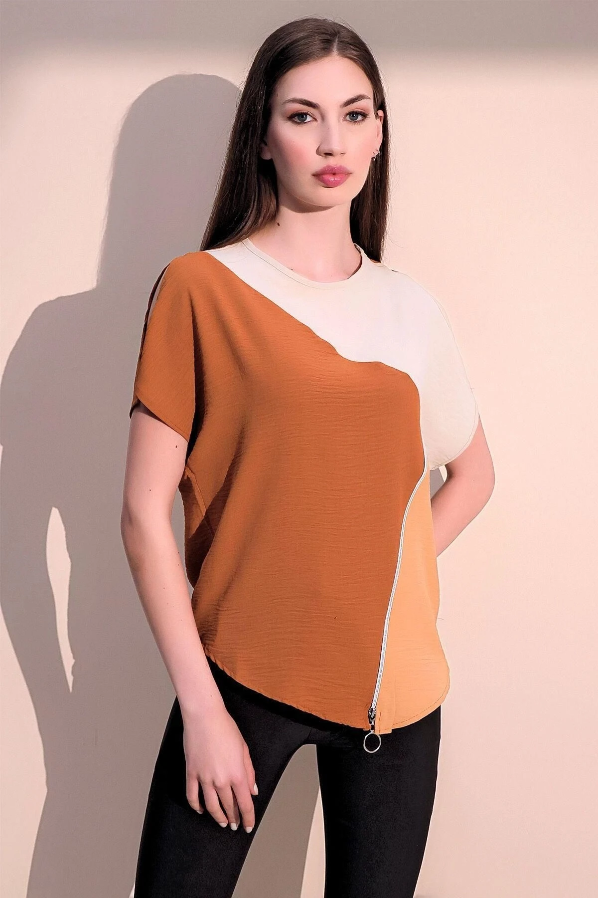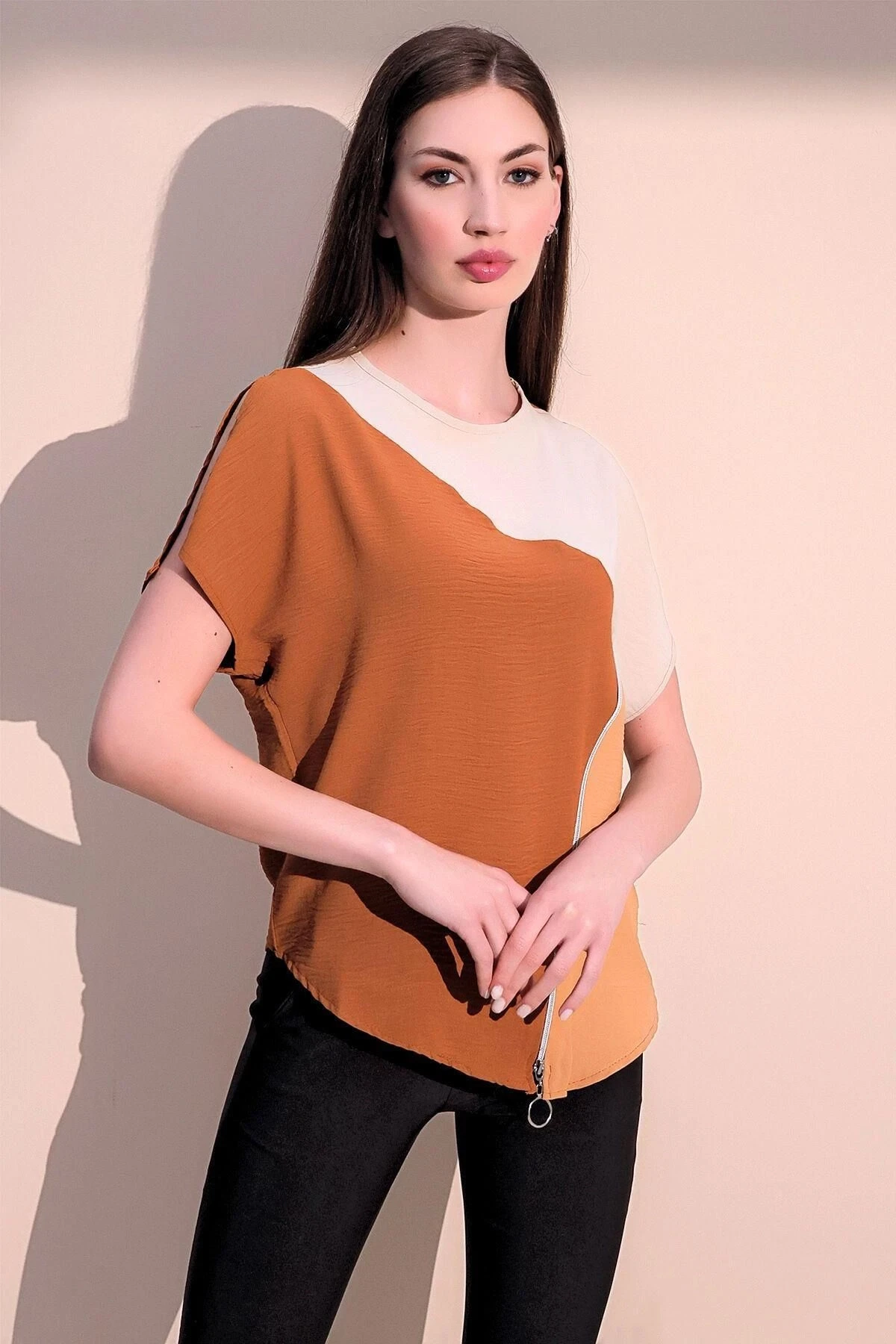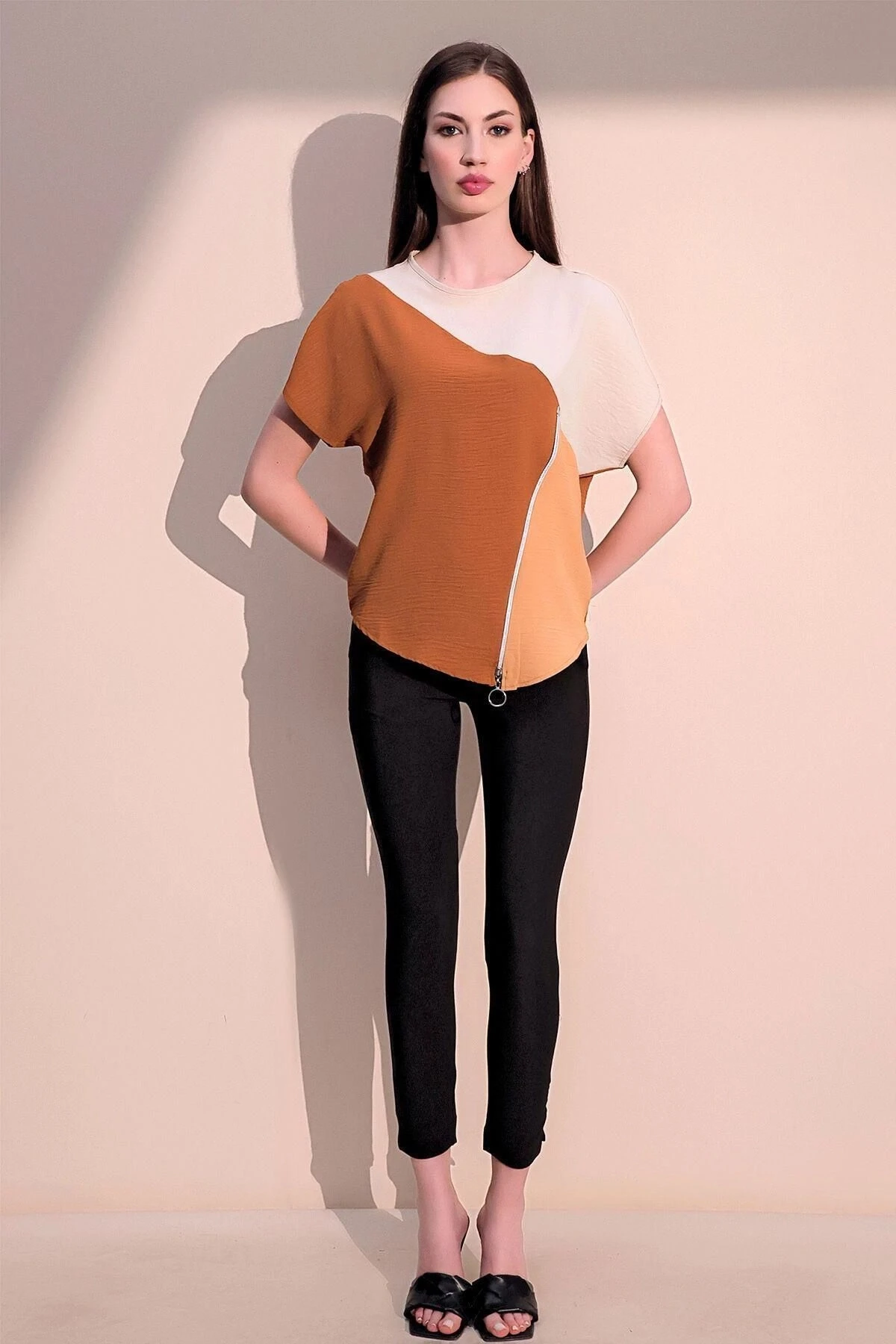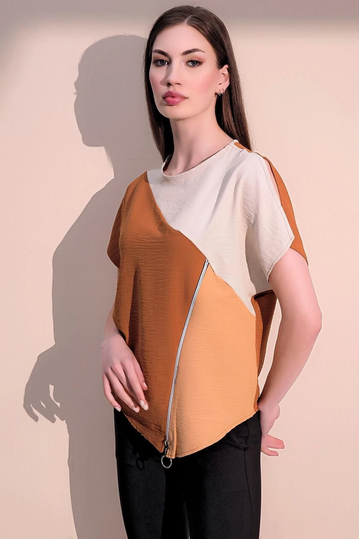 Bu şık Airobin bluz, kahverengi renkli bir color block deseniyle tasarlanmıştır, böylece stilinize canlılık katacak.; Bluzun önünde bulunan fermuar detayı, modern bir görünüm sağlarken, omuz kısmındaki yırtmaçlar da zarif bir dokunuş sunar.; Bu bluzun kumaş içeriği %60 Polyester ve %40 Pamuktan oluşmaktadır.; Polyesterin dayanıklılığı ve kırışıklık direnci, bluzun uzun ömürlü olmasını sağlarken, pamuğun yumuşaklığı ve nefes alabilirliği rahat bir giyim deneyimi sunar.; Bu kombinasyon, bluzun hem şık görünmesini hem de rahatlık sağlamasını sağlar.; Renk kalıbı, kahverengi tonlarının mükemmel bir uyumunu sunar.; Color block deseni, bluzun farklı renk bloklarının birleşimiyle oluşur ve bu da göze hoş bir kontrast oluşturur.; Kahverengi renk, doğal bir şıklık ve sofistike bir görünüm sunarak herhangi bir mekanda öne çıkmanızı sağlar.; Bu bluz, benzersiz tasarımıyla dikkat çeken bir parçadır.; Fermuar detayı, bluza modern bir hava katarak tarzınıza dinamizm katar.; Aynı zamanda omuz kısmındaki yırtmaçlar da feminen bir dokunuş sunar ve bluzun sıradışı bir detayla öne çıkmasını sağlar.; Kahverengi Renk Color Block Fermuar Detaylı Omzu Yırtmaçlı Airobin Bluz, şıklığı ve rahatlığı bir araya getiren benzersiz bir parçadır.; Hem günlük hayatta hem de özel etkinliklerde tarzınızı yansıtmak için mükemmel bir seçenektir.; Bu bluzla kendinizi özgün hissedecek ve herkesin dikkatini çekeceksiniz.