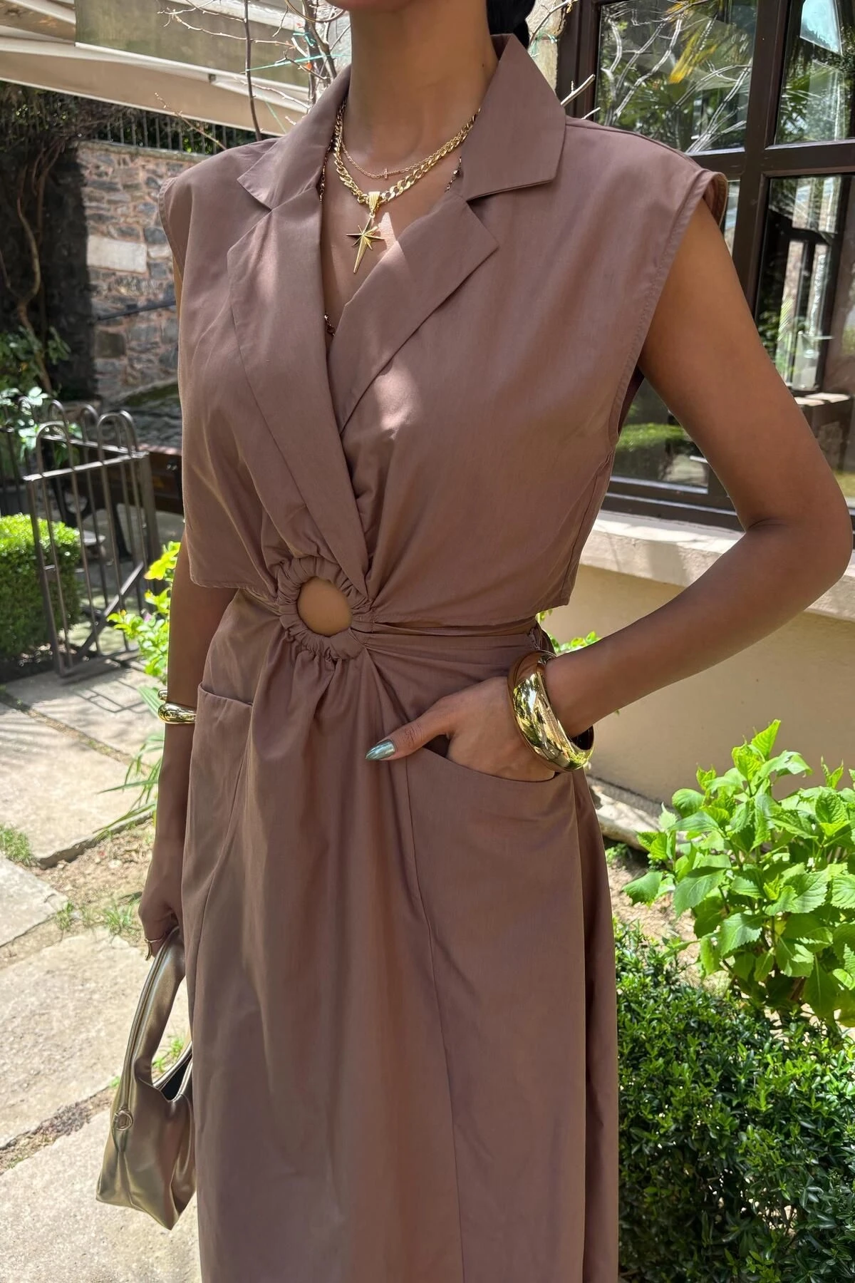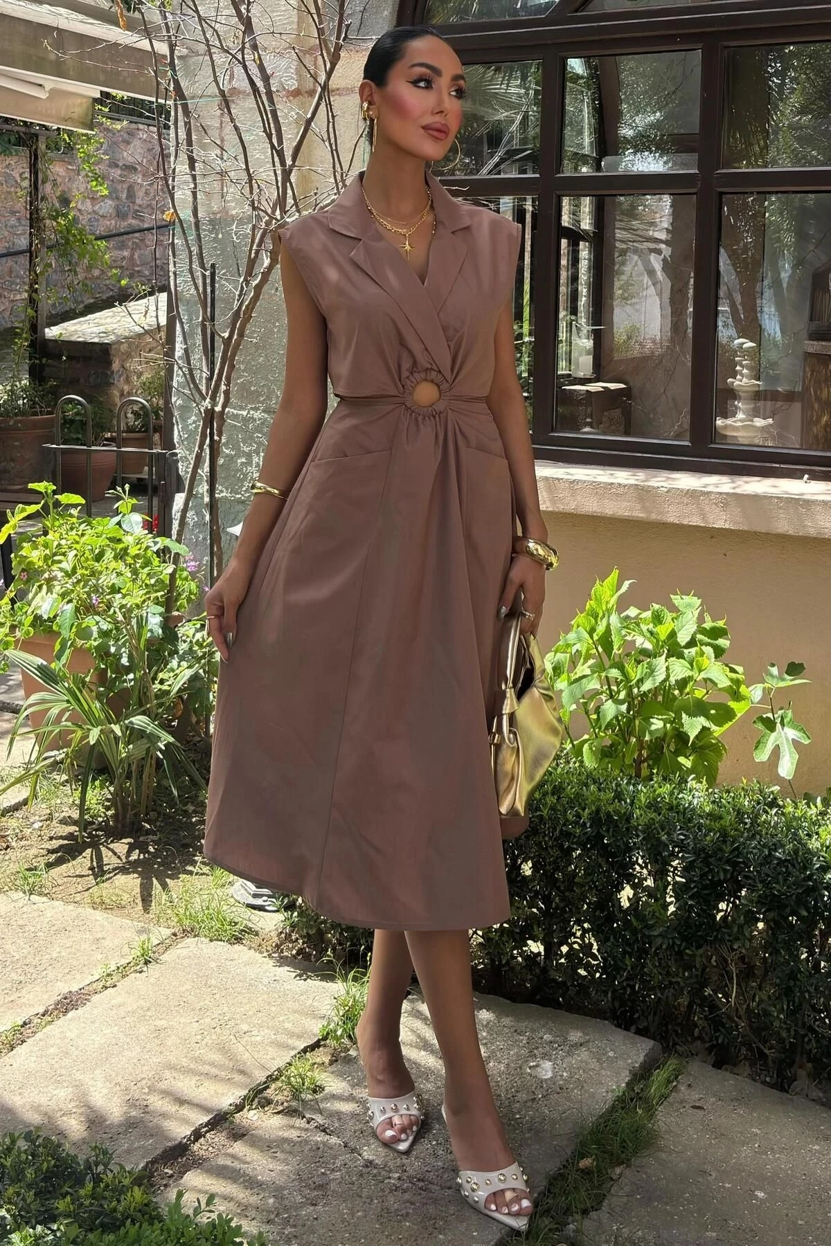 Kadın Kahverengi Dakron Midi Kolsuz Ceket Yaka Elbise