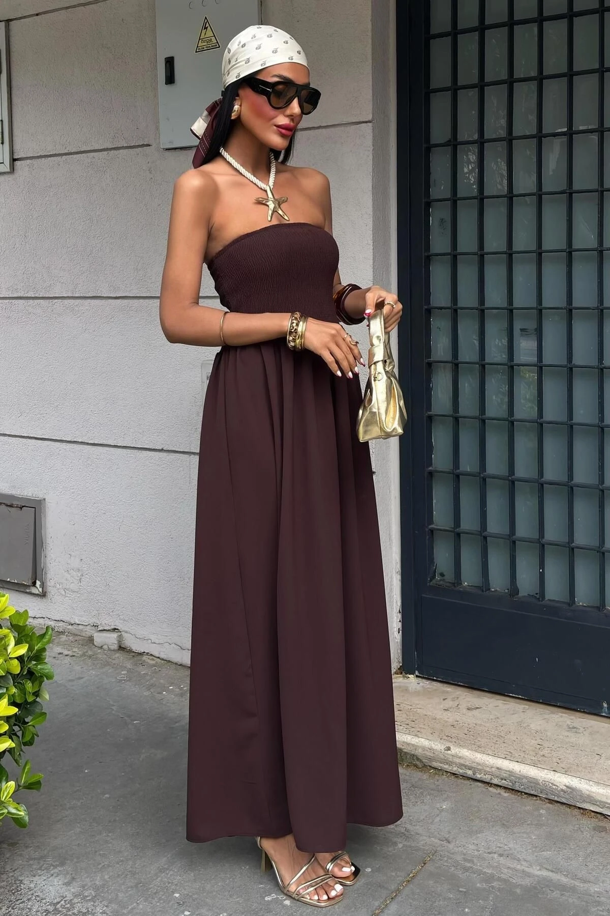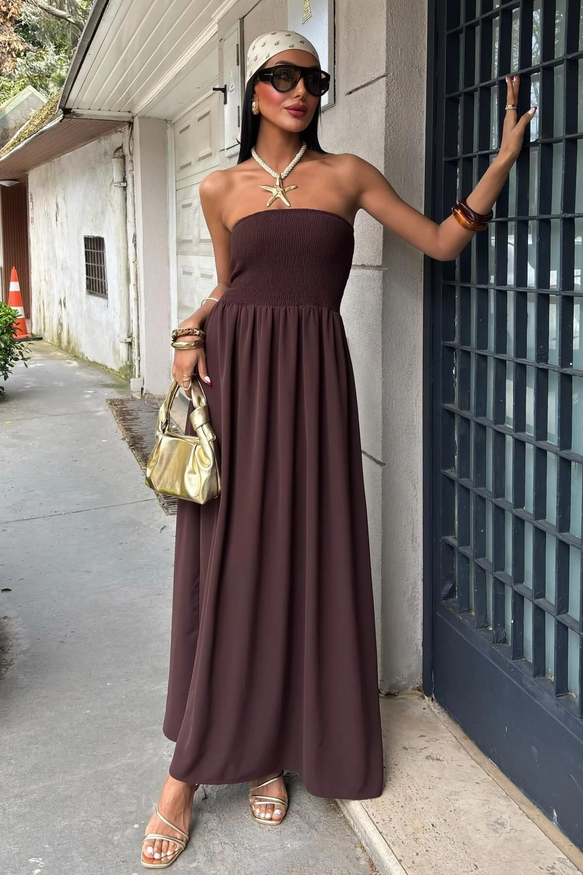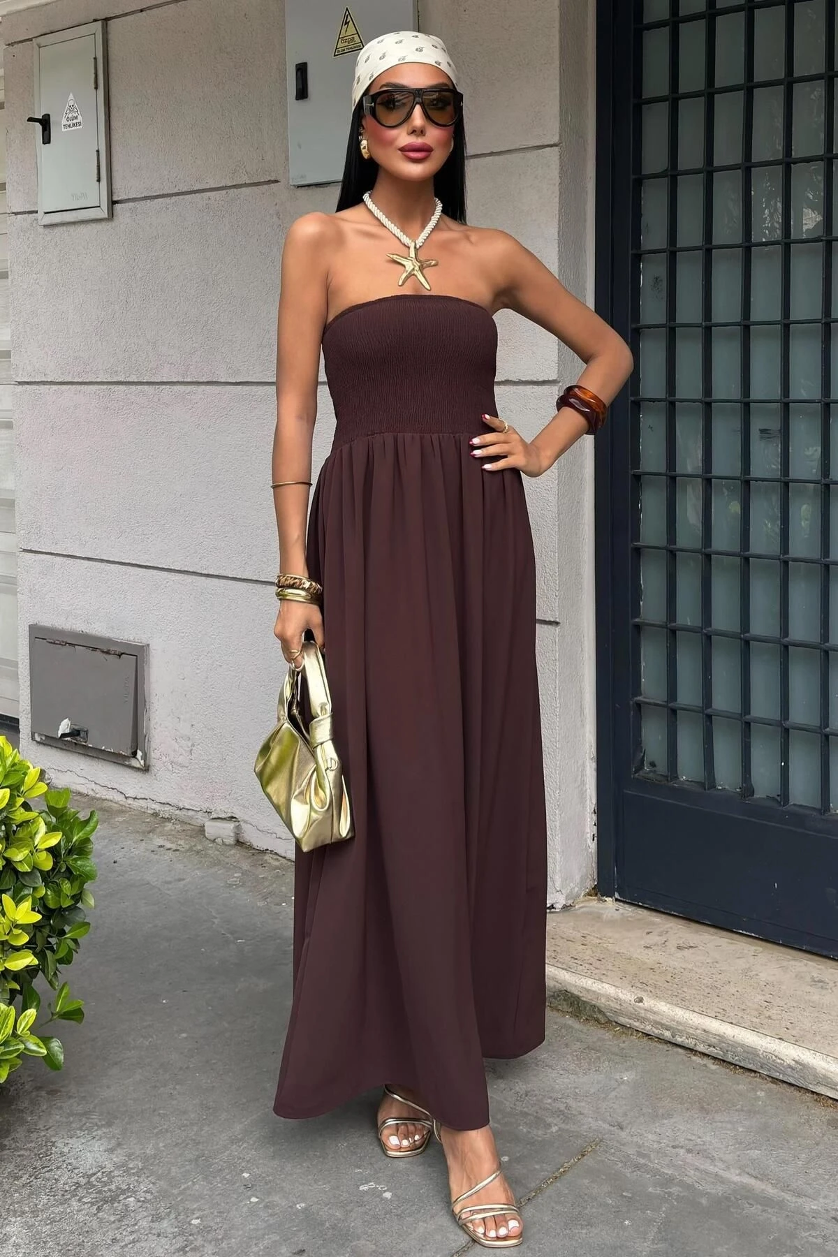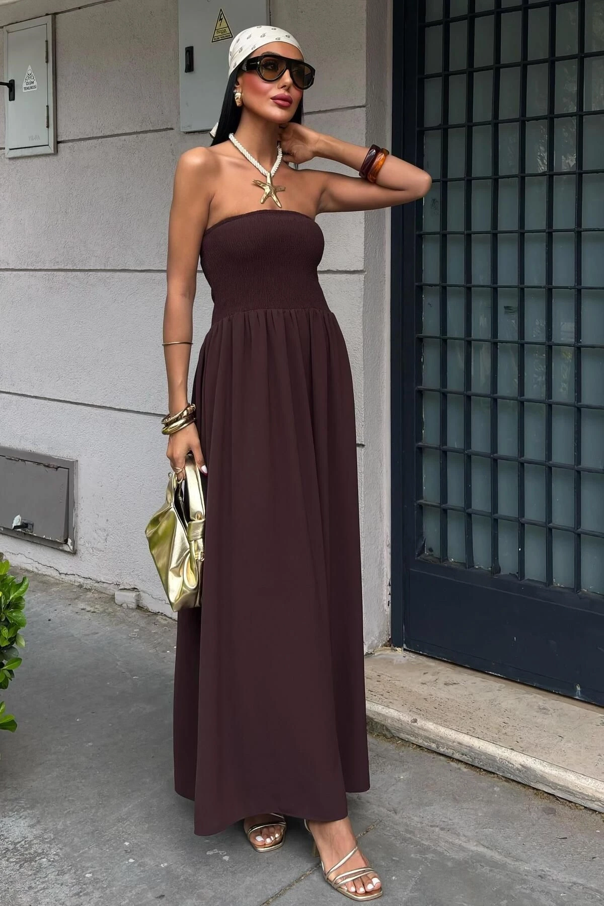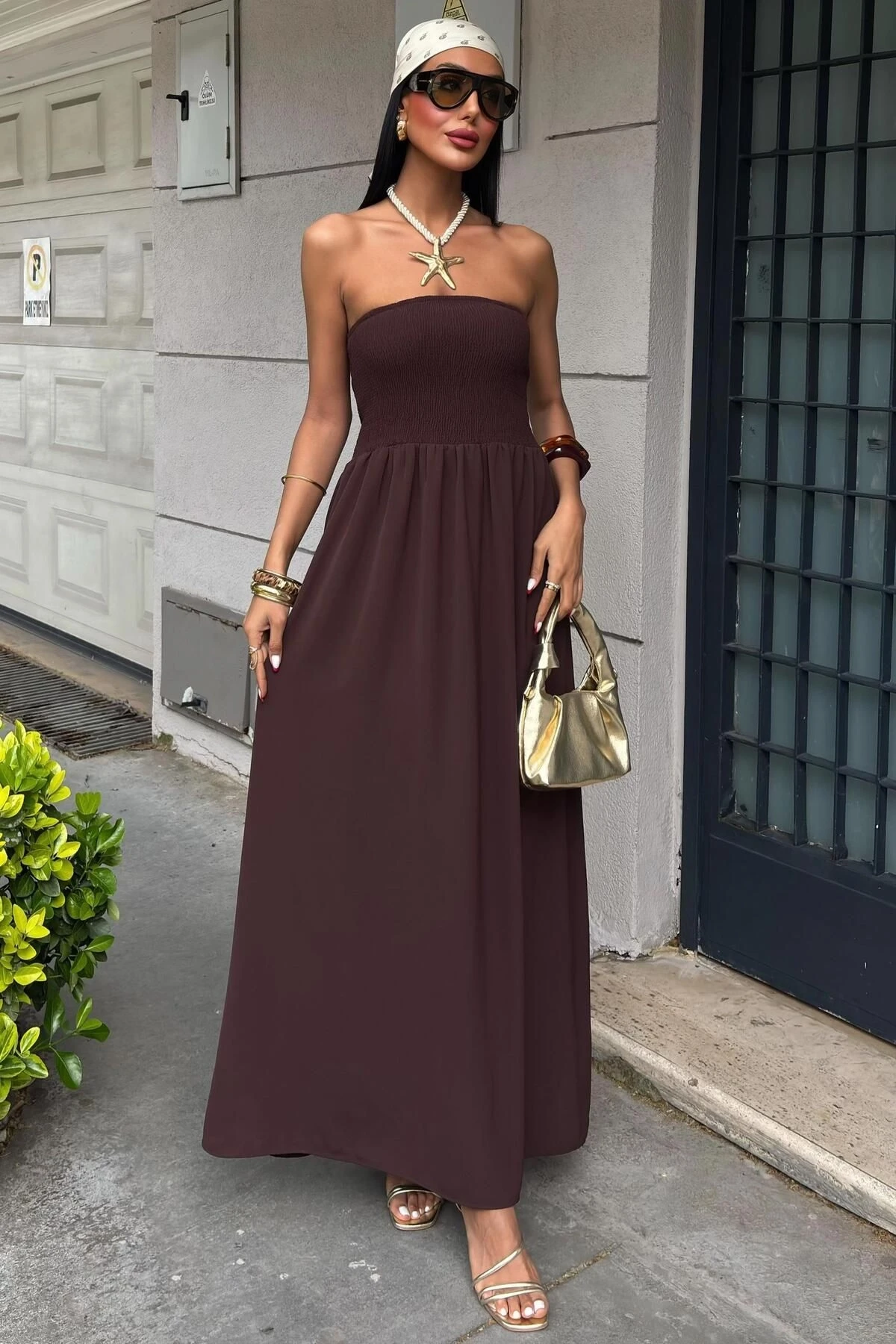 Kadın Kahverengi Gipeli Straplez Düz Kolsuz Elbise