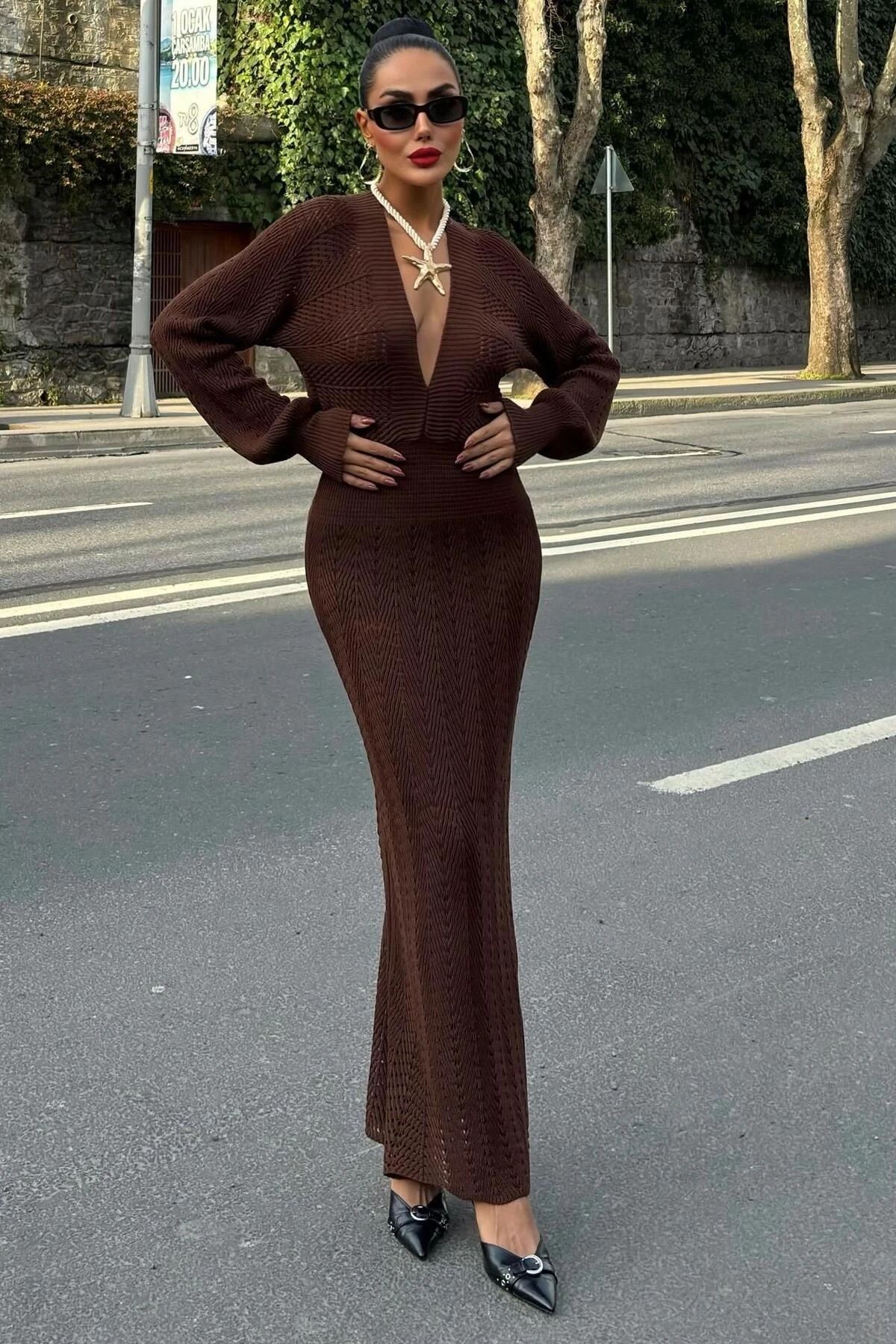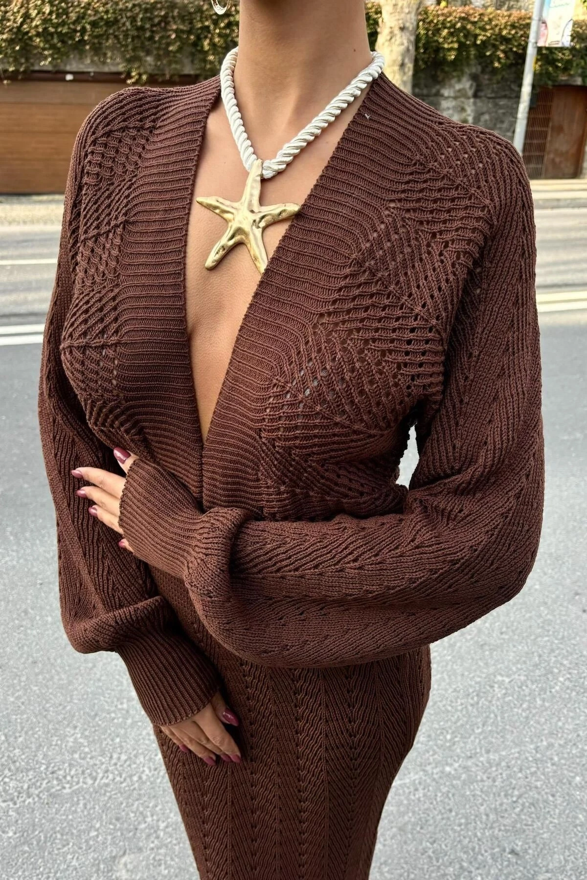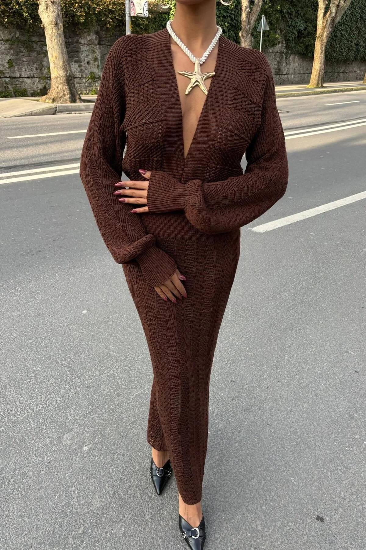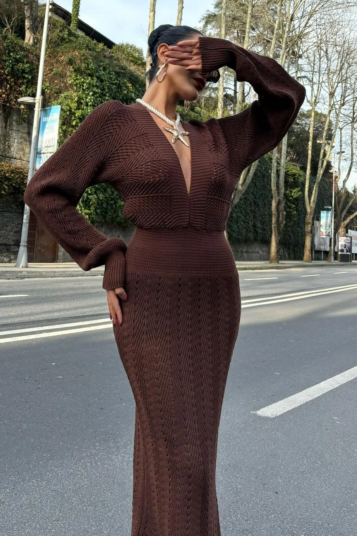 Kadın Kahverengi Örme Çizgili Uzun V Yaka Elbise