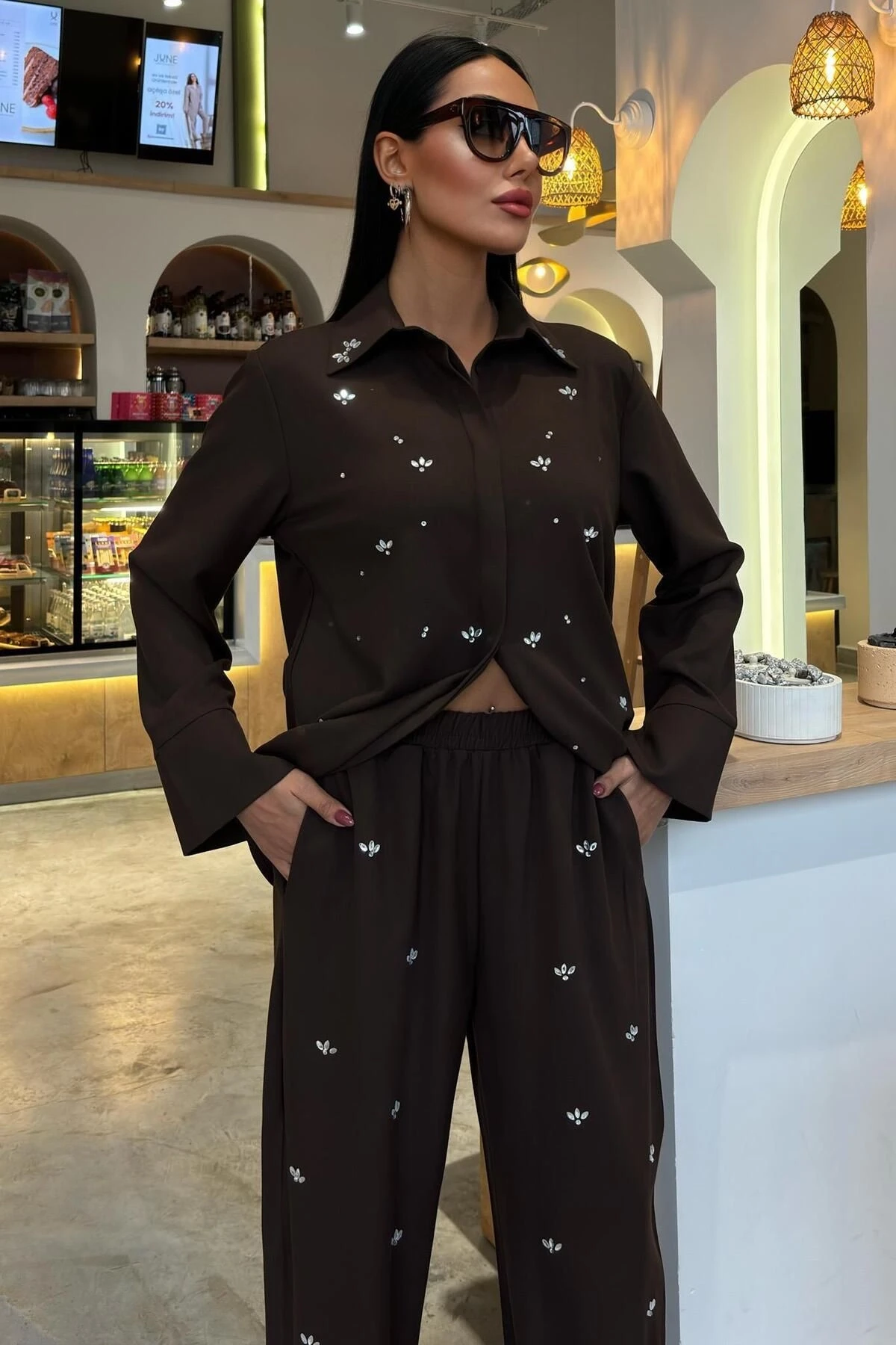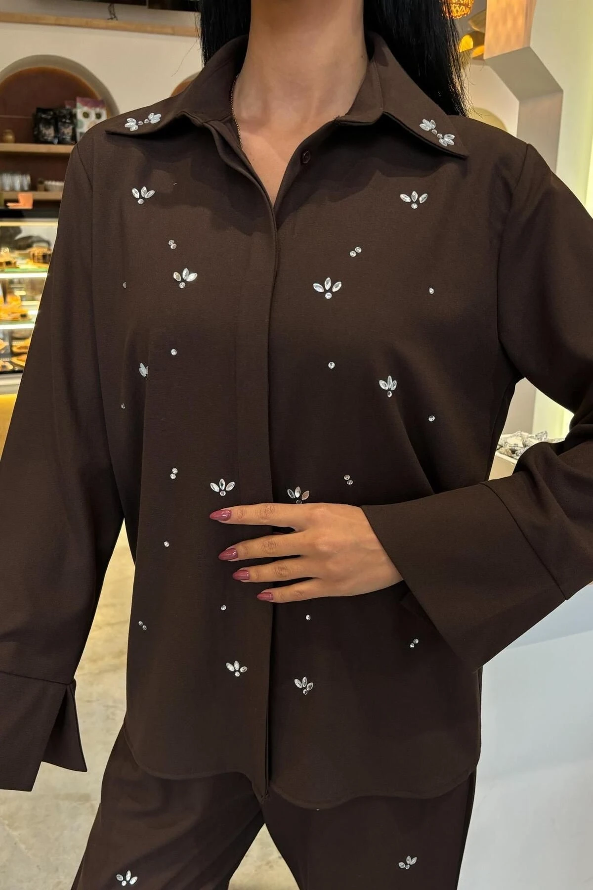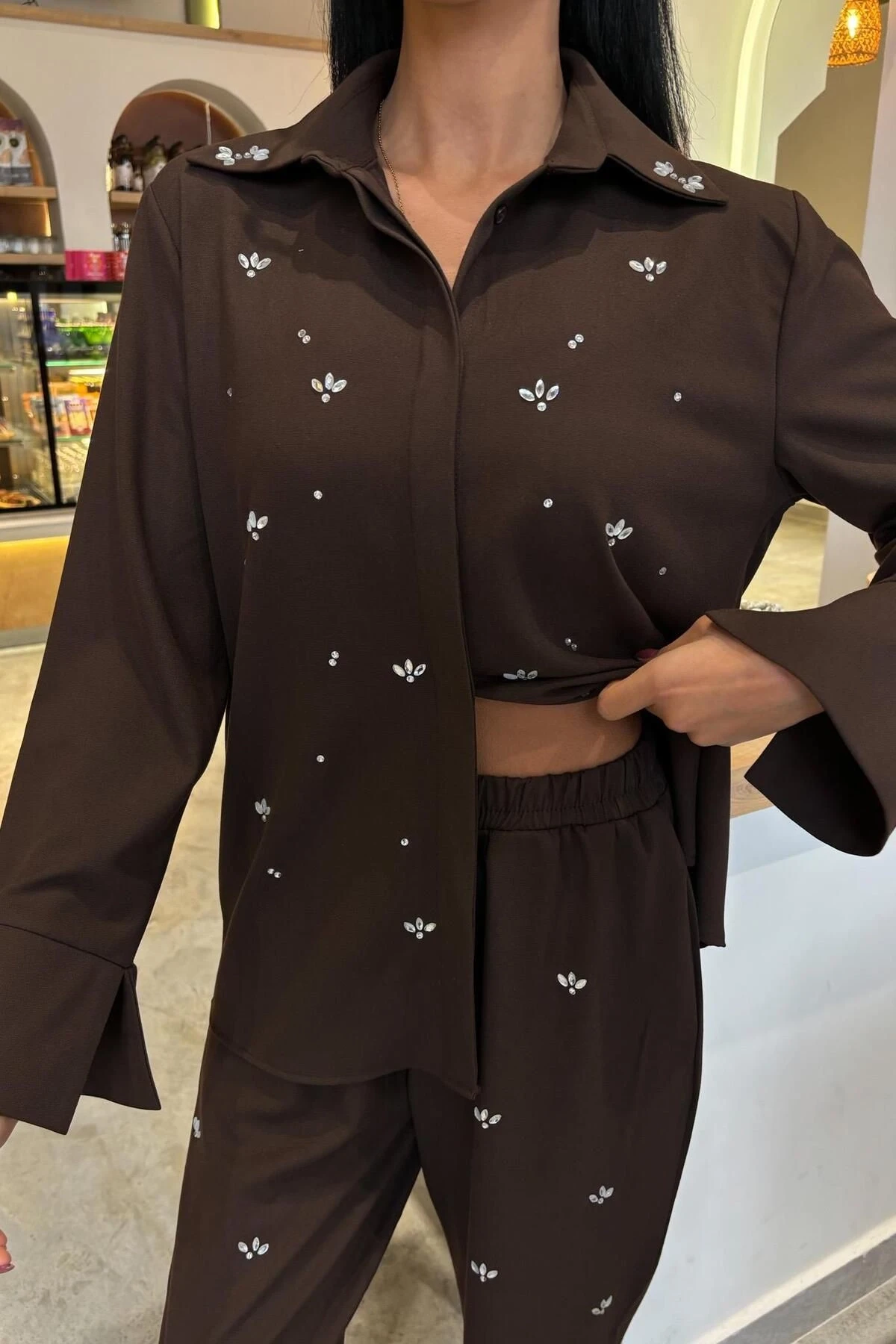 Kadın Kahverengi Poliviskon Taş Baskılı Uzun Kollu Takım