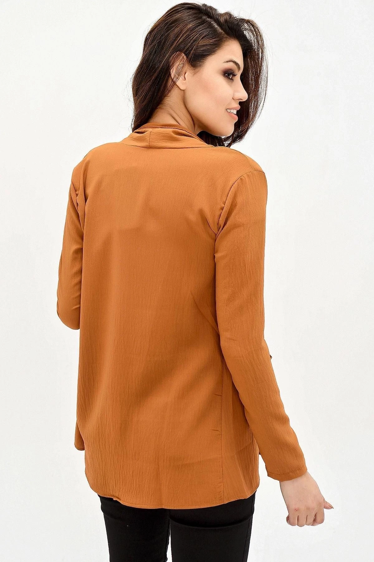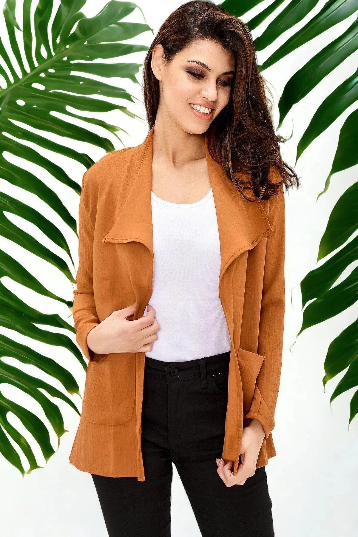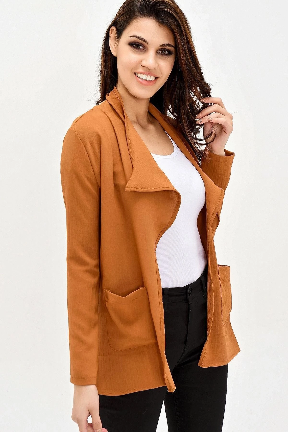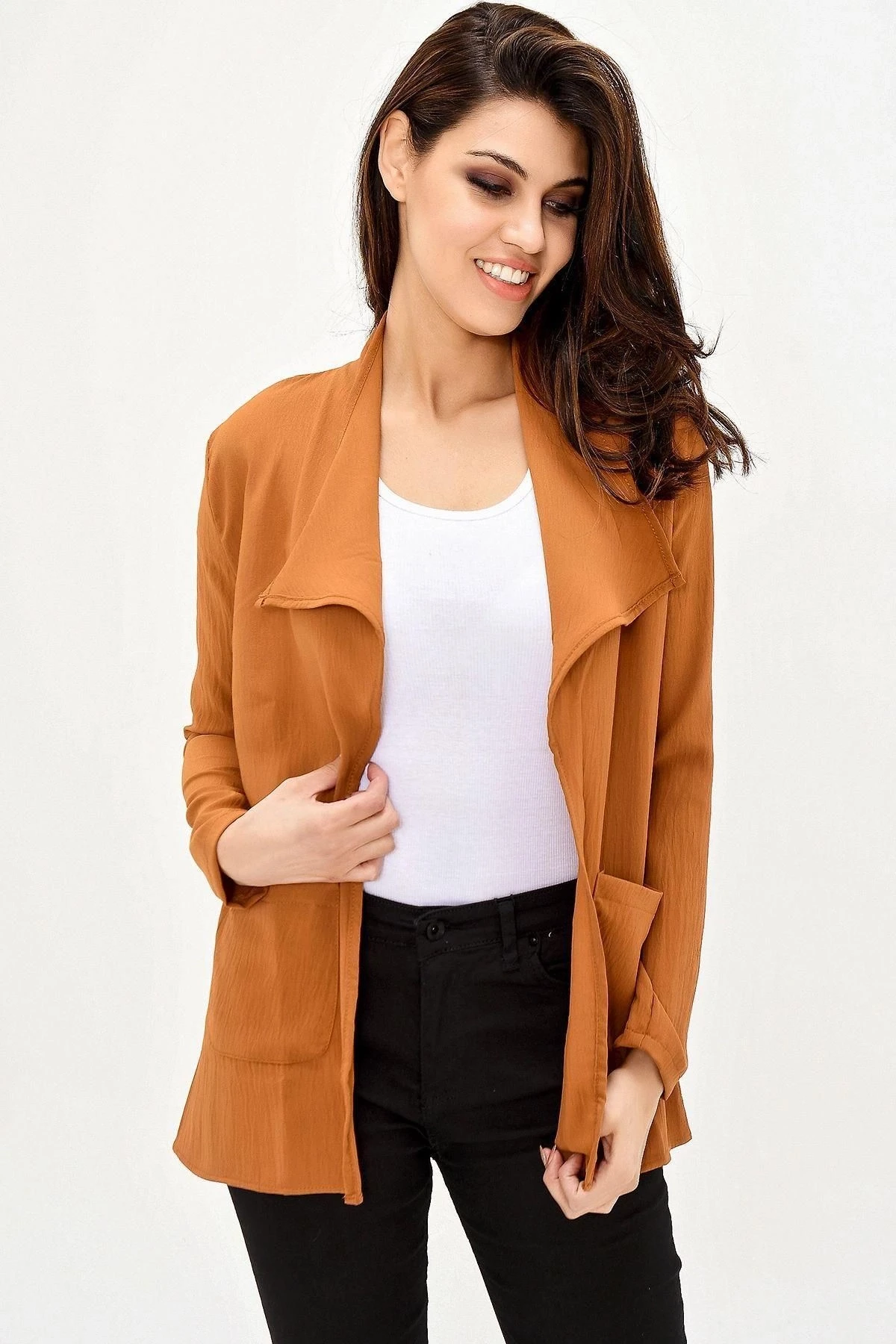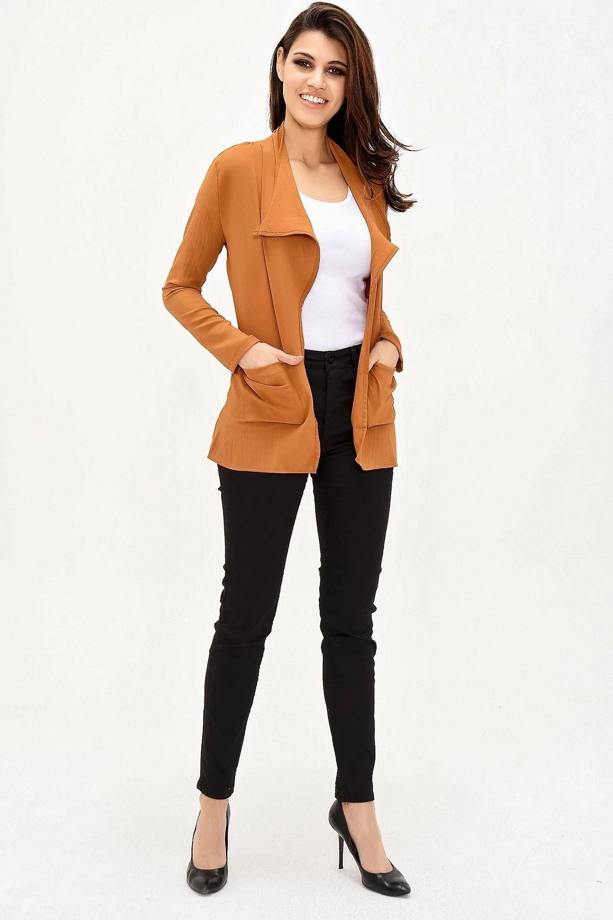 Kadın Kahverengi Şal Yaka, Uzun Kol Cep Detaylı, Regular Kesim Ceket Standart Boy - Tesettüre Uygun