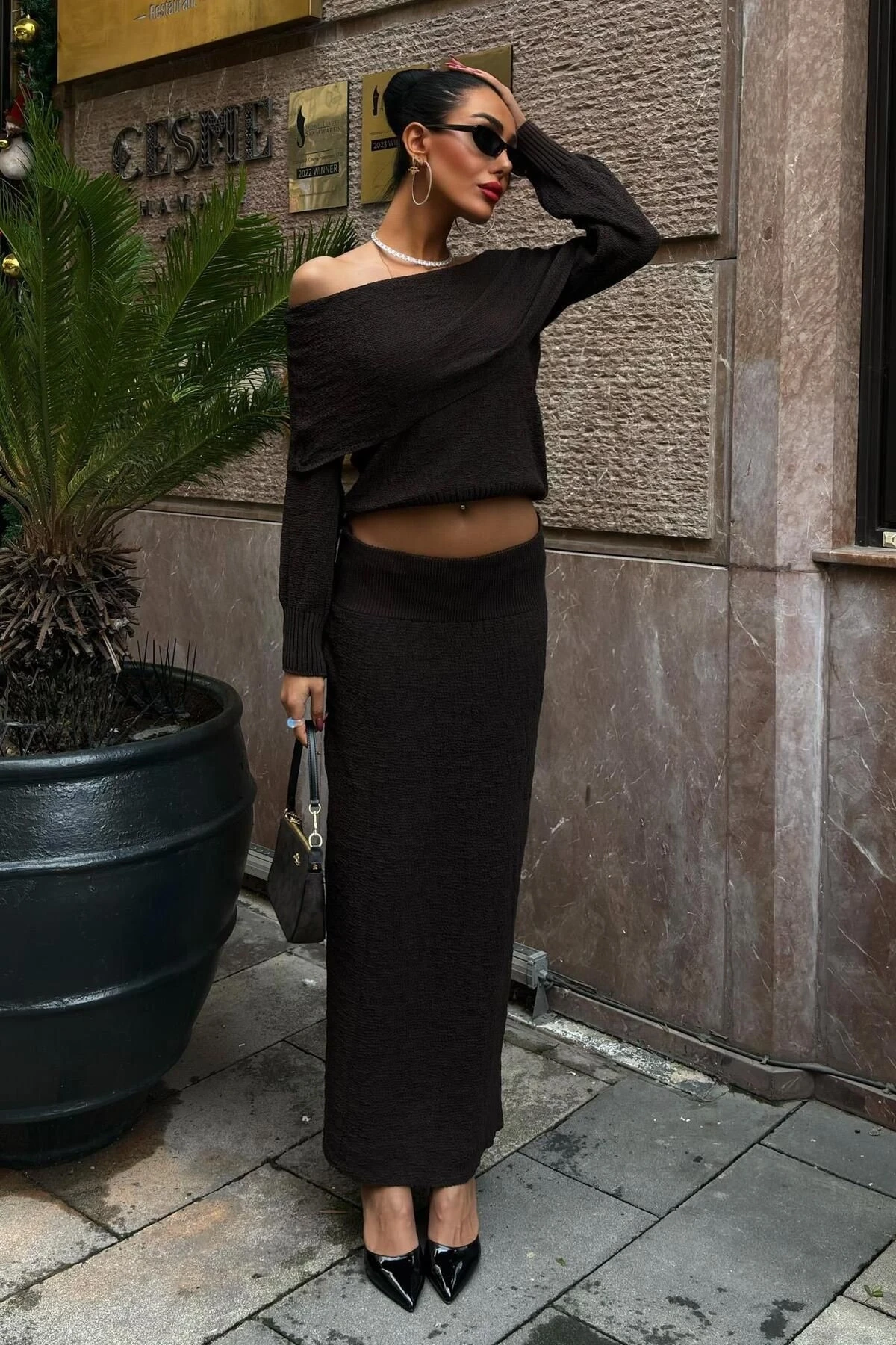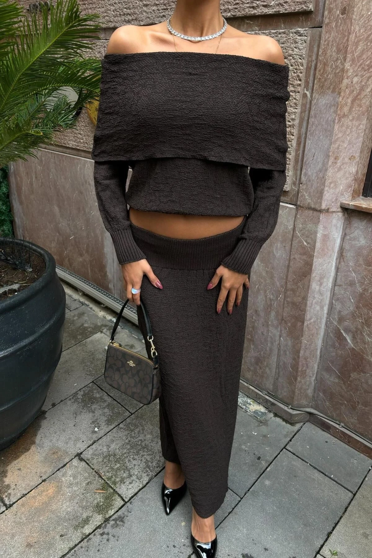 Kadın Kahverengi Triko Uzun Kollu Kayık Yaka Takım