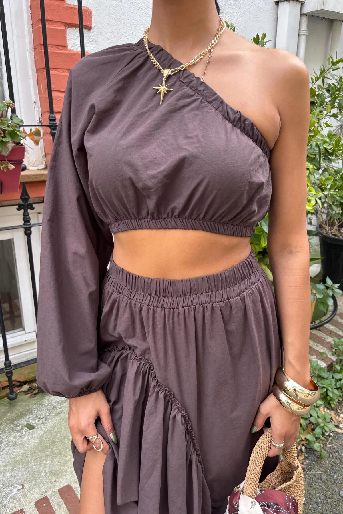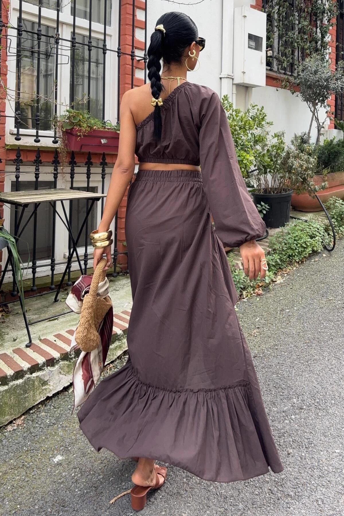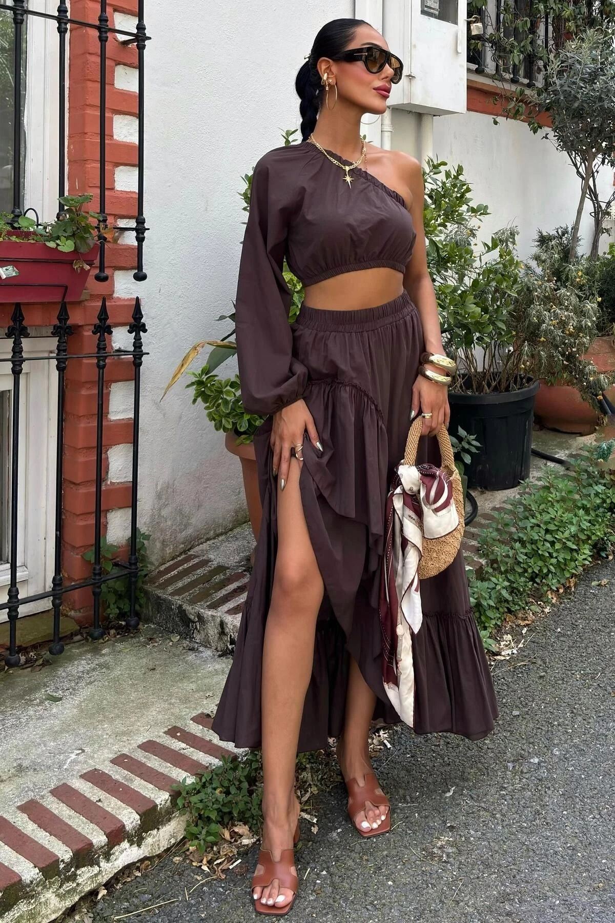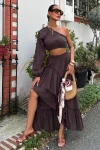 Kadın Kahverengi Wual Tek Omuz Uzun Asimetrik Takım
