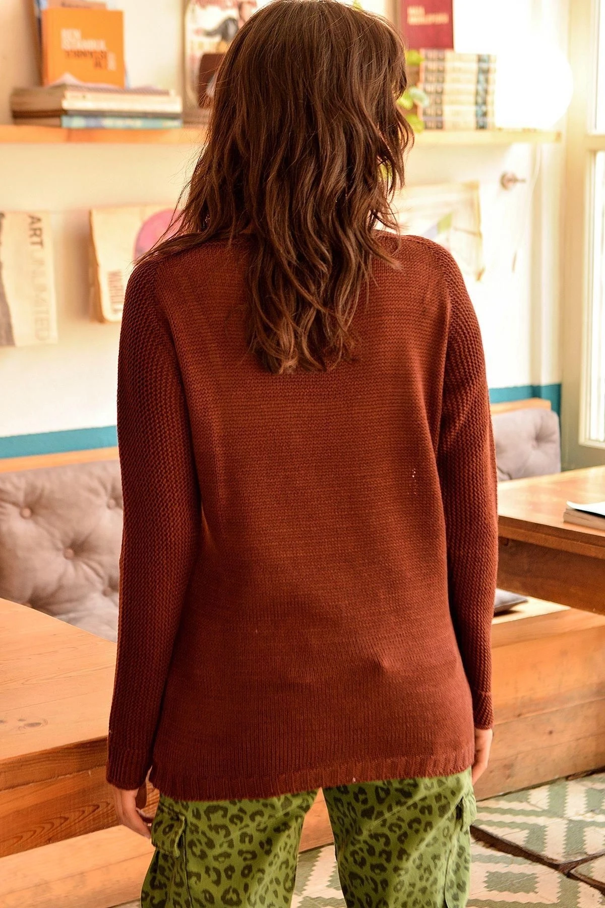 Kadın Kahverengi Yuvarlak Yaka, Uzun Kol, Delikli, , Düz Kesim, Standart Boy Triko