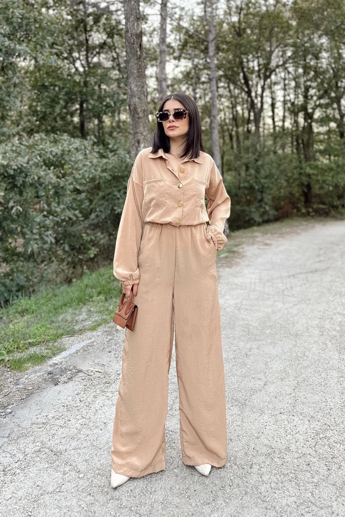 Kadın Karamel Uzun Kol, Gömlek Yaka, Beli Lastikli, 4 Cepli, Bilekleri Lastikli, Salaş Tulum