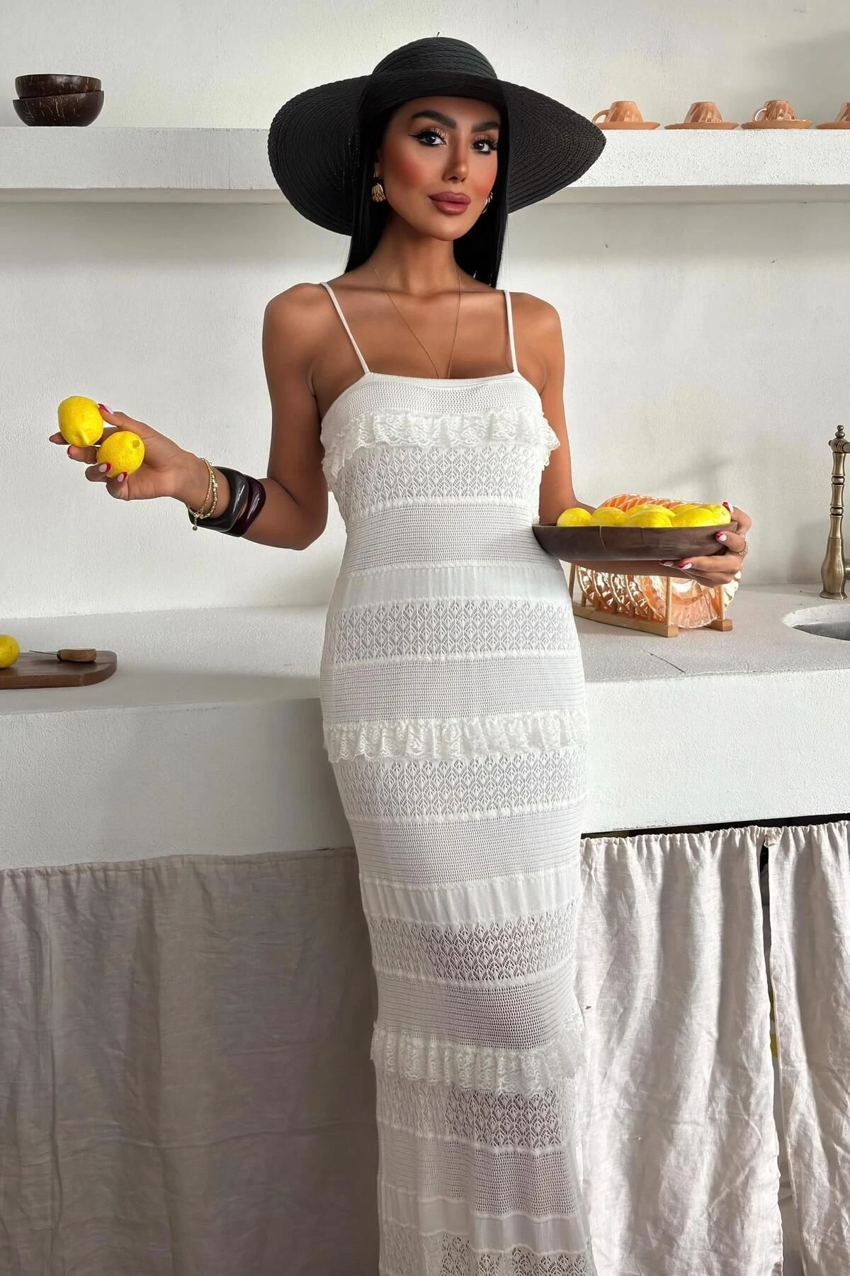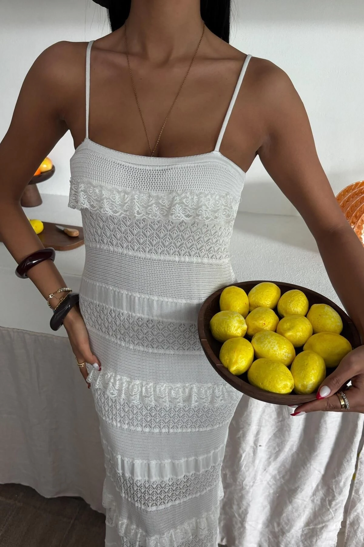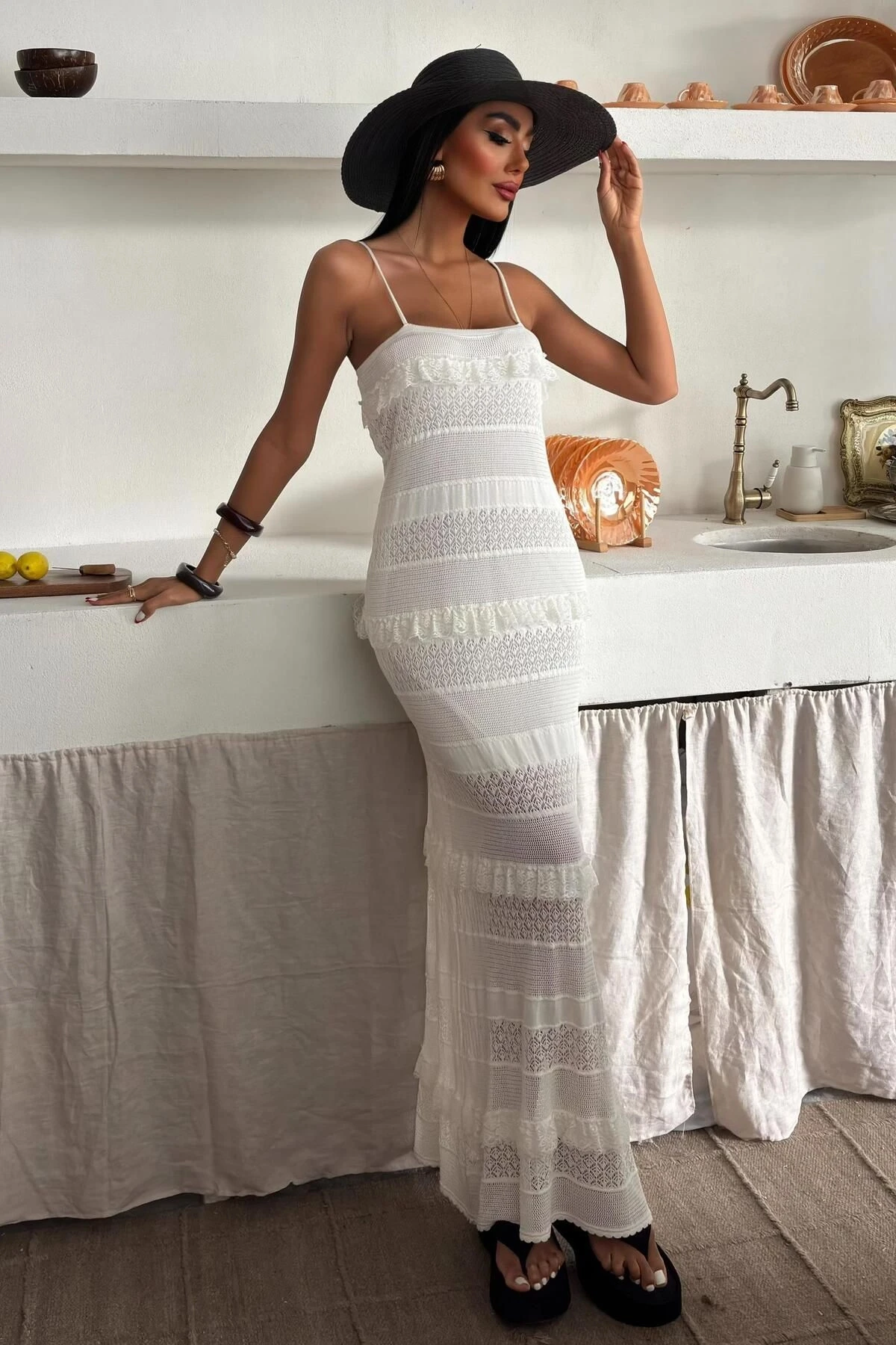 Kadın Kemik Renk Askılı Dantel Detay Uzun Elbise