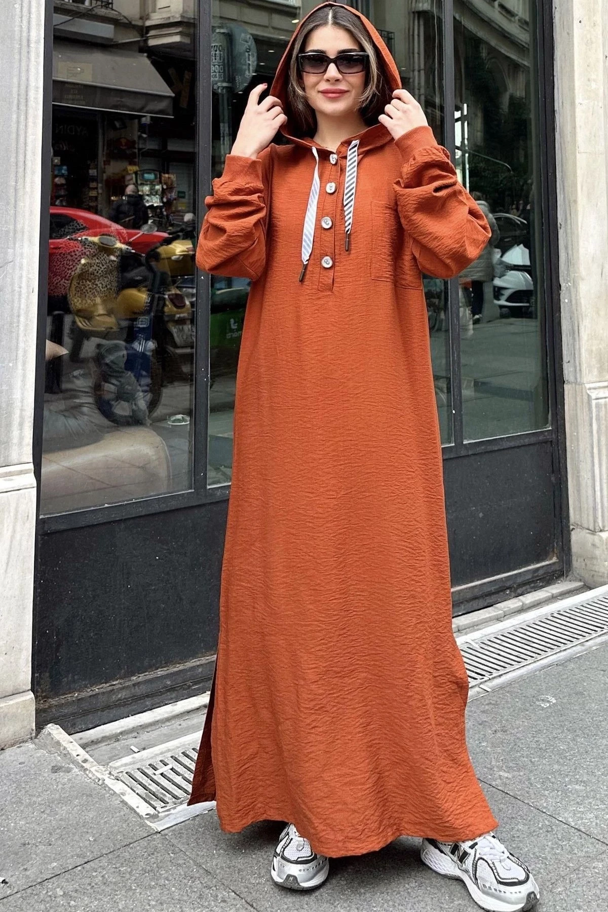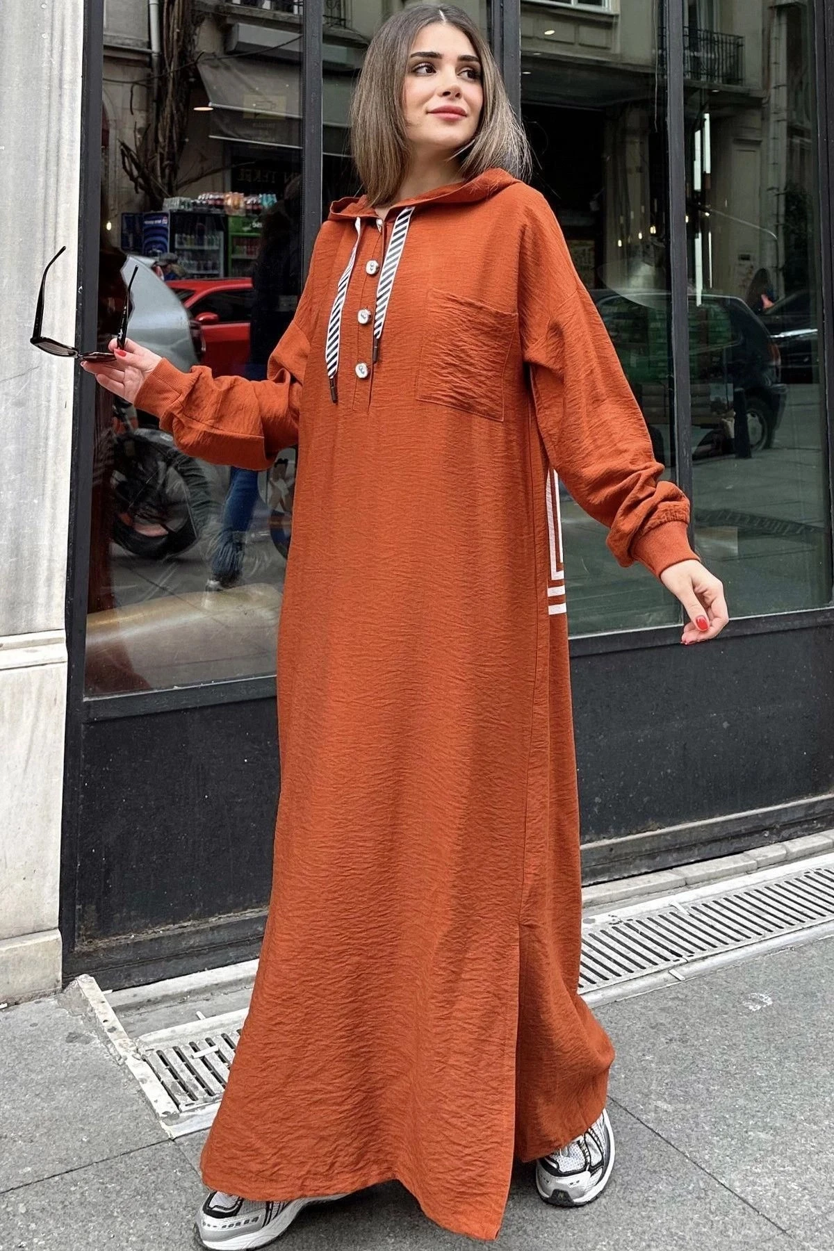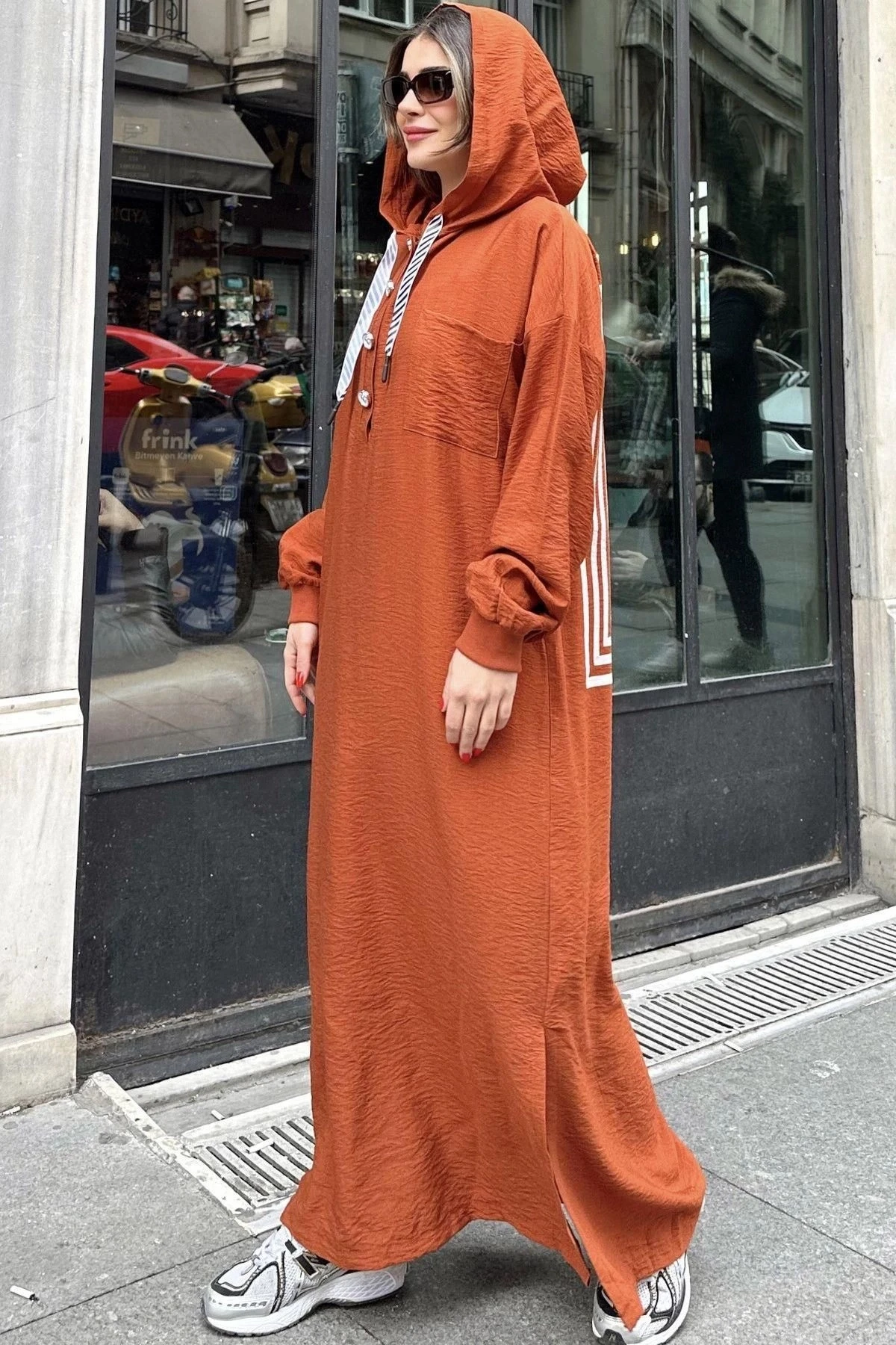 Kadın Kiremit Arkası Digital-Art Baskı, Yırtmaçlı, Kapüşonlu Uzun Keten Elbise