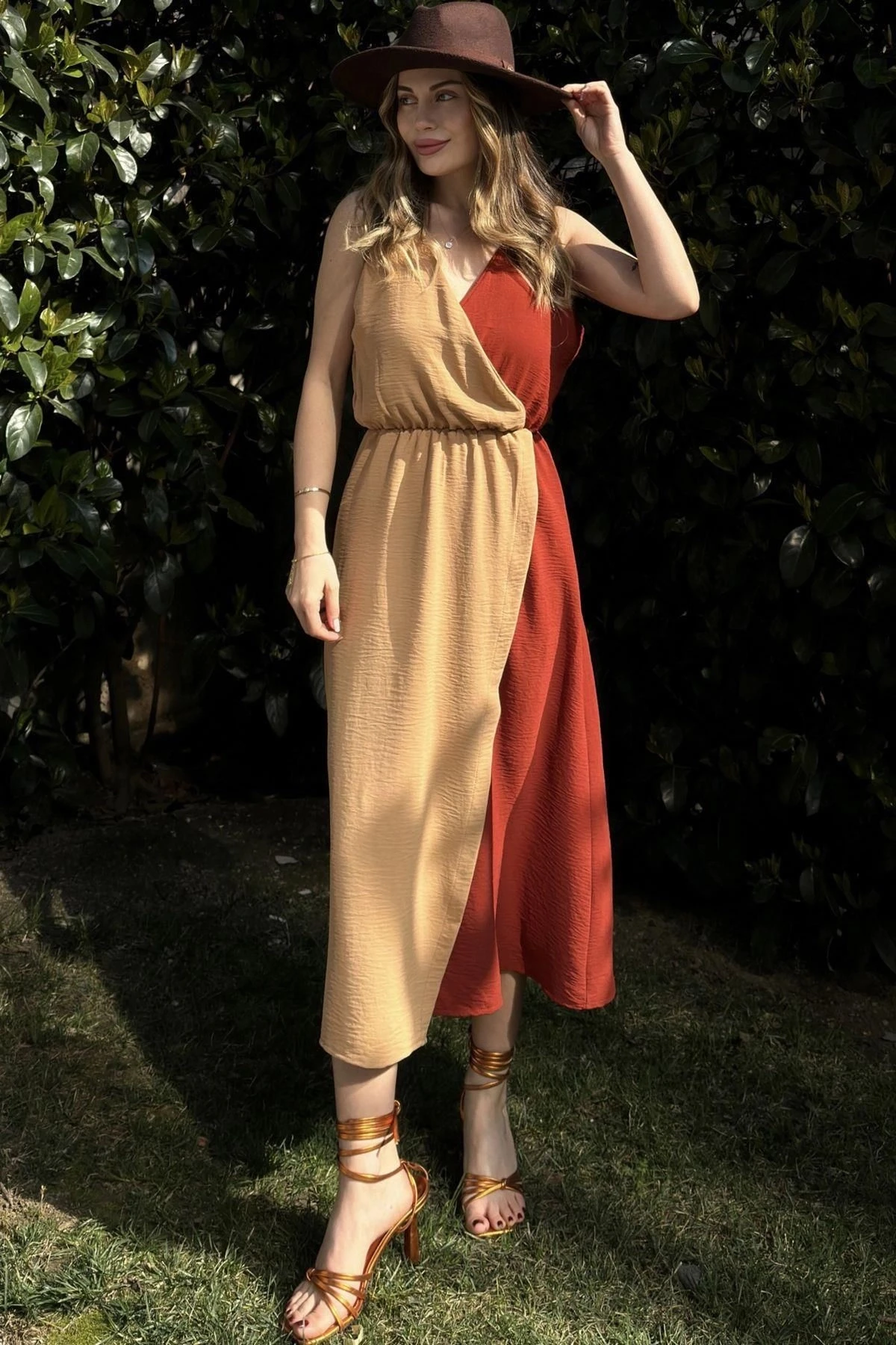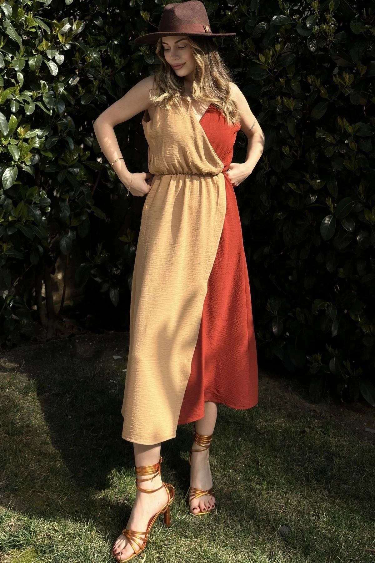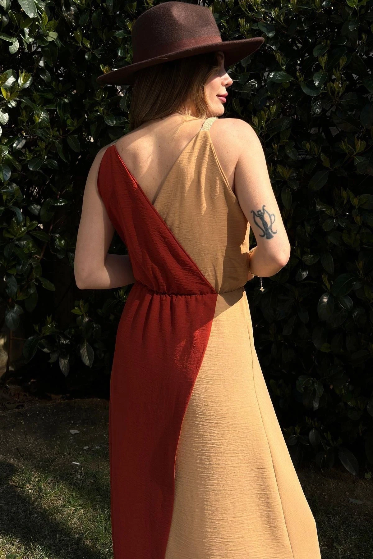 Kadın Kiremit & Bej Color Block Kruvaze, Hasır Askı Detaylı, Yırtmaçlı, Uzun Airobin Elbise