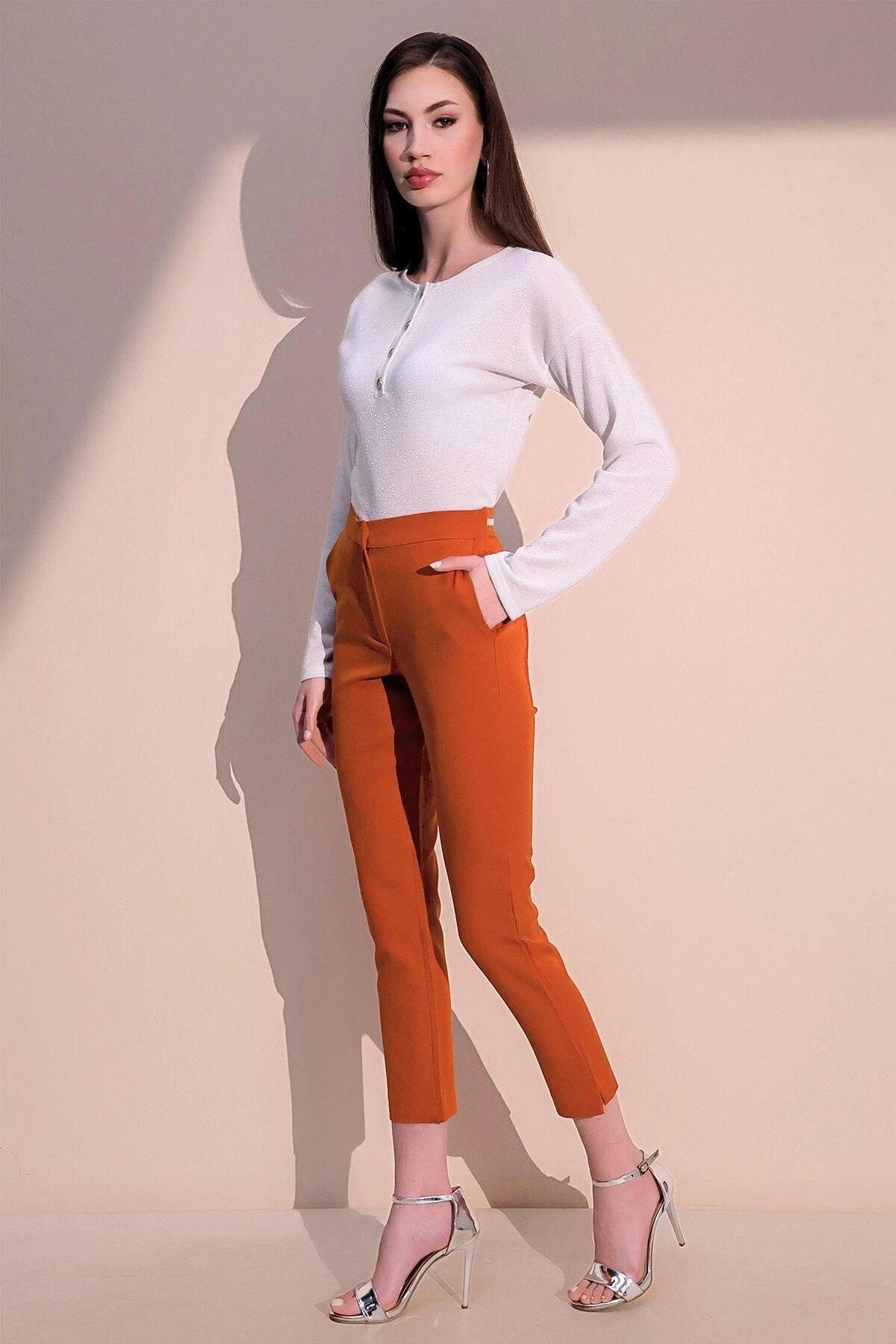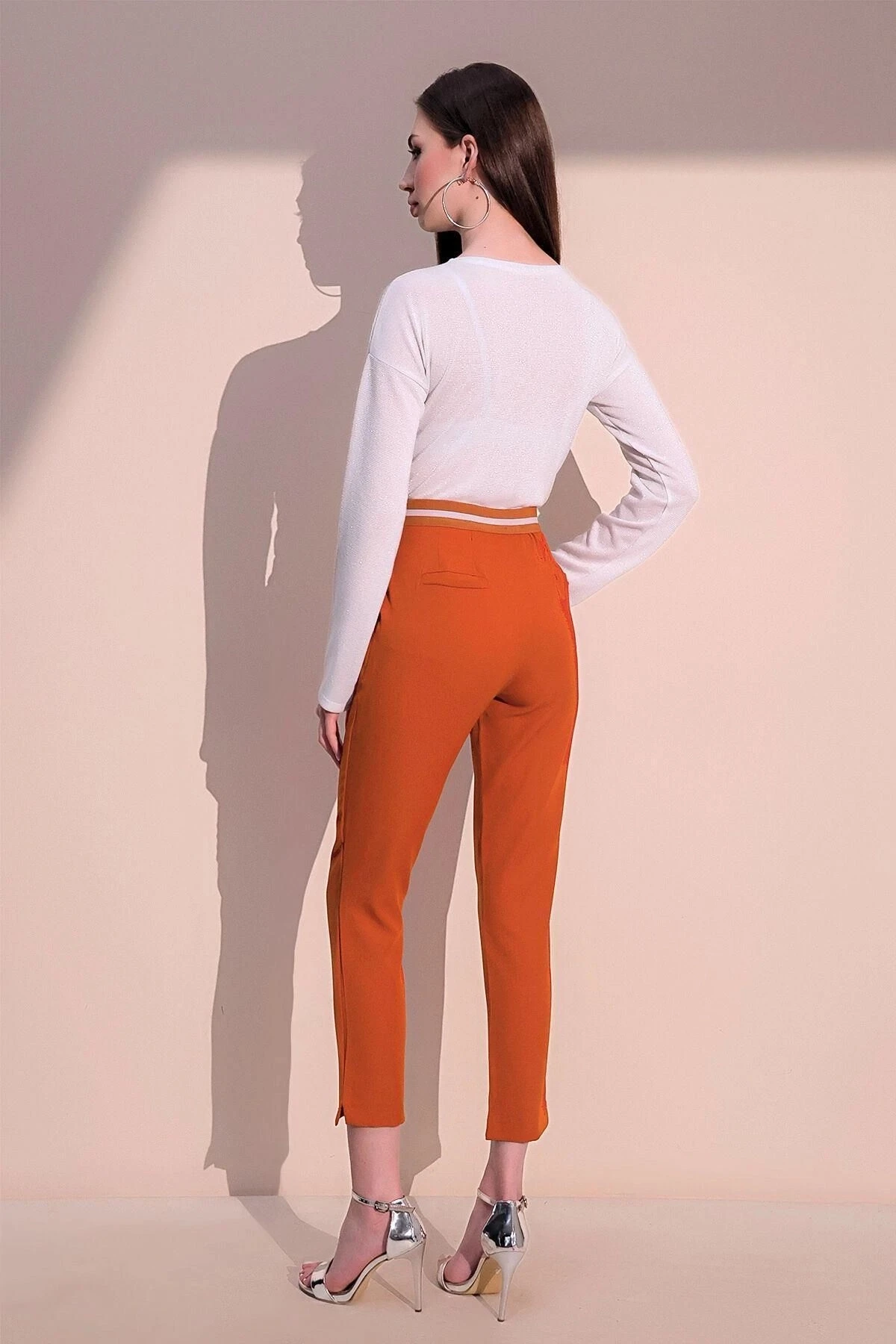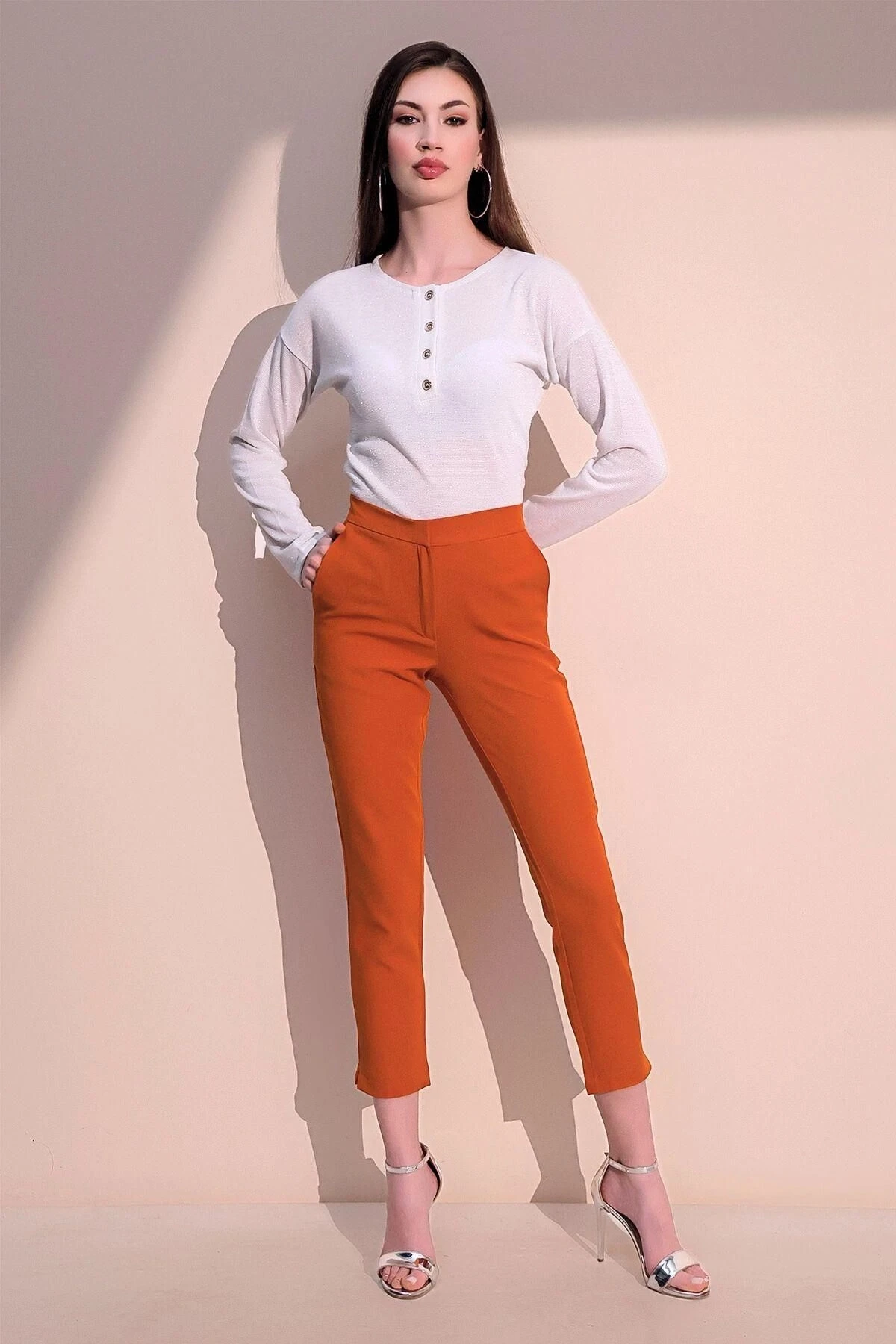 Bu kiremit renk beli lastikli şerit detaylı arka ve yan cepli kalem pantolon, şık ve pratik bir seçenektir.; Ürünün kumaş içeriği %60 polyester ve %40 pamuk olarak tasarlanmıştır, böylece rahatlık ve dayanıklılık sunar.; Bu pantolonun kumaşı, polyester ve pamuğun mükemmel bir kombinasyonunu sunar.; Polyester, pantolonun dayanıklılığını artırırken, pamuk ise yumuşaklık ve nefes alabilirlik sağlar.; Bu özellikler sayesinde, uzun süreli kullanımlarda bile konforunuzu koruyabilirsiniz.; Kiremit rengi, pantolonun şık ve modern bir görünüm kazanmasını sağlar.; Bu canlı ve çarpıcı renk, tarzınızı vurgulayan bir seçenek olarak öne çıkar.; Hem günlük giyimde hem de özel etkinliklerde rahatlıkla kullanabileceğiniz bir renk tercihidir.; Pantolonun bel kısmında bulunan lastikli şerit detayı, mükemmel bir uyum sağlamak için tasarlanmıştır.; Bu özellik sayesinde, pantolonu kolayca giyip çıkarabilir ve belinizde rahatlıkla oturmasını sağlayabilirsiniz.; Aynı zamanda belinizi sıkıca sararak şık bir görünüm elde etmenizi sağlar.; Arka ve yan cepli tasarım, kullanışlılık açısından büyük bir avantaj sağlar.; Eşyalarınızı kolaylıkla taşıyabileceğiniz cepler, pratik bir kullanım deneyimi sunar.; Anahtarlarınızı, cüzdanınızı veya diğer küçük eşyalarınızı güvenli bir şekilde saklayabilirsiniz.; Bu kalem pantolon, zarif ve şık bir tasarıma sahiptir.; İnce bir siluete sahip olması, vücudunuzu saran bir görünüm elde etmenizi sağlar.; Hem günlük giyimde hem de özel durumlarda şıklığınızı tamamlamak için mükemmel bir seçenektir.; Bu ürün, stil sahibi bireylerin gardırobunda önemli bir yer tutacak bir seçenektir.; Kumaş kalitesi, renk seçimi ve tasarım detaylarıyla öne çıkan bu pantolon, hem rahatlık hem de şıklık arayanlar için ideal bir tercihtir.