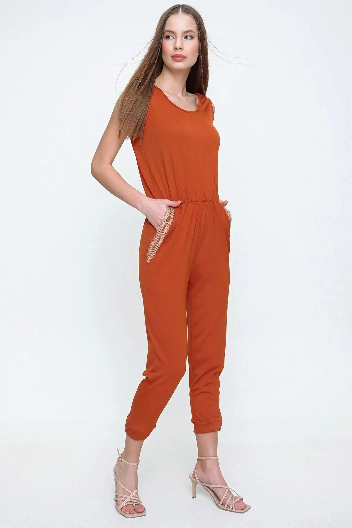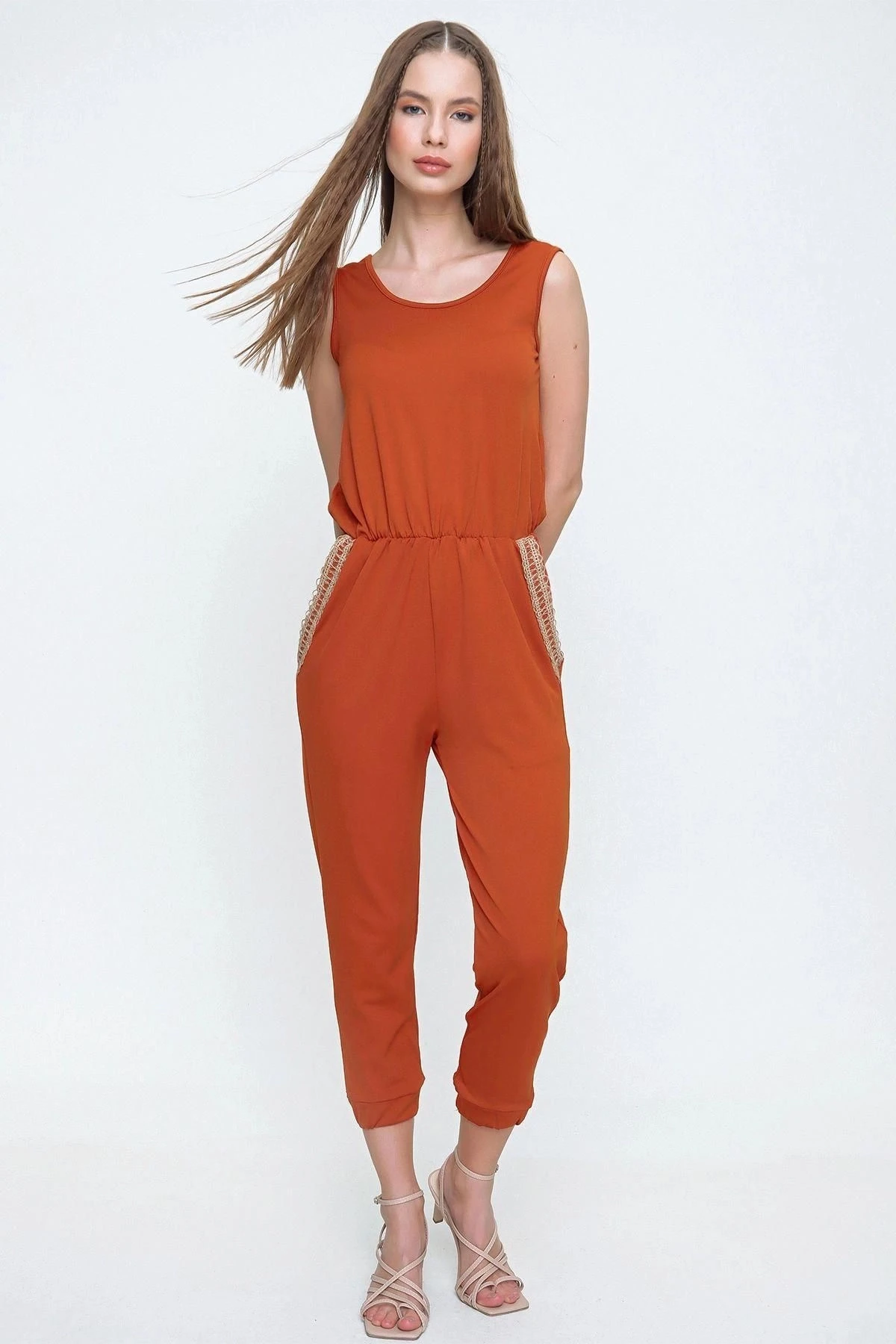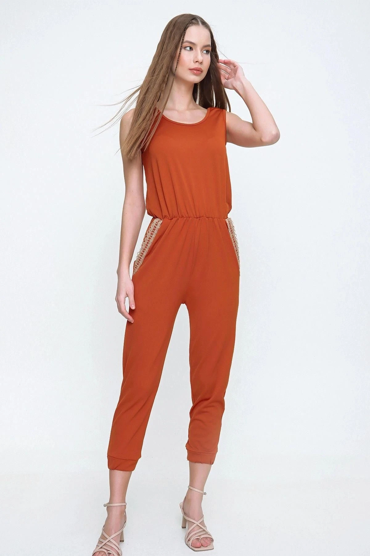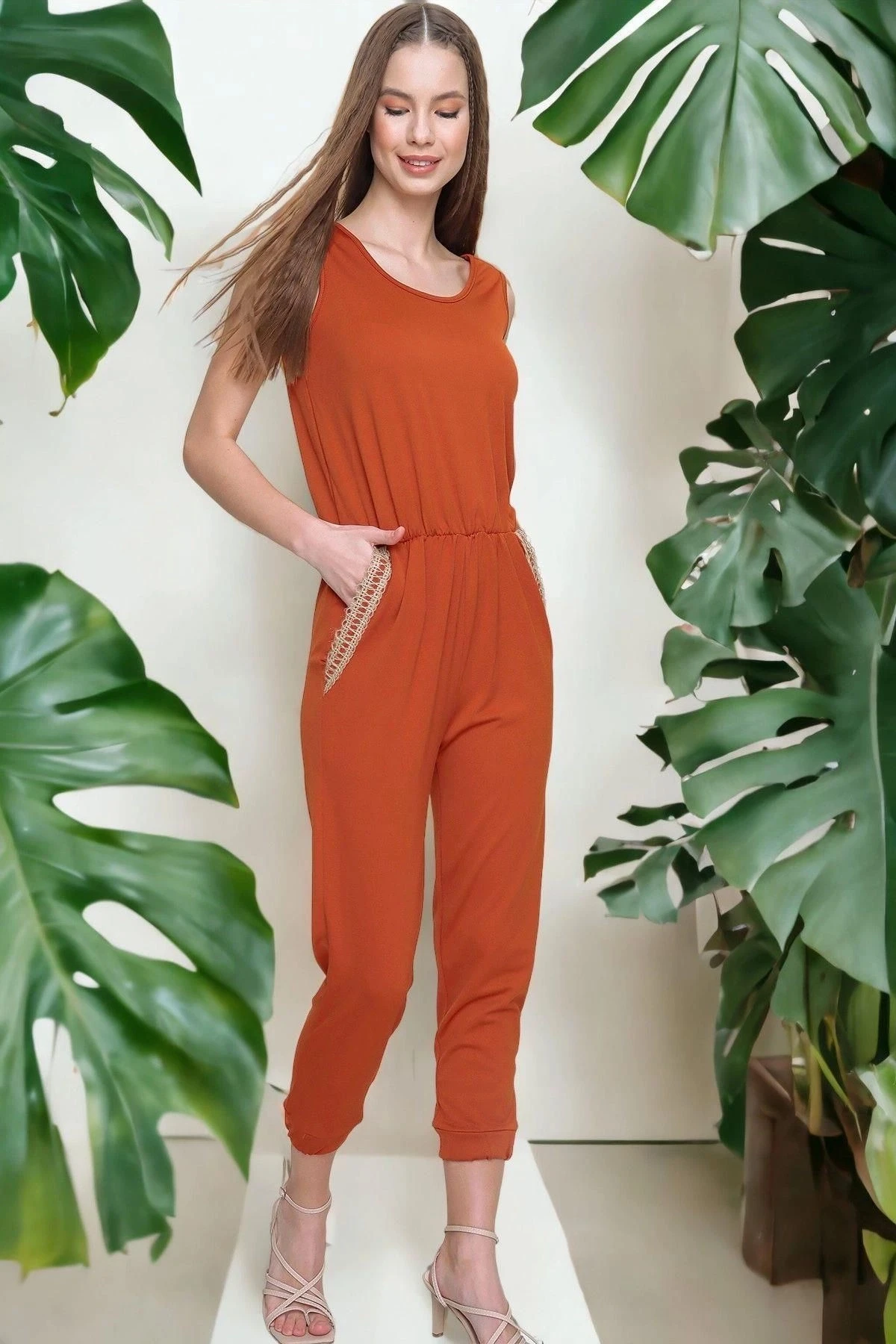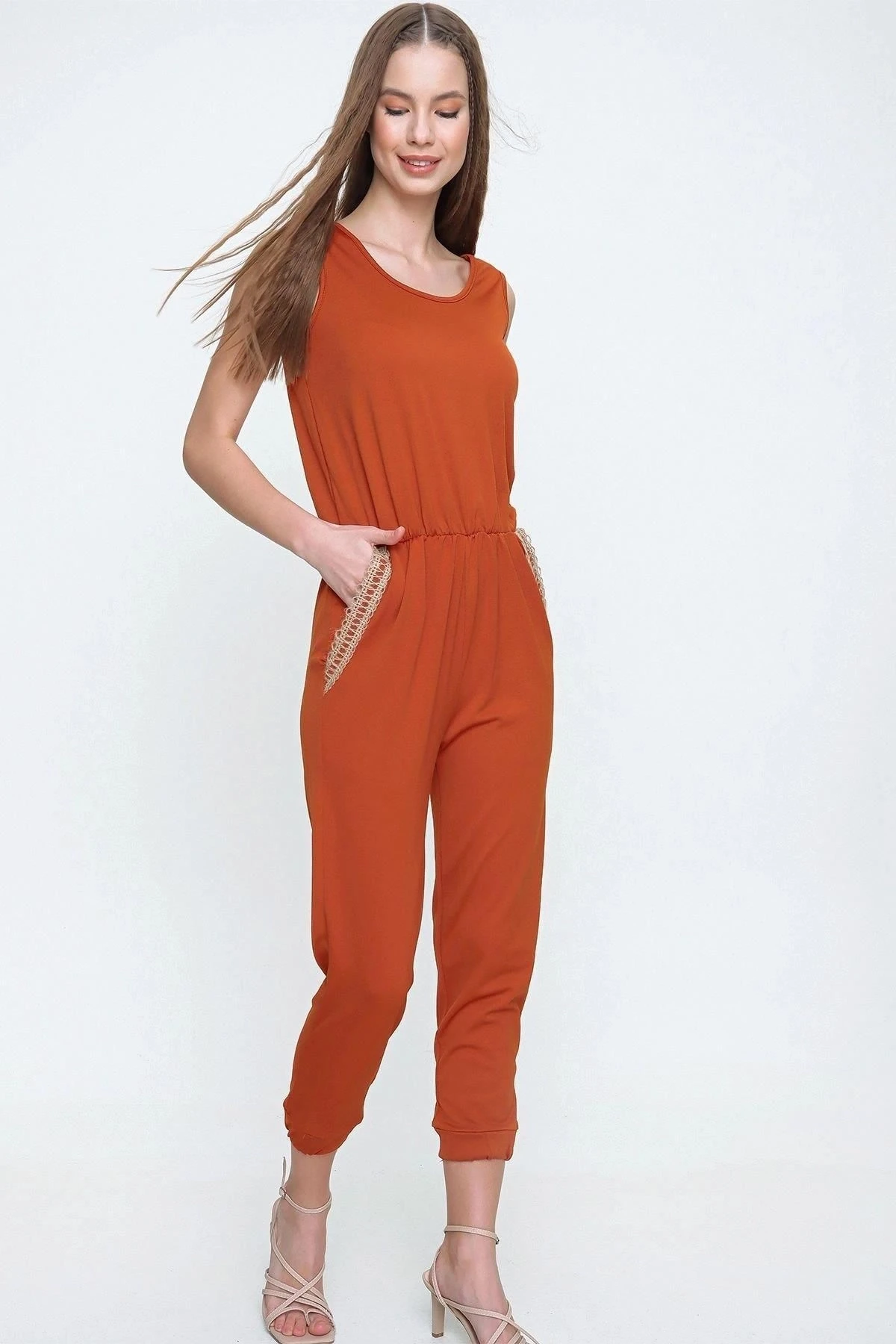 Kadın Kiremit Cebi Hasır Detaylı Beli ve Paçası Lastikli Kaliteli Kumaş Rahat Kesim Kısa Kol Tulum