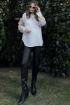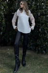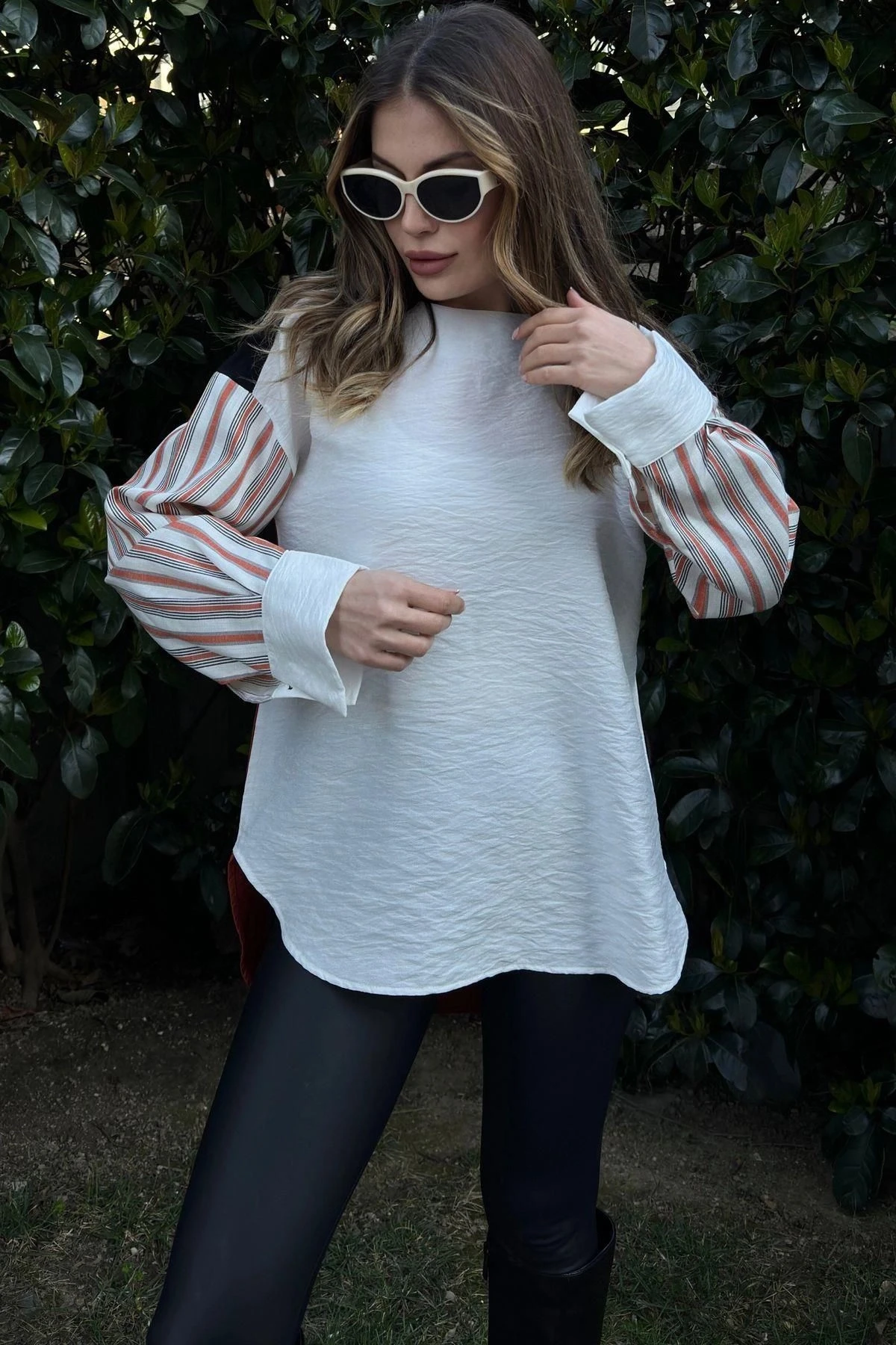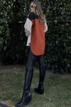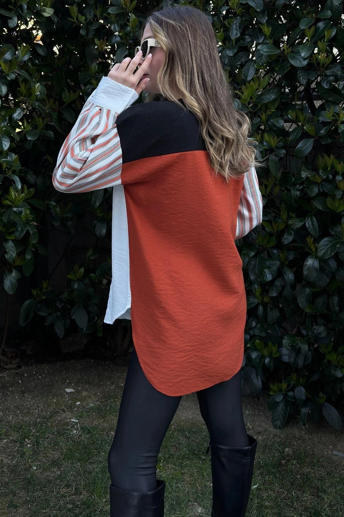Kadın Kiremit Color Block, Eteği Oval Kesim, Salaş Keten Bluz