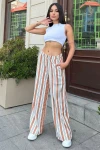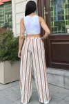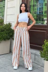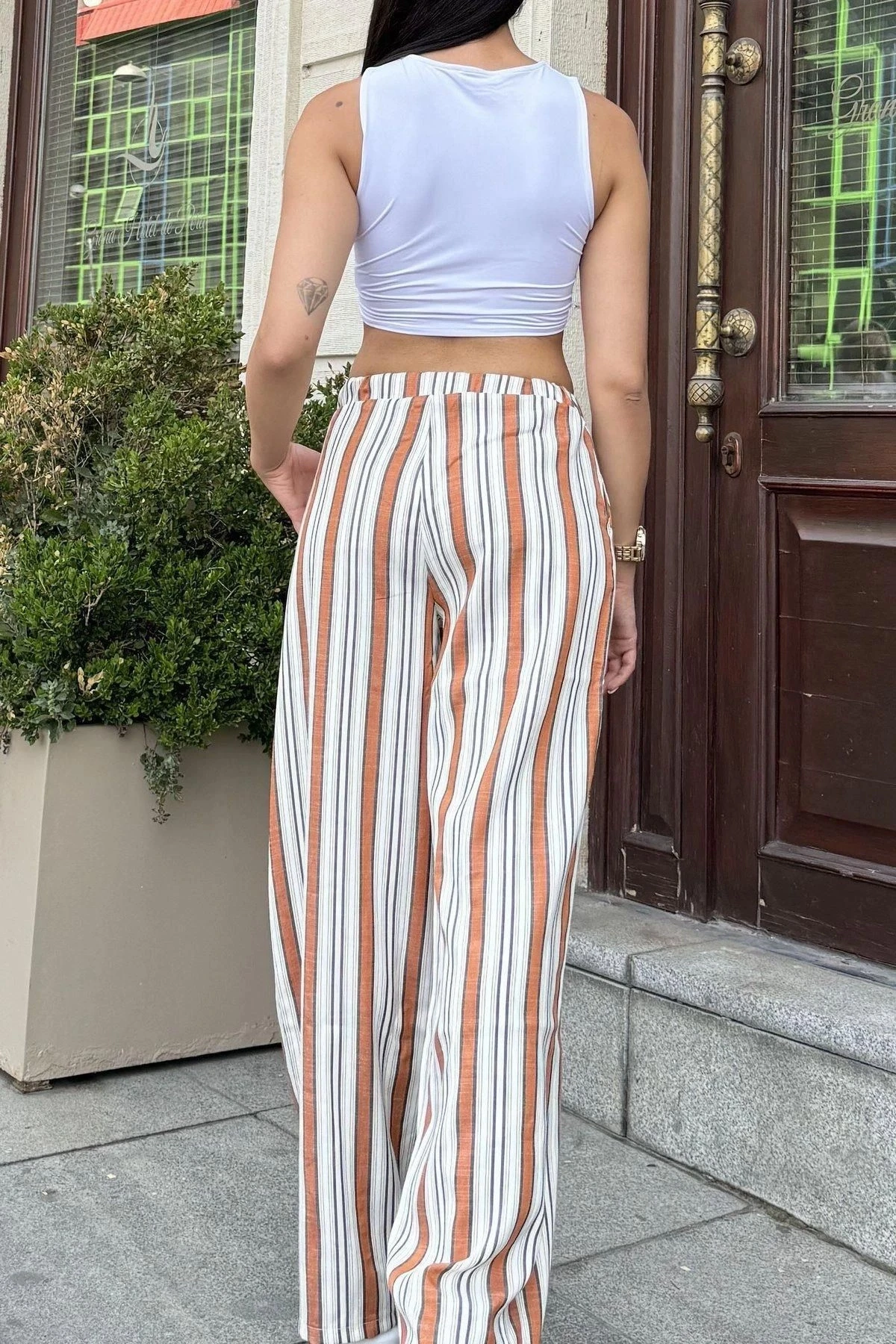 Kadın Kiremit & Ekru Çizgili, Beli Lastikli, Bol Paça, Salaş Keten Pantolon - Tesettüre Uygun