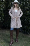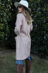Kadın Kiremit & Ekru Çizgili, Hasır İp Kemerli, İki Cepli, Uzun Keten Ceket
