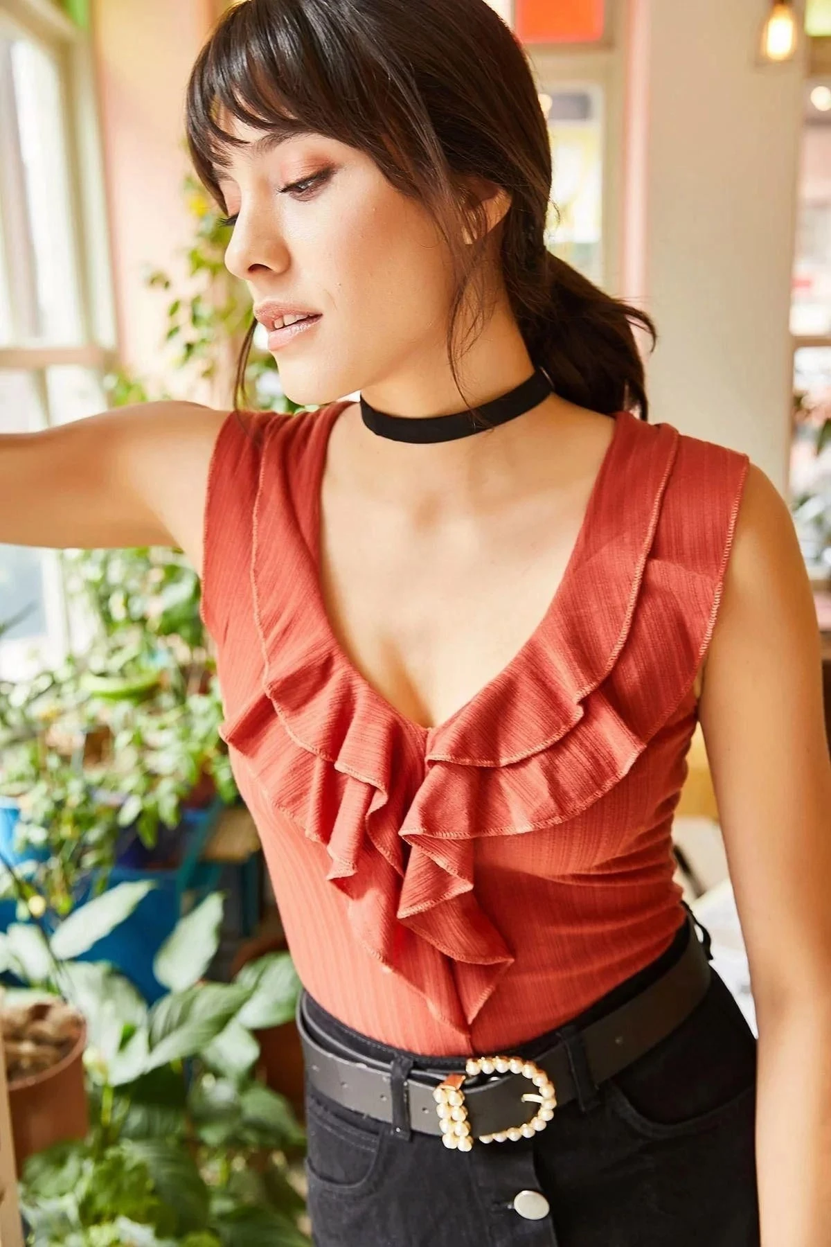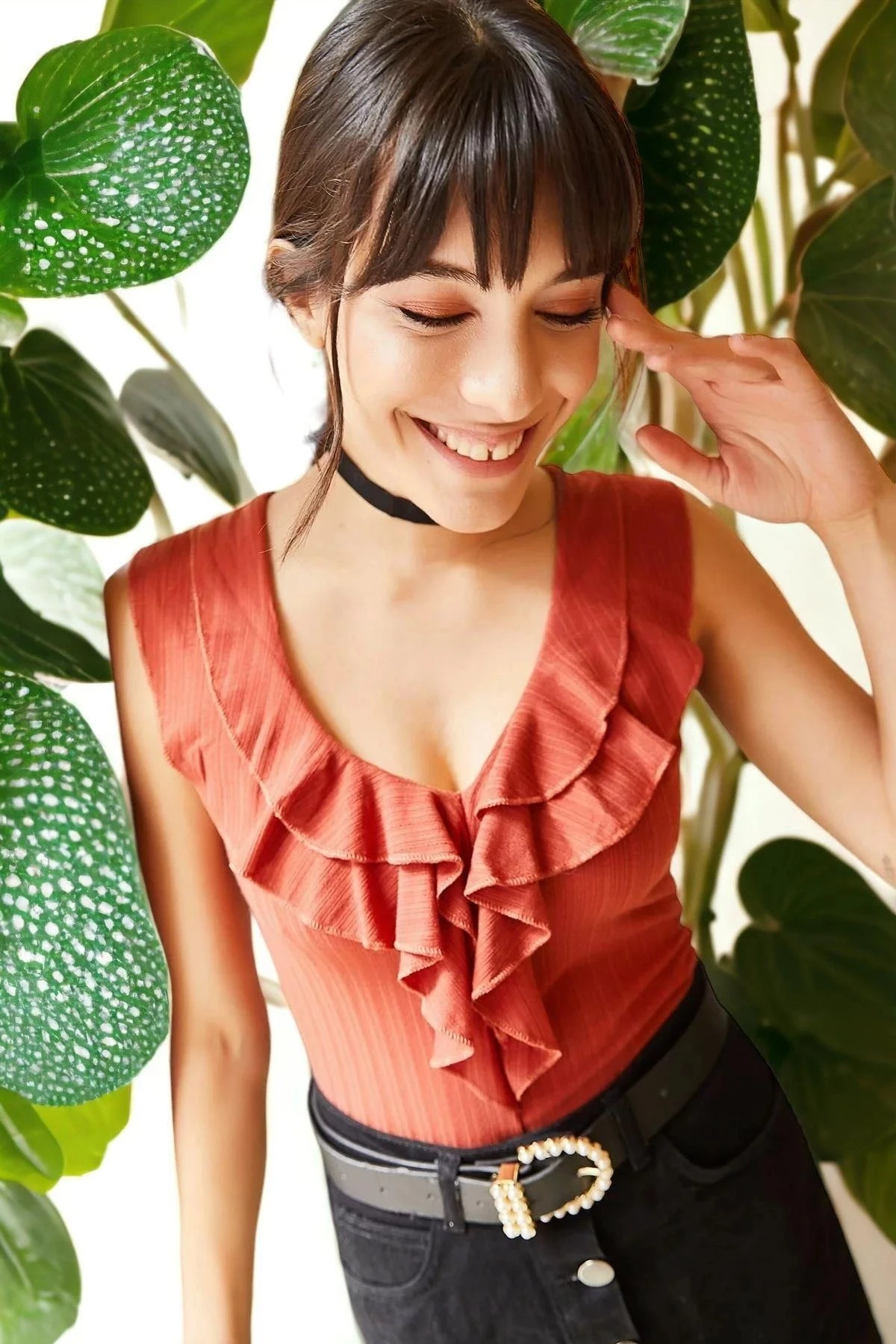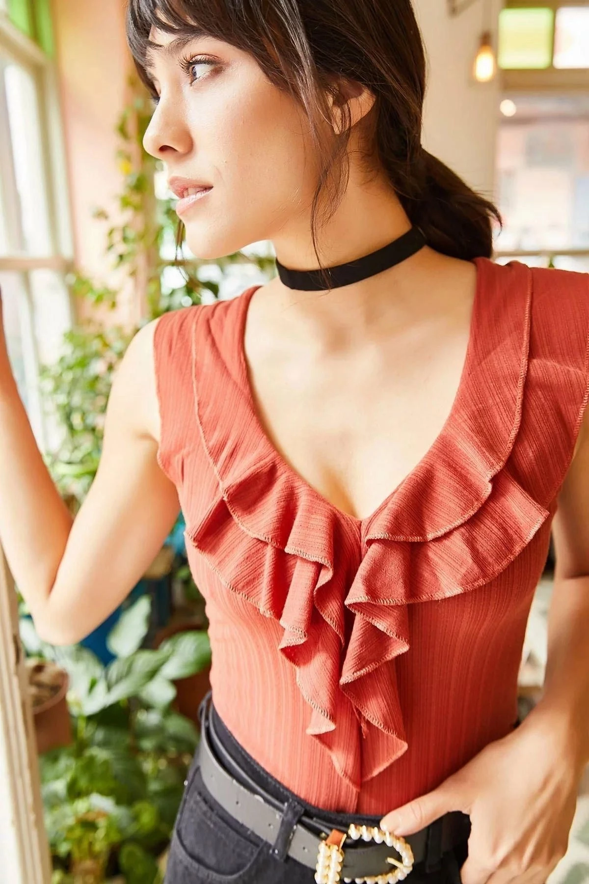 Kadın Kiremit Fırfır Detaylı Yuvarlak Yaka Sıfır Kol Basic Regular Kesim Standart Boy Bluz