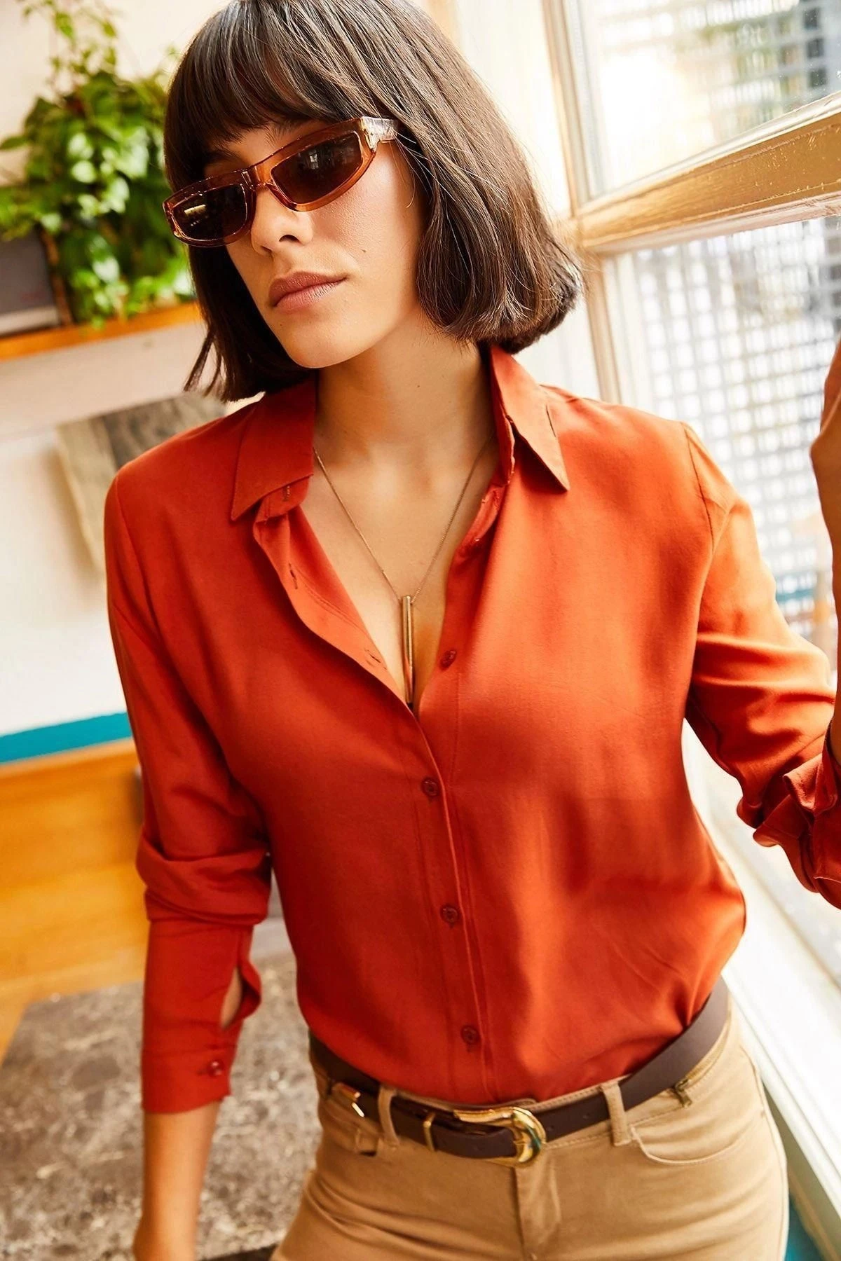 Kiremit Renk Rahat Klasik Yaka Uzun Kol Gömlek, şık bir görünüm ve rahat bir tarz arayanların tercihi.; Bu gömlek, üstün kaliteli %100 Viscose kumaştan üretilmiştir, böylece yumuşak ve nefes alabilir bir dokunuş sunar.; Viscose kumaş, doğal bir elyaftan yapılmış olup, hafif ve pürüzsüz bir yapıya sahiptir.; Bu özellikleri sayesinde gömleği giydiğinizde kendinizi ferah hissedersiniz.; Aynı zamanda, kumaşın parlaklığı ve ipeksi dokusuyla da dikkat çeker.; Kiremit rengi, gömleğe sıcak ve zarif bir görünüm kazandırır.; Bu canlı ve göz alıcı renk, gardırobunuzda öne çıkan bir parça olmasını sağlar.; Klasik yaka tasarımı, gömleği daha şık ve sofistike bir hale getirirken, uzun kollu yapısı da mevsim geçişlerinde ve serin günlerde kullanım için idealdir.; Bu gömleği herhangi bir pantolon, etek veya şort ile rahatlıkla kombinleyebilirsiniz.; Gündelik veya özel günlerde stilinizi tamamlamak için mükemmel bir seçimdir.; Hem iş yerinde hem de sosyal etkinliklerde şıklığınızı ön plana çıkaracak ve size güven verecektir.; Kiremit Renk Rahat Klasik Yaka Uzun Kol Gömlek, kaliteli kumaşı, çarpıcı rengi ve zarif tasarımıyla gardırobunuza yeni bir soluk getirecek.; Şıklığı ve rahatlığı bir araya getiren bu gömlek, sizin için mükemmel bir seçenek olacaktır.; Kendinizi iyi hissetmek ve tarzınızı yansıtmak için şimdi bu gömleği tercih edin!