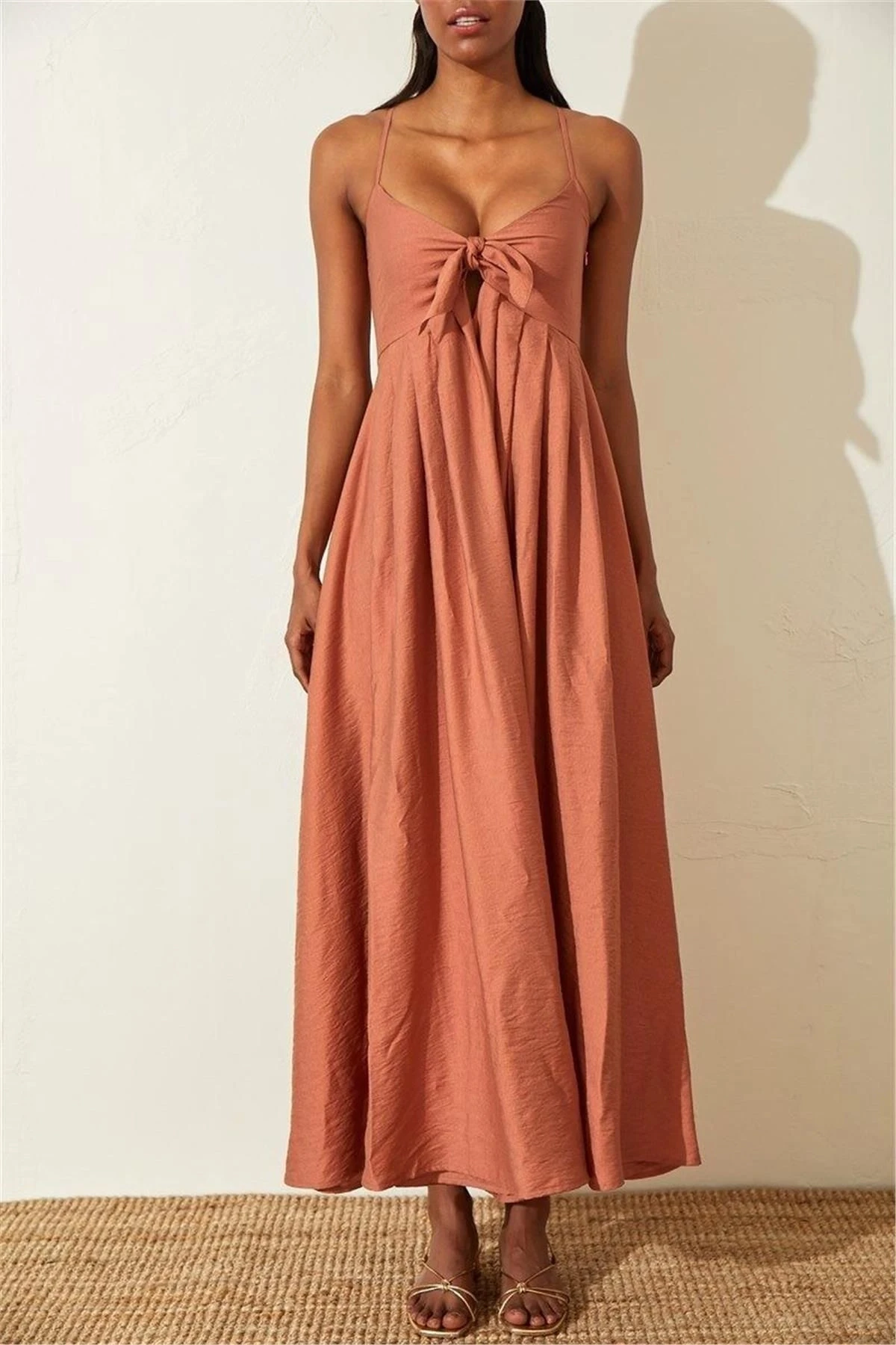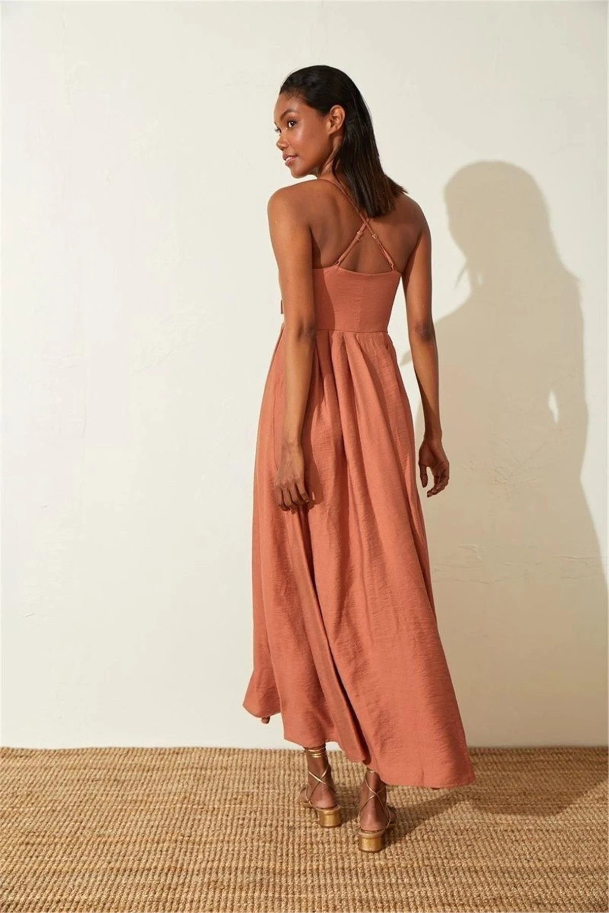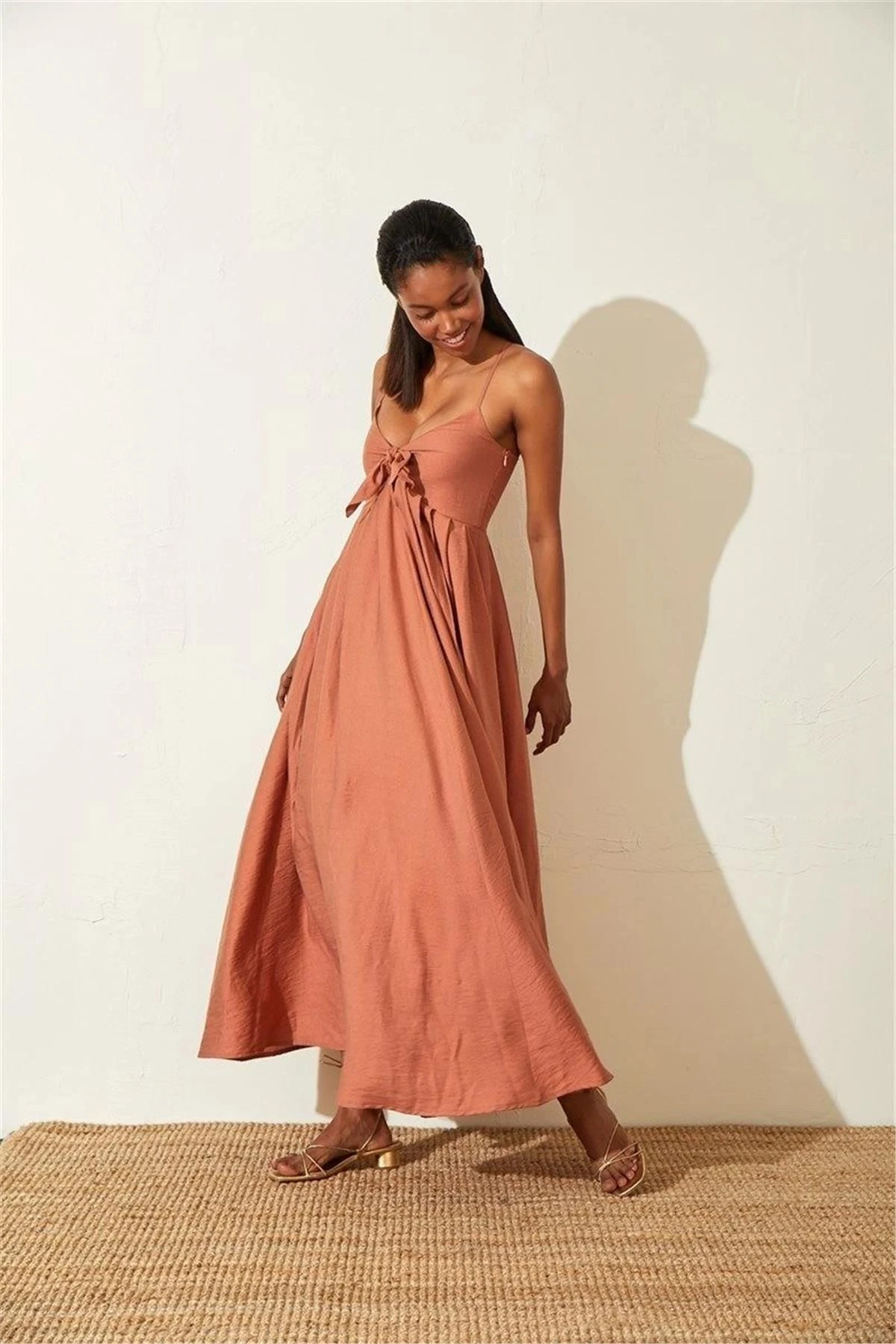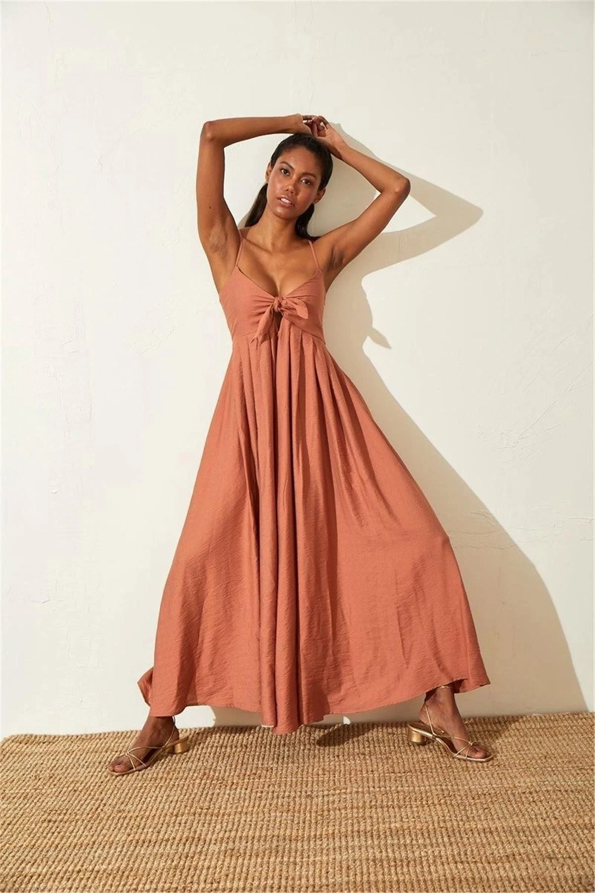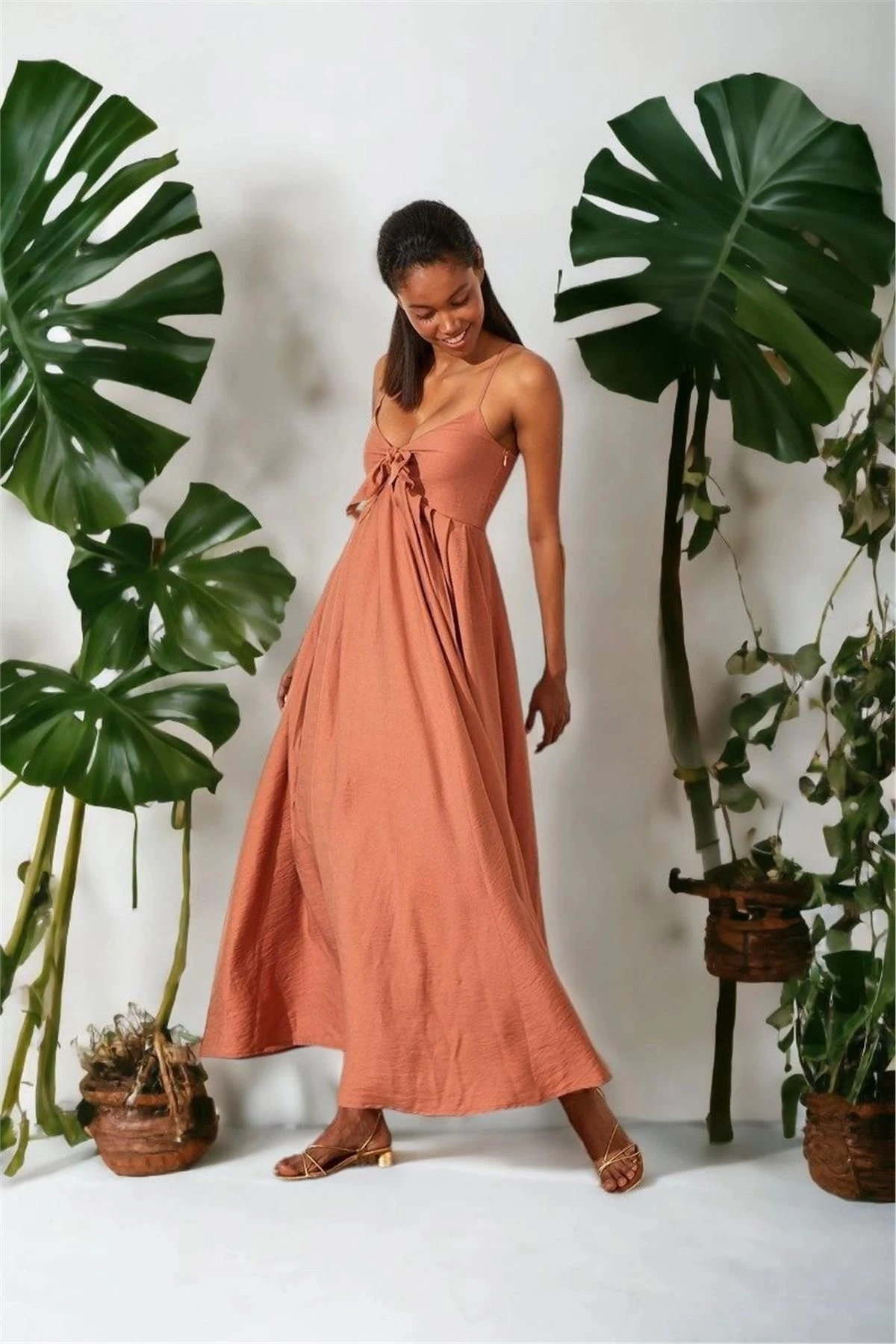 Bu rahat kesimli, maksi boyda ve günlük kullanıma uygun olan elbise, tarzınızı tamamlayacak şık bir seçenektir.; Kiremit rengiyle dikkat çeken bu elbise, modern ve zarif bir görünüm sunar.; Elbisenin kumaşı %60 polyester ve %40 pamuk içeriğine sahiptir.; Bu kombinasyon, dayanıklılık ve konfor sağlayan bir dokuya sahip olmasını sağlar.; Polyester, kırışıklıklara karşı direnç gösterirken pamuk, nefes alabilirlik özelliğiyle rahat bir giyim deneyimi sunar.; Yaka kısmında V yakalı tasarımıyla şıklığına şıklık katan bu elbisenin, askılı kol detayları da dikkat çekicidir.; Bağcık detayı, elbisenin belinizi vurgulayarak sizi daha feminen gösterir ve bedeninize uygun şekilde ayarlamanızı sağlar.; Bu elbise, herhangi bir fırsat için mükemmel bir seçenektir.; Günlük kullanımda rahatlıkla tercih edebileceğiniz gibi, özel bir davet veya akşam etkinliği için de uygun bir tercih olabilir.; Uzun boylu tasarımıyla vücut hatlarınızı sımsıcak sarar ve zarif bir siluet oluşturur.; Kiremit rengi, sıcak ve canlı tonuyla dikkat çekerken, renk kalıbı ve tasarımıyla da göz kamaştırır.; Bu elbise, tarzınızı yansıtan özgün ve çekici bir seçenek sunar.; Hem rahatlığı hem de şıklığı bir arada sunan bu elbiseyle kendinizi özel hissedecek ve göz alıcı bir görünüm elde edeceksiniz.
