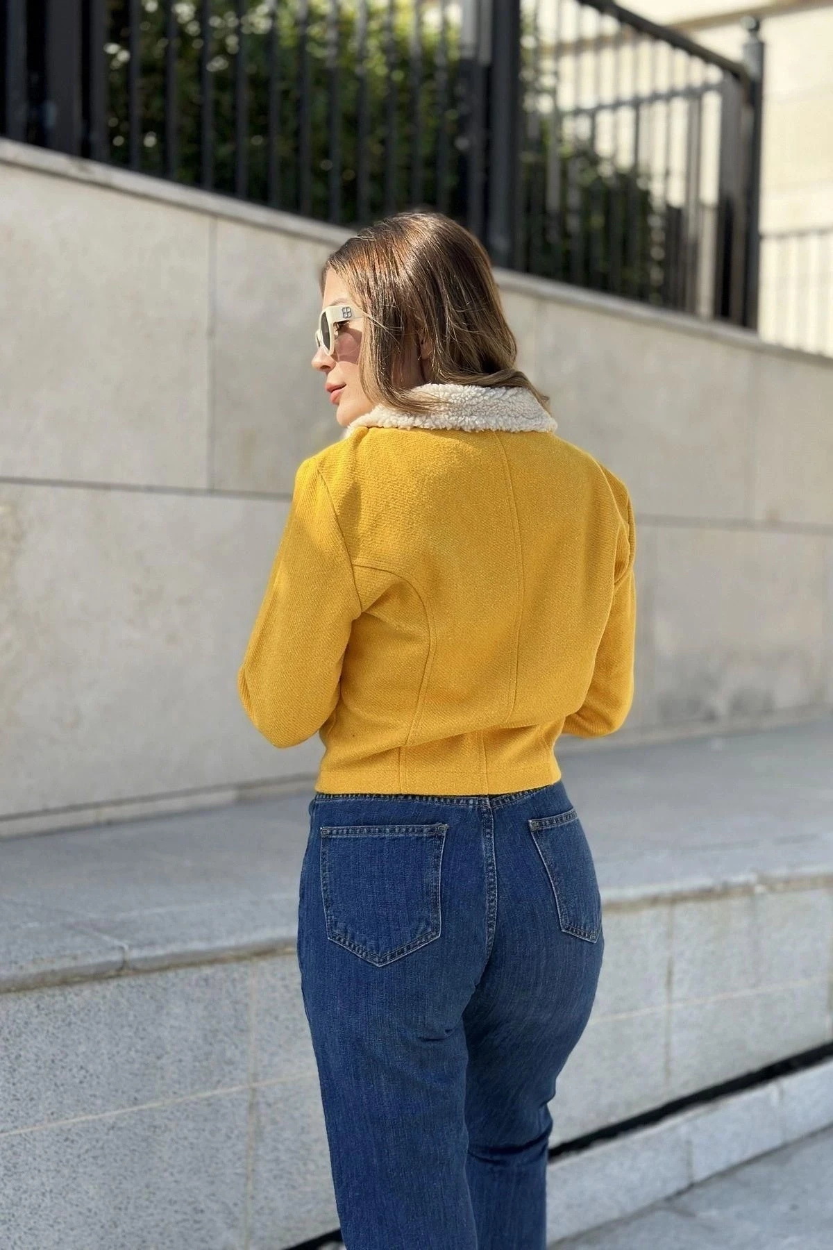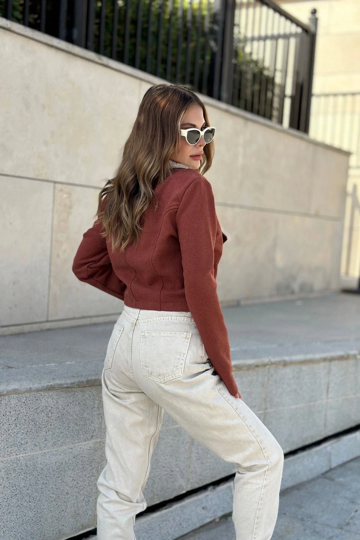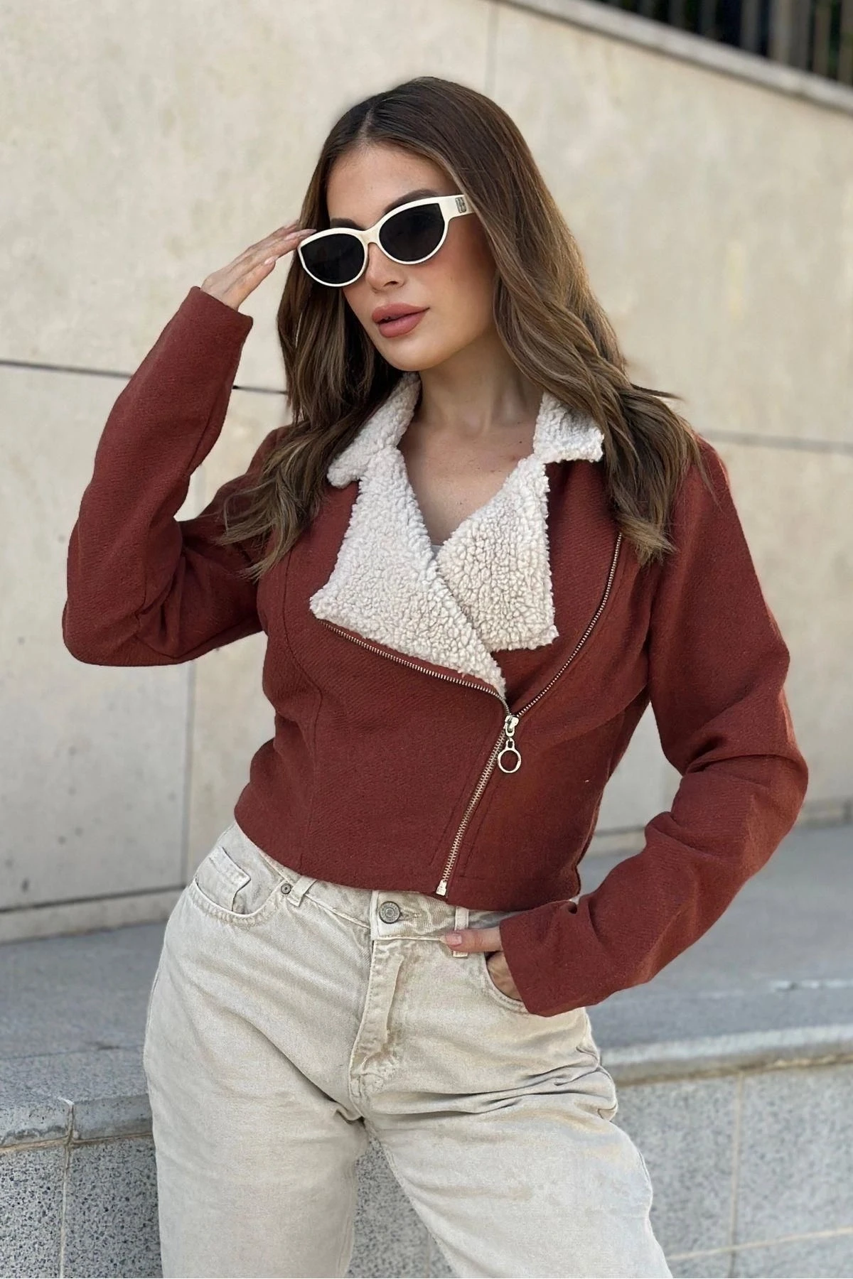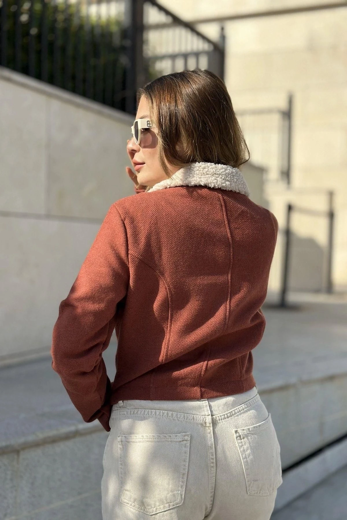 Kadın Kiremit Yakası Peluş Detay, Fermuarlı, Crop Fit Kesim, Fitilli Kaşe Kumaş, Kısa Biker Ceket
