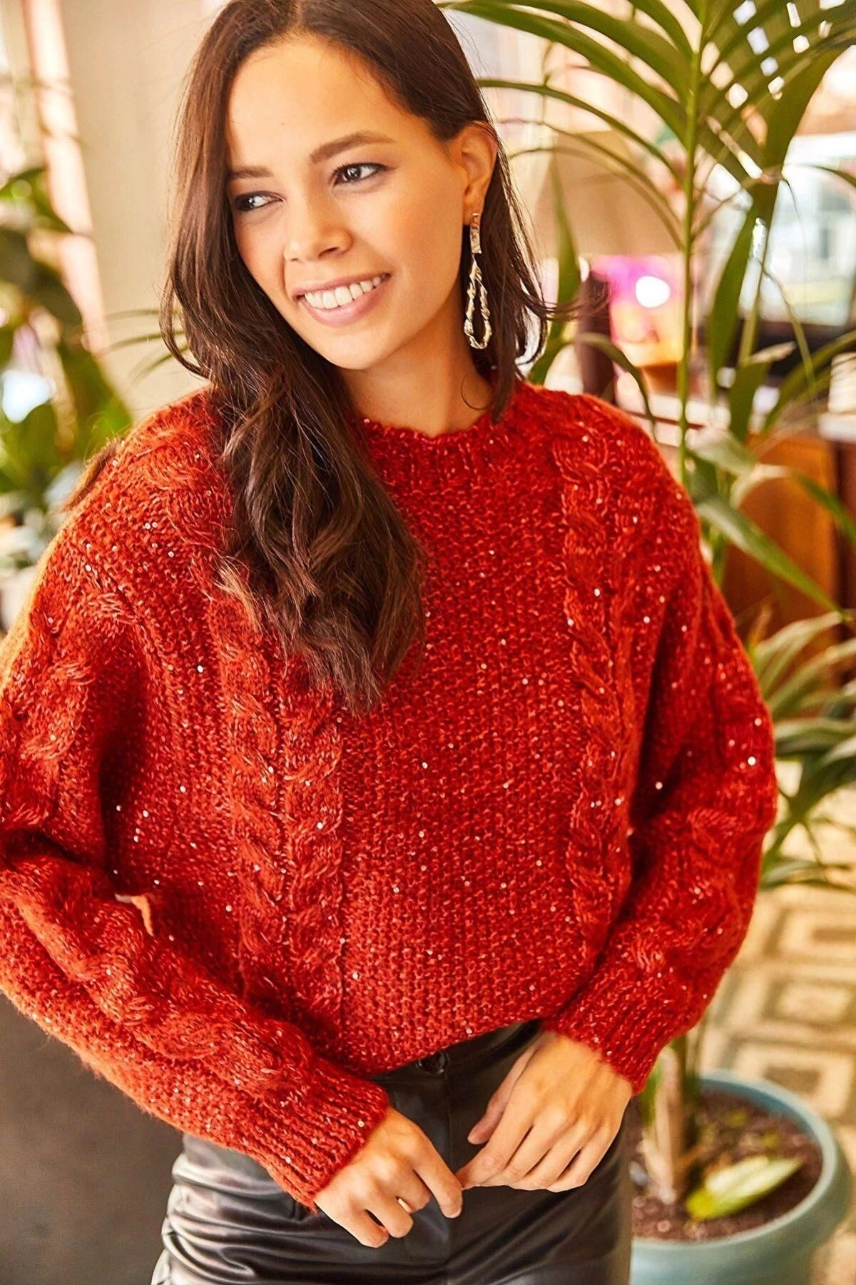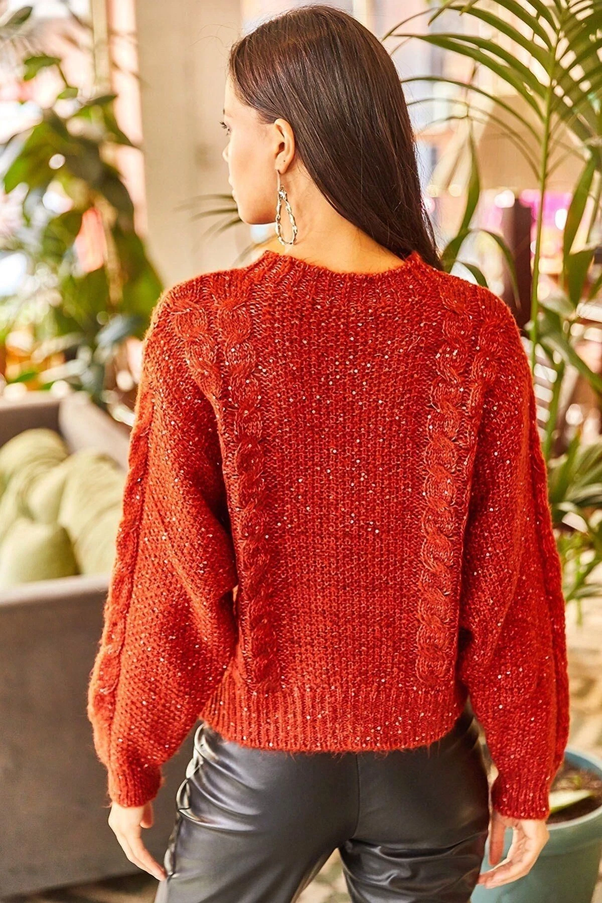 Kadın Kiremit Yuvarlak Yaka, Uzun Kol, Saç Örgü Desenli, Regular Kesim, Standart Boy Kazak