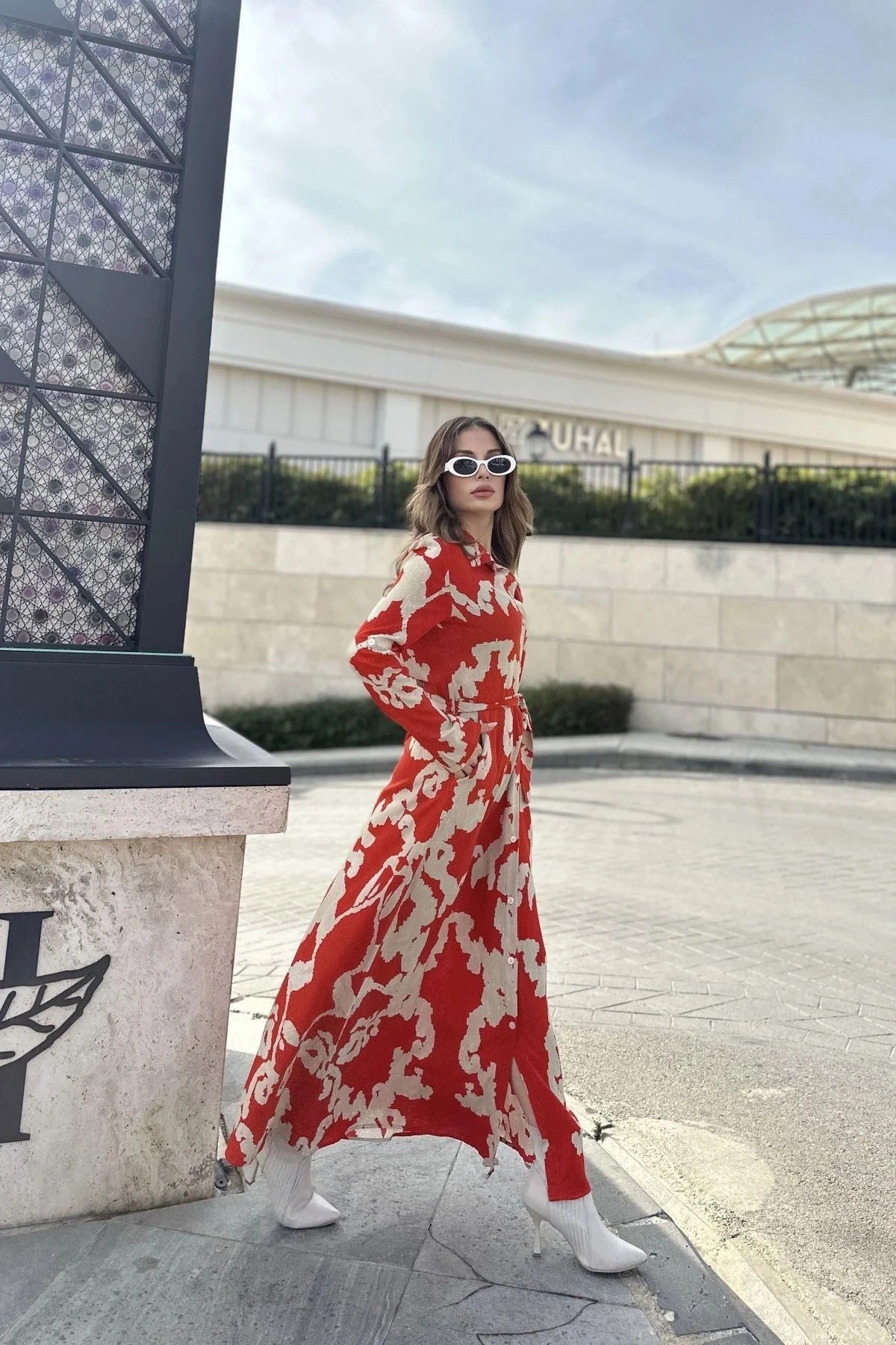 Kadın Kırmızı & Bej Uzun Kol, Kuşaklı, Yırtmaçlı, Uzun Viskon Gömlek Elbise (DAR KALIP)