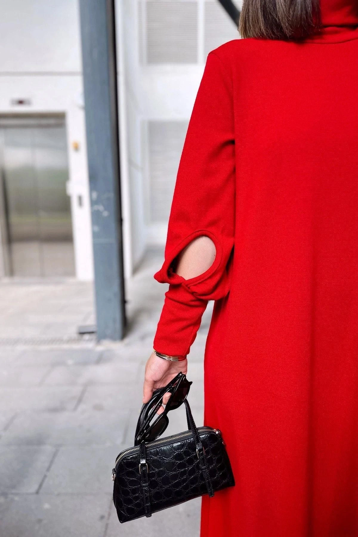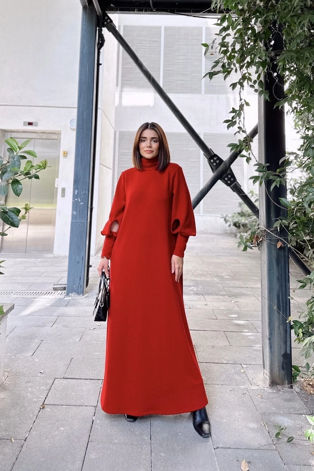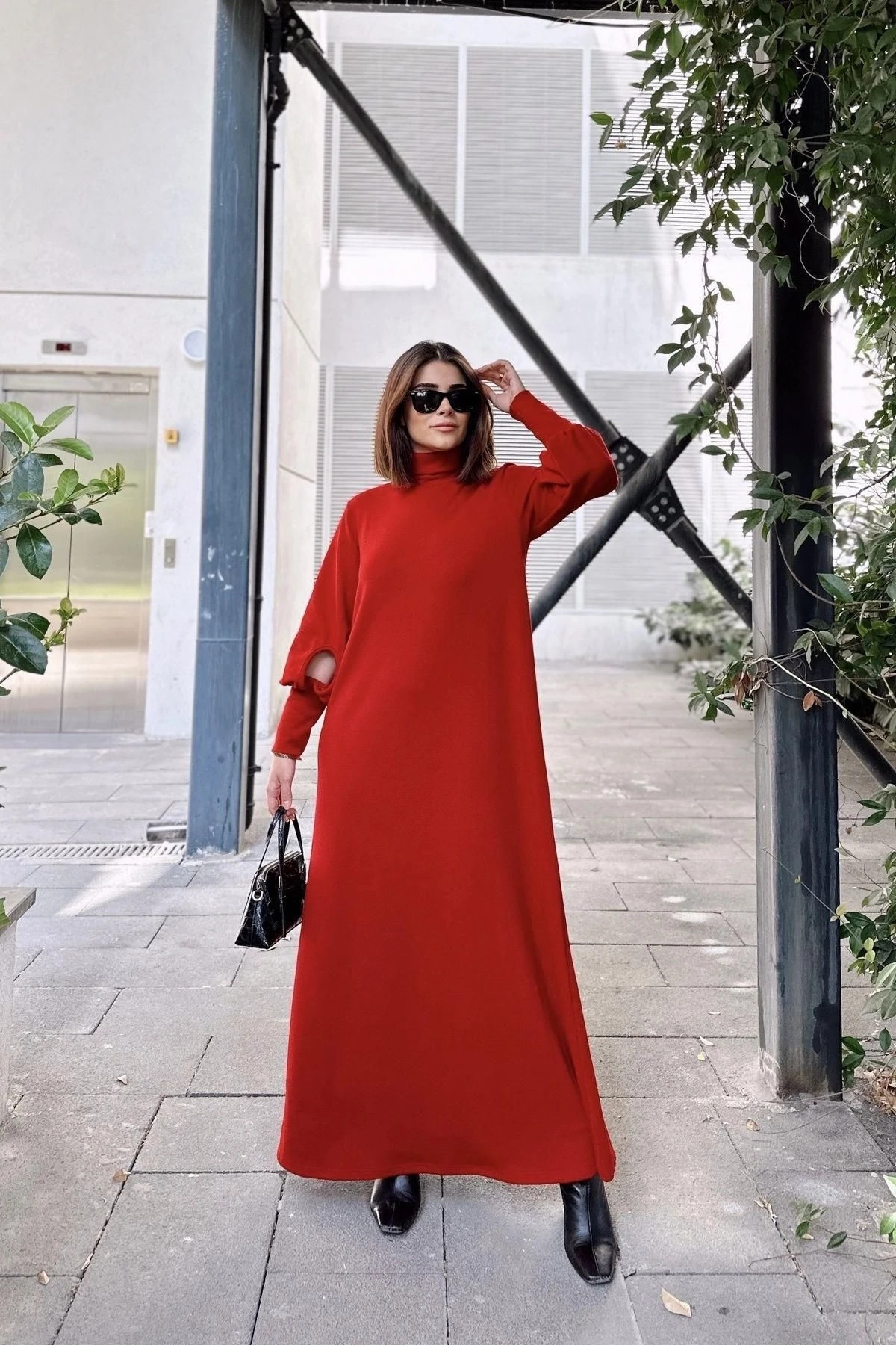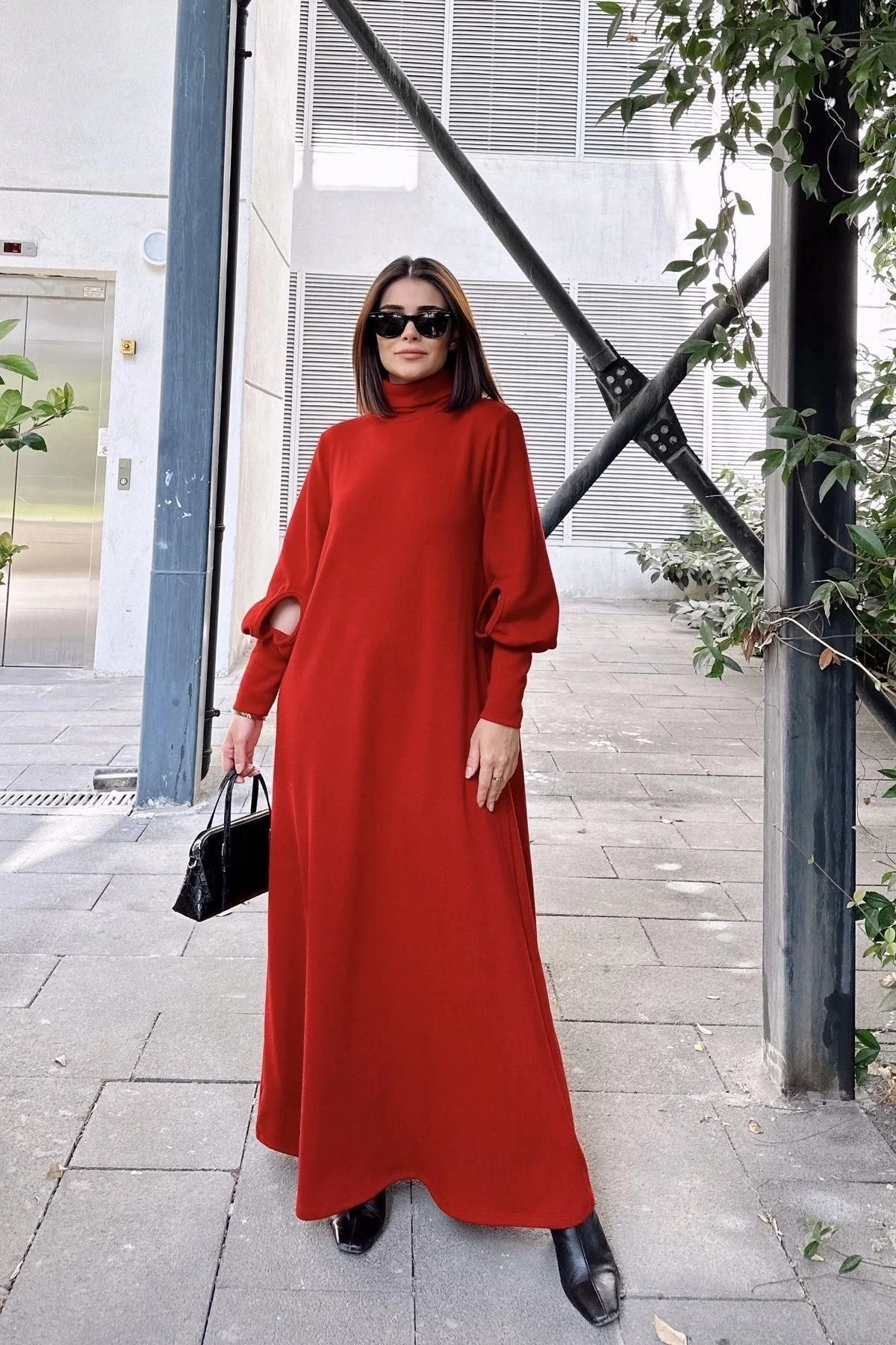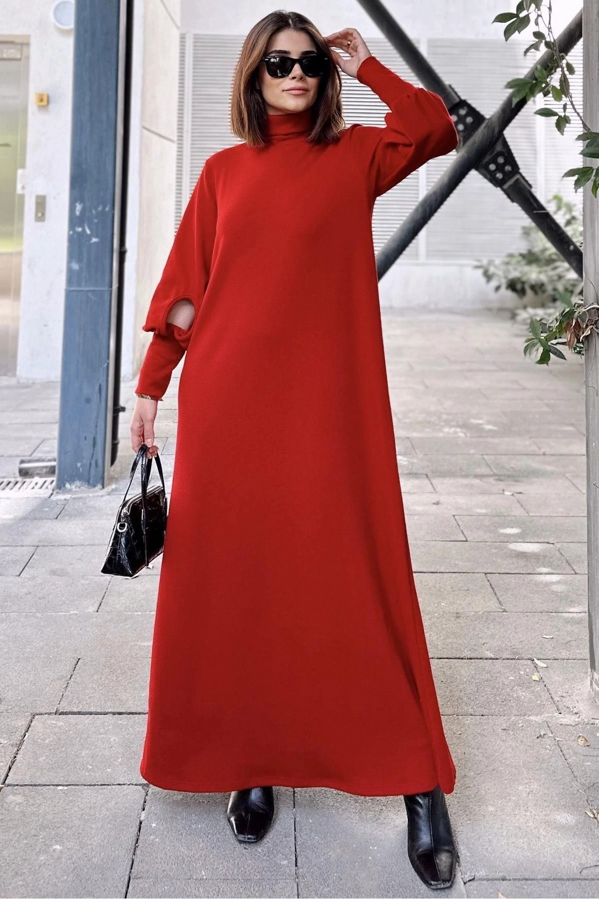 Kadın Kırmızı Boğazlı, Uzun Kolları Manşet Ve Pencere Detaylı, A Kesim, Salaş, Uzun Elbise