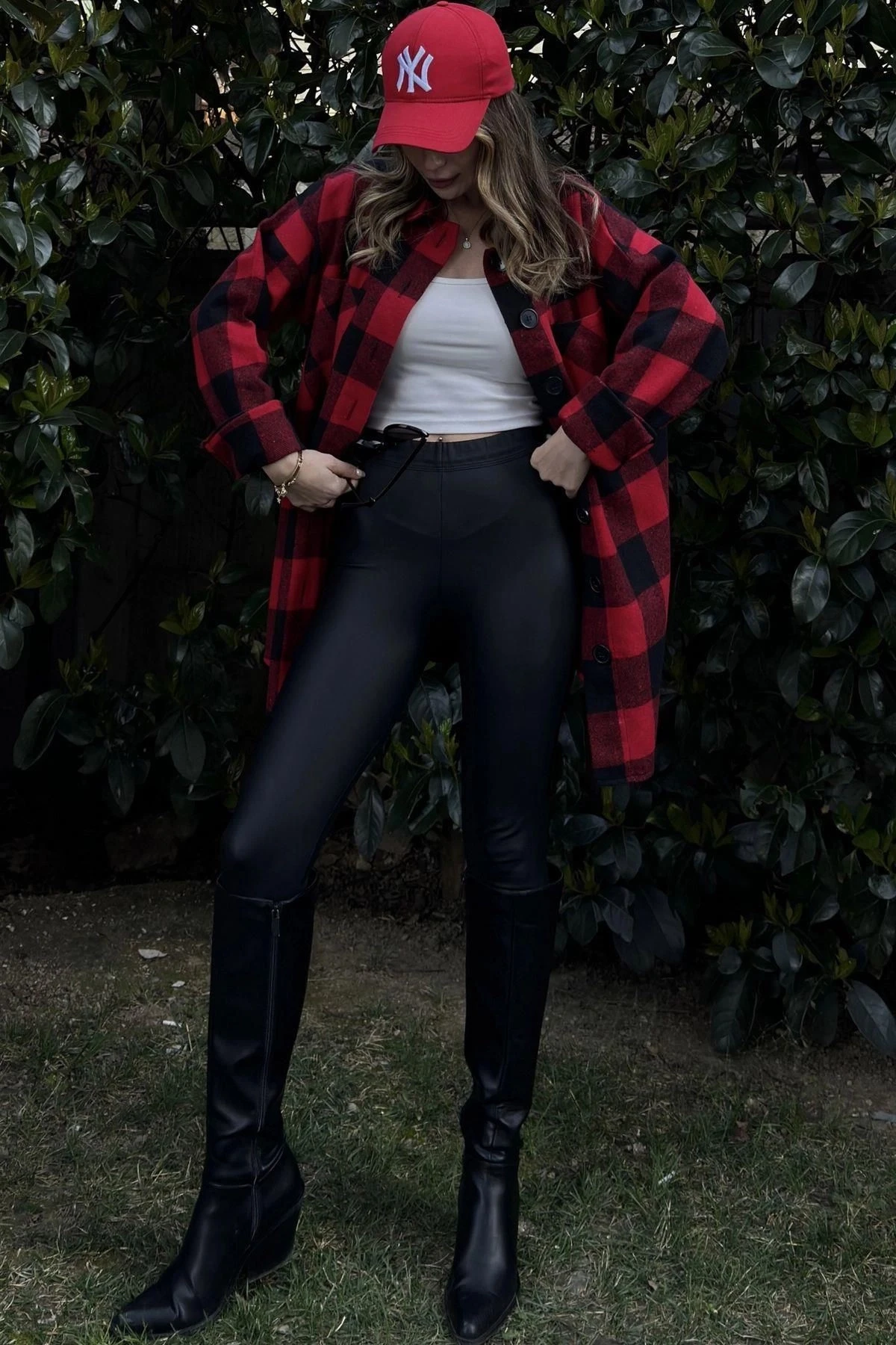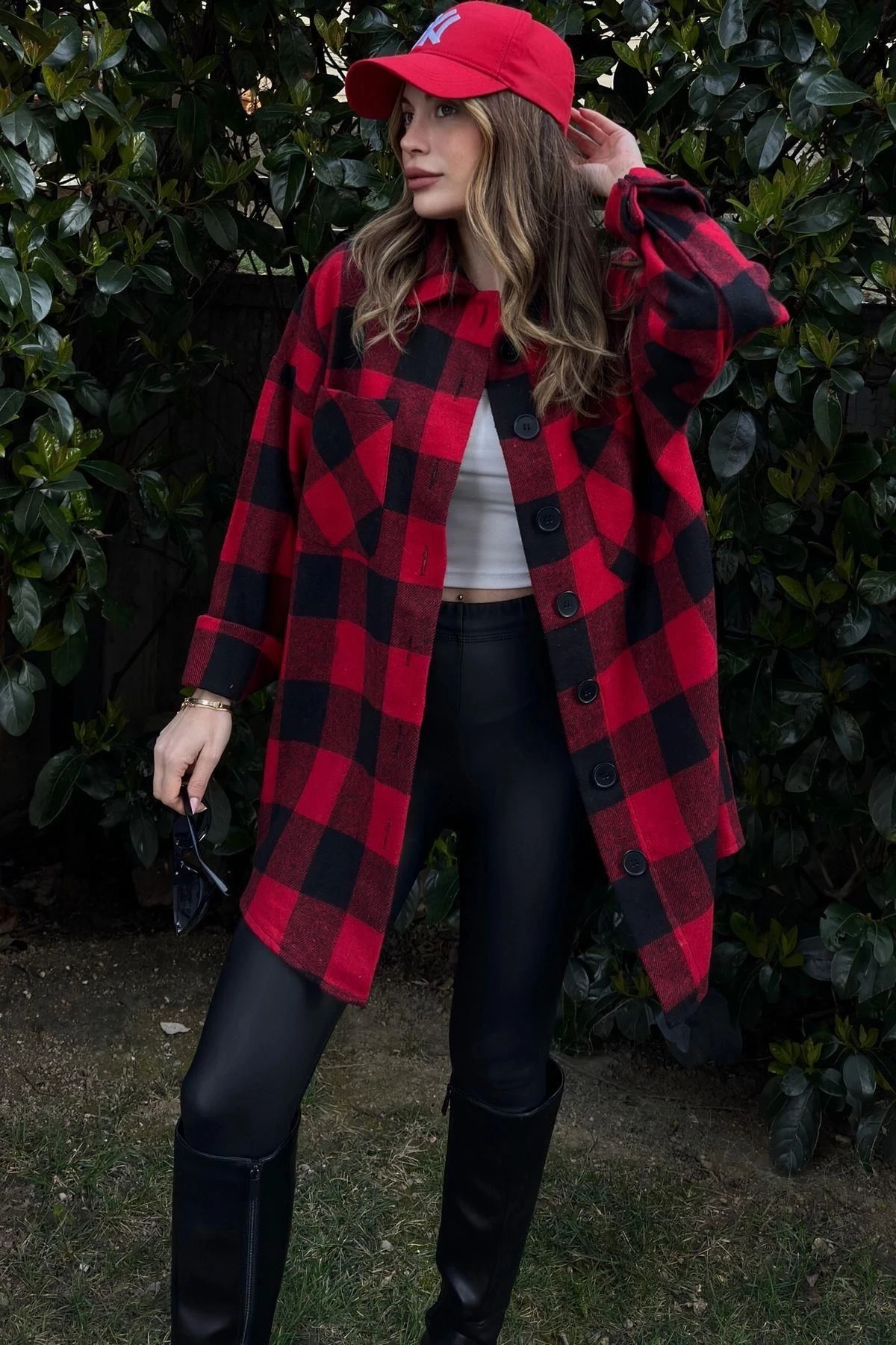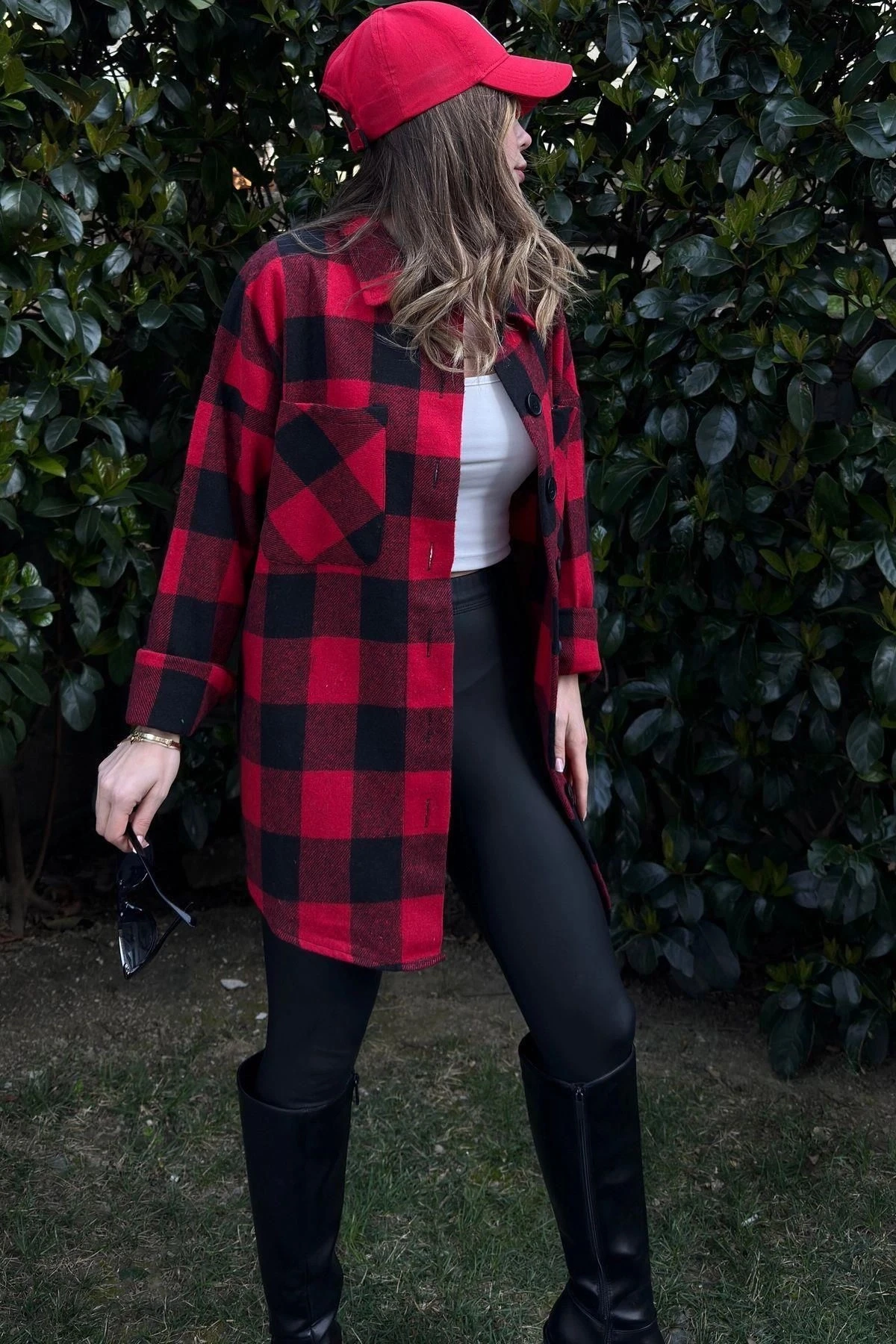Kadın Kırmızı Çift Cepli, Ekose Desenli, Rahat Kalıp, Uzun Kaşe Gömlek
