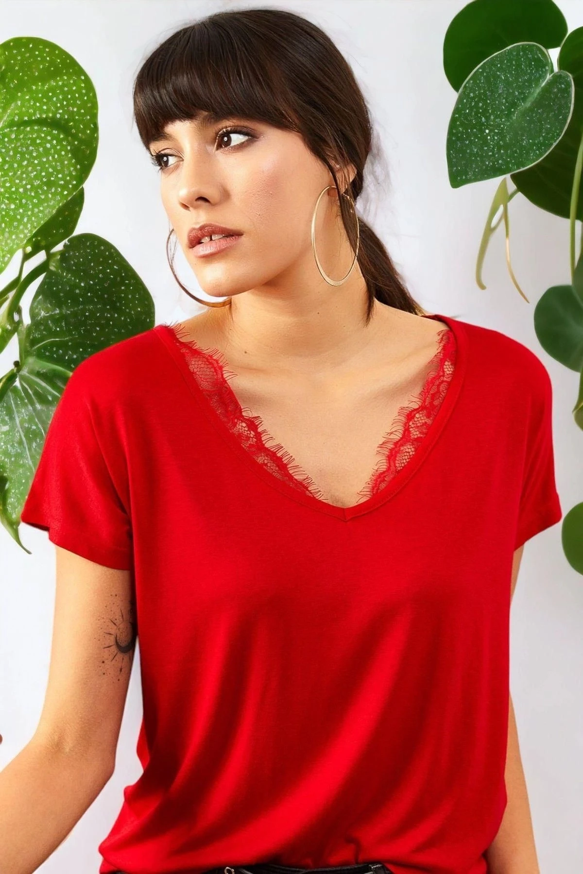 Kadın Kırmızı Derin V Yaka Dekolteli Dantelli Kısa Kollu Viskon Bluz Kısa Kol Dantel Detaylı Bluz