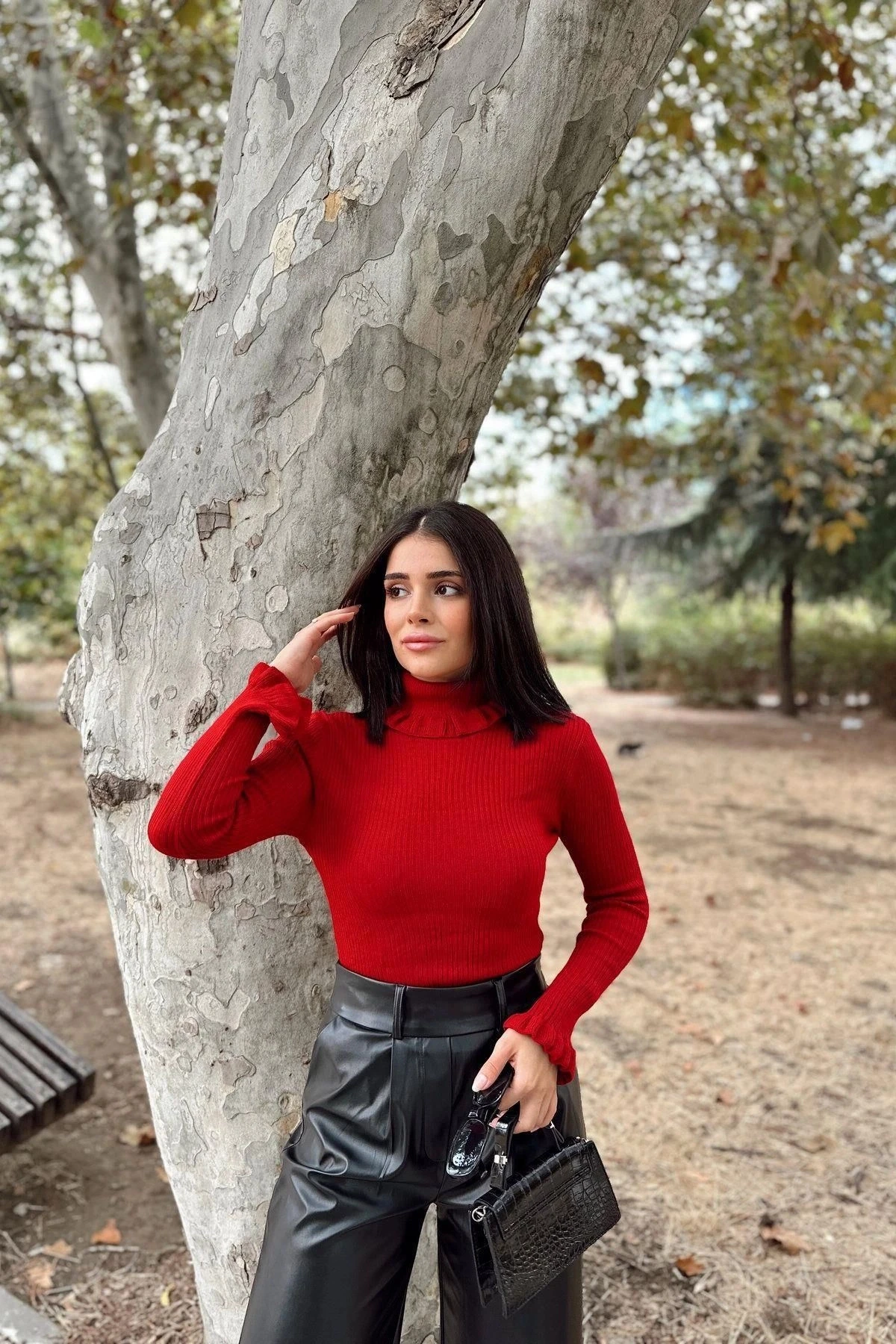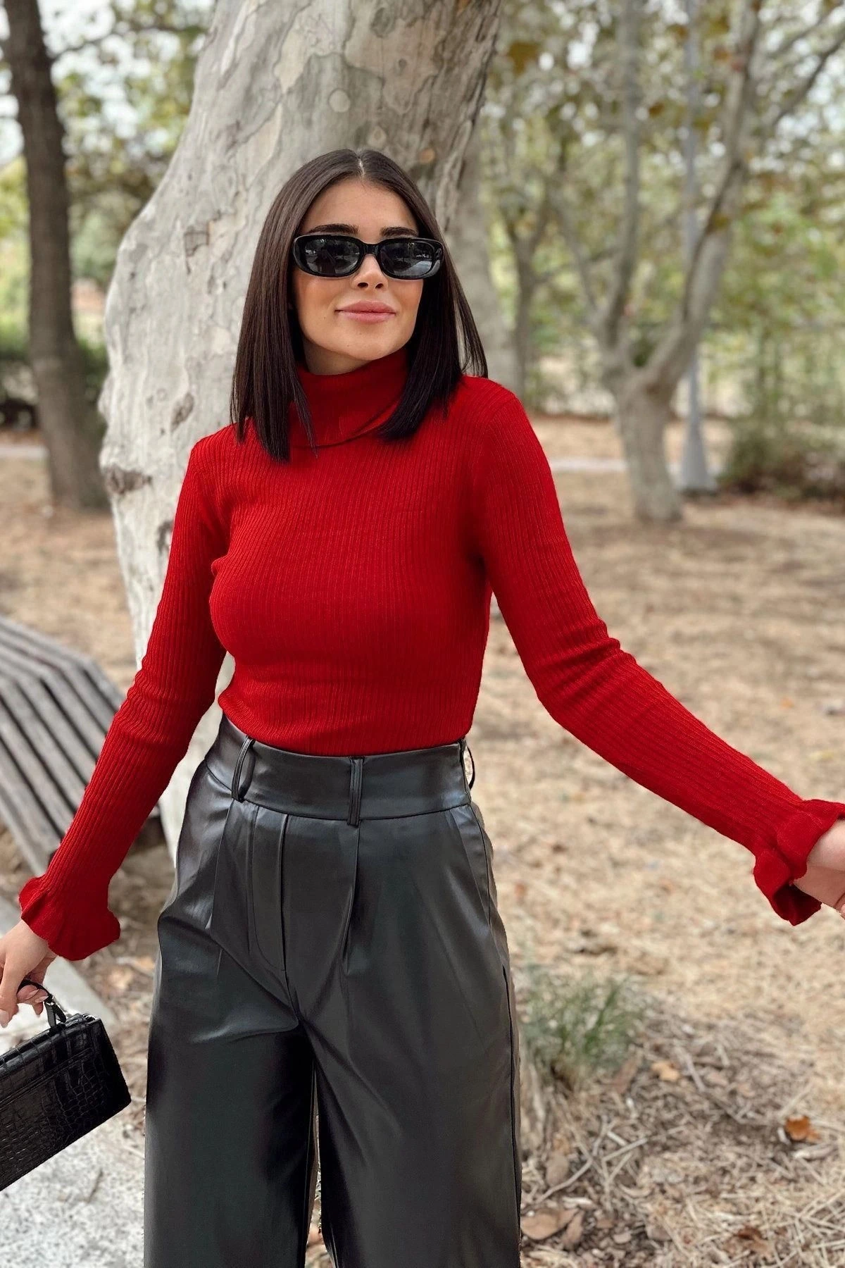 Kadın Kırmızı Fırfırlı Boğazlı Yaka, Uzun Kol, Vucüda Oturan Esnek Kumaş, Düz Desen, Triko Bluz