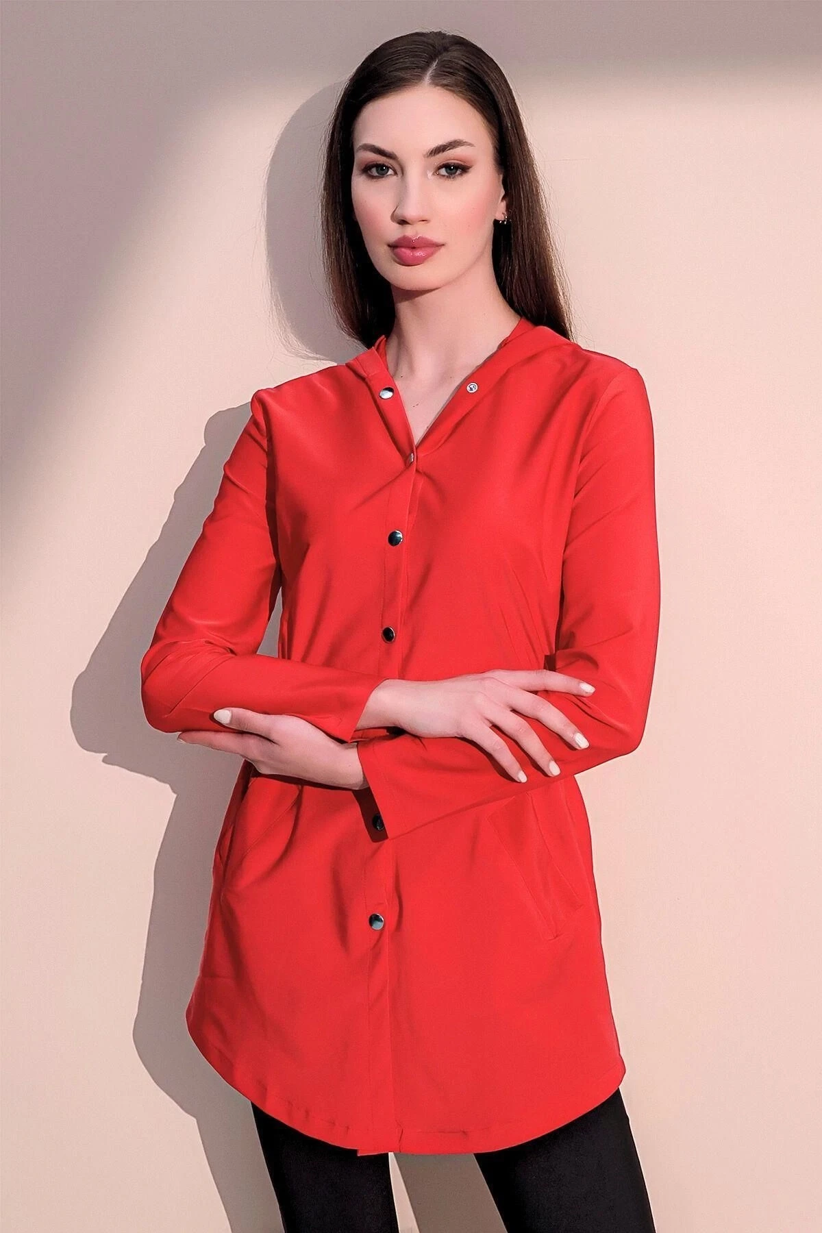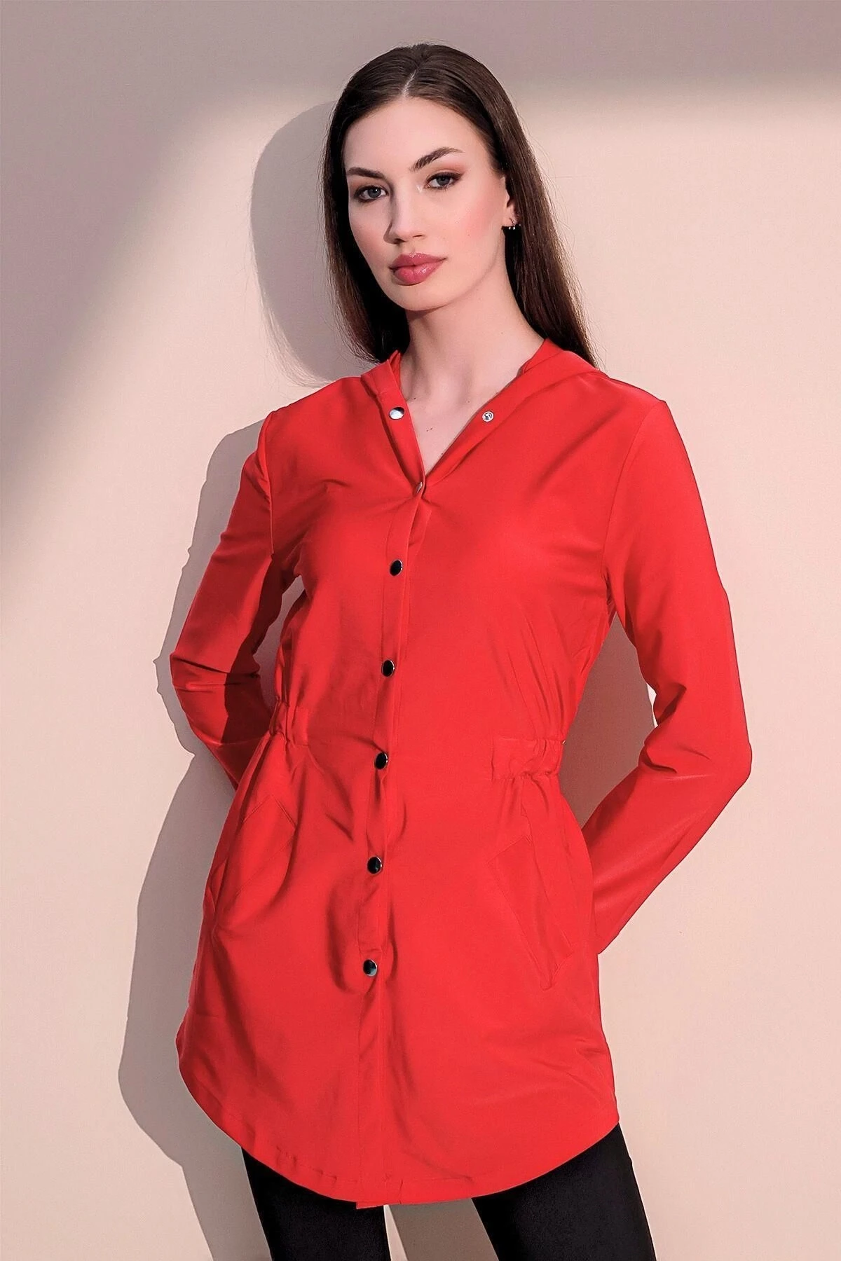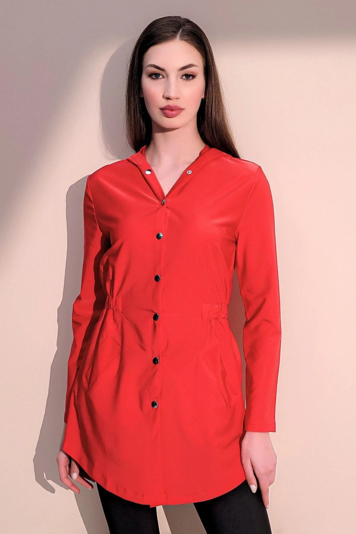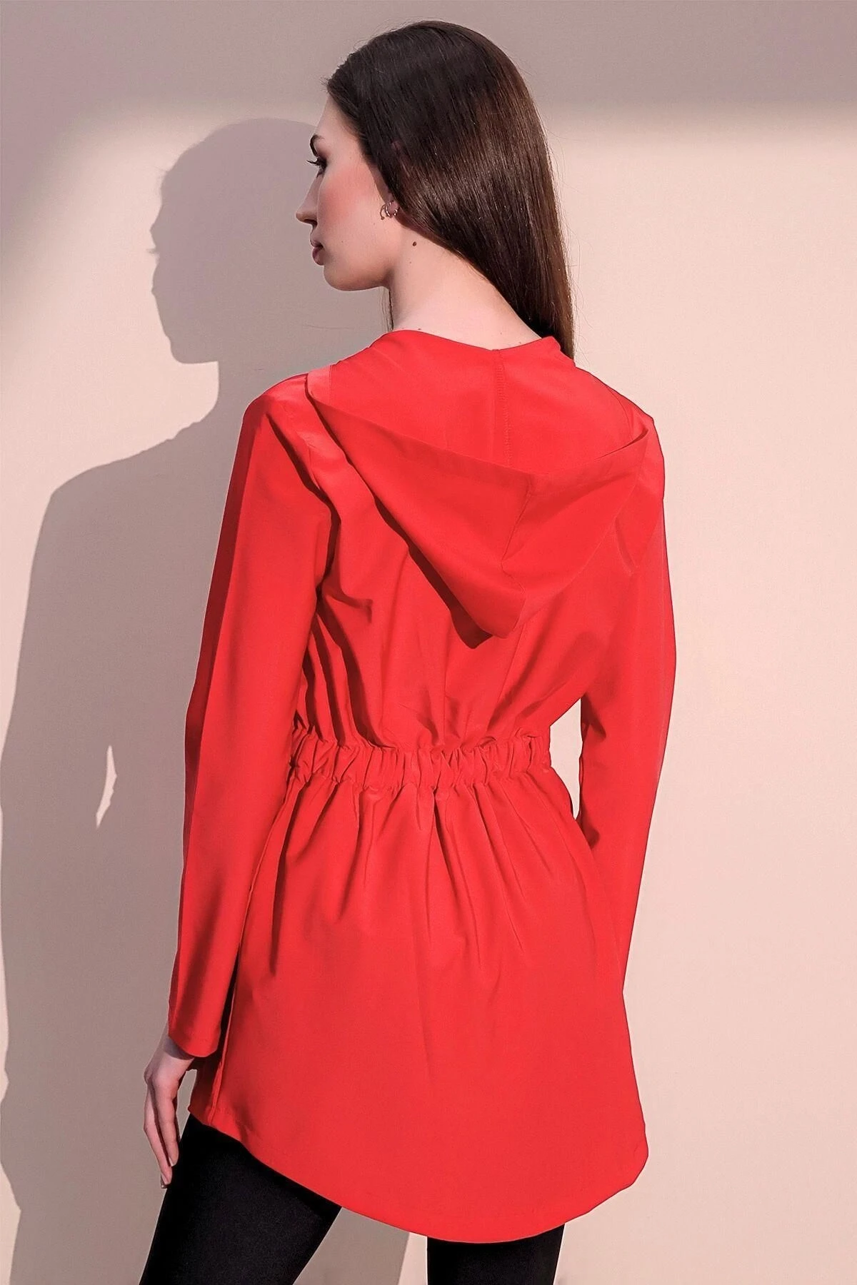 Kadın Kırmızı Kaliteli Üretim Beli Lastikli Cepli Kapüşonlu Ceket Yağmurluk