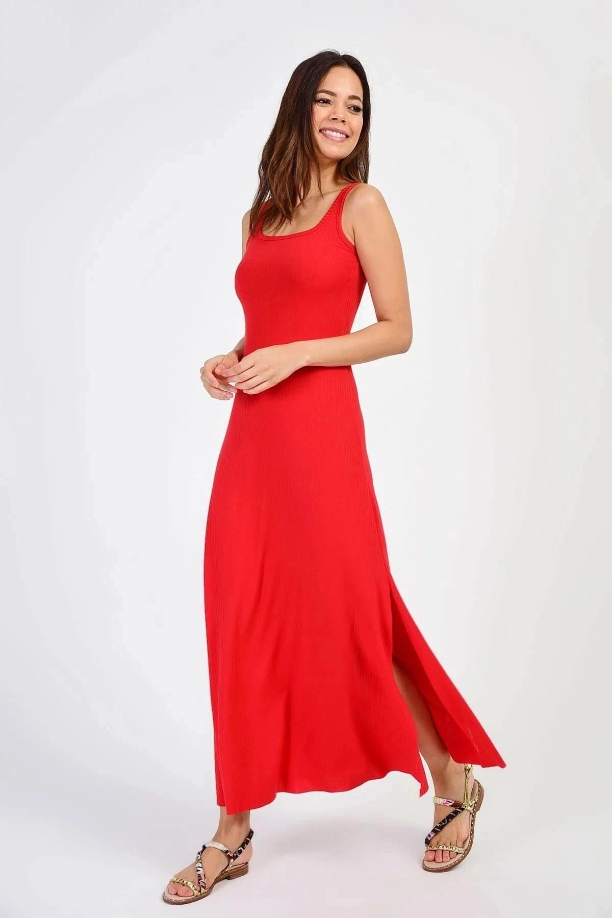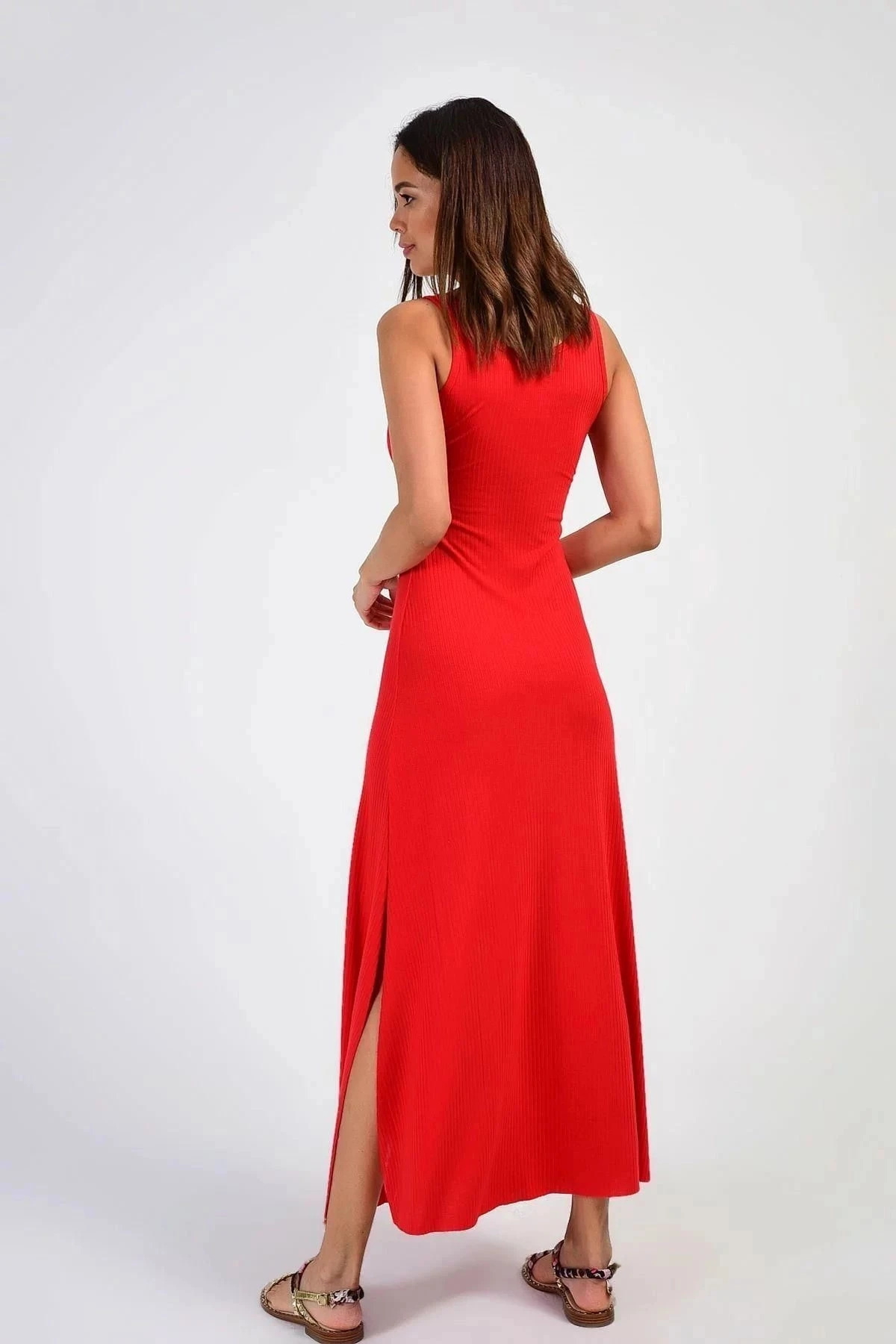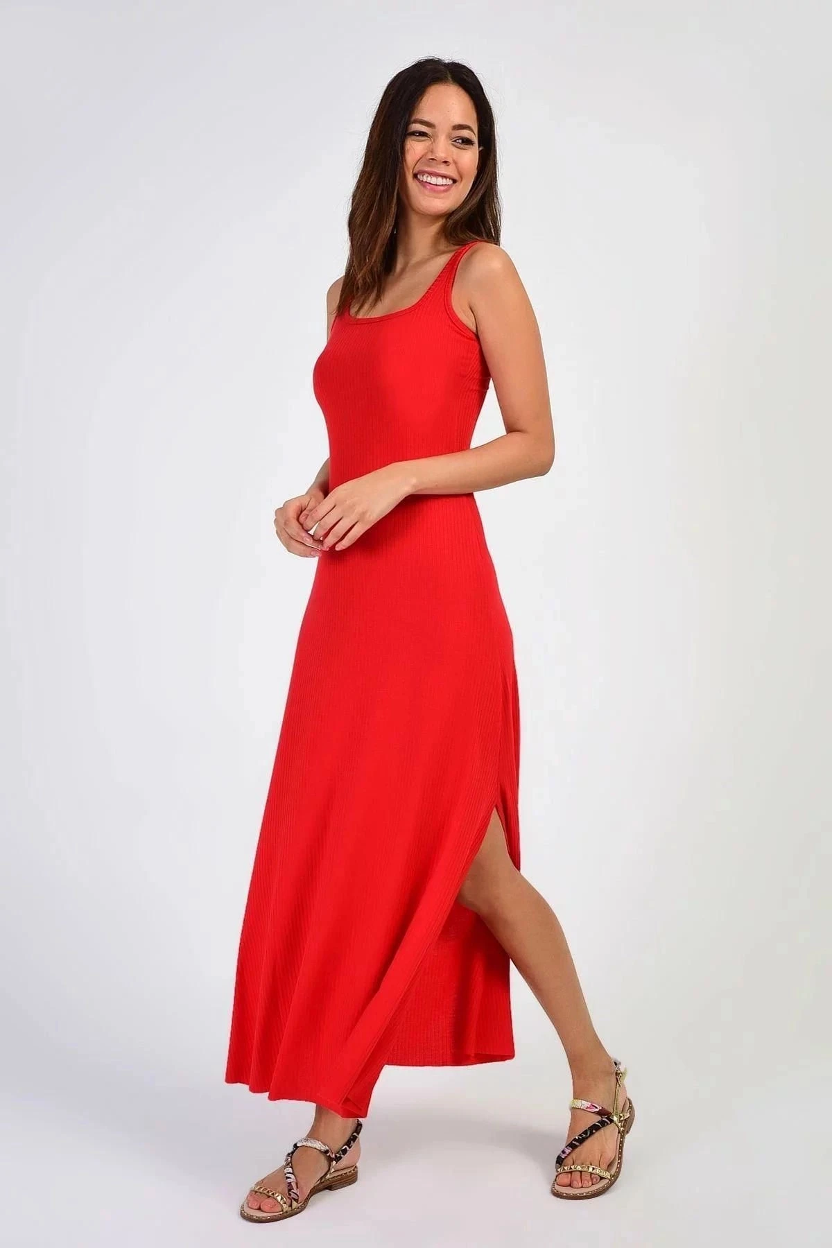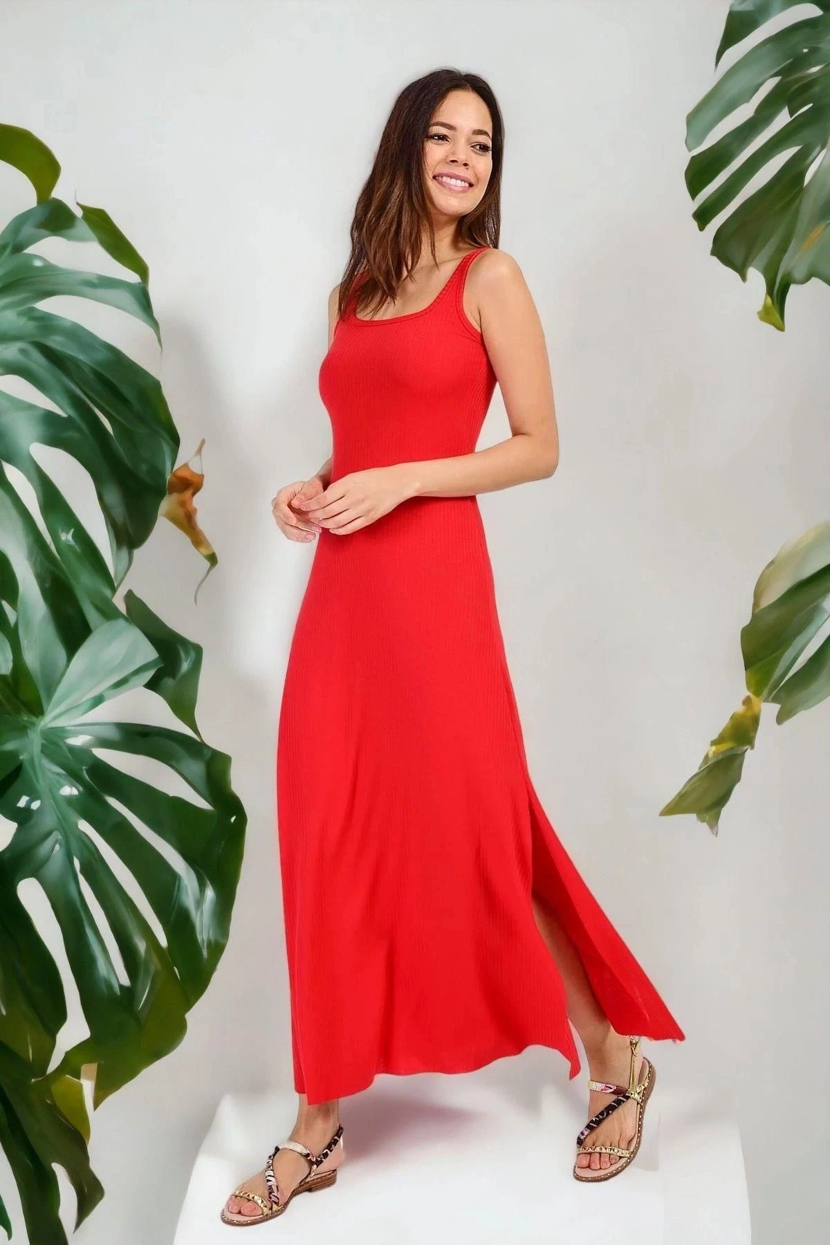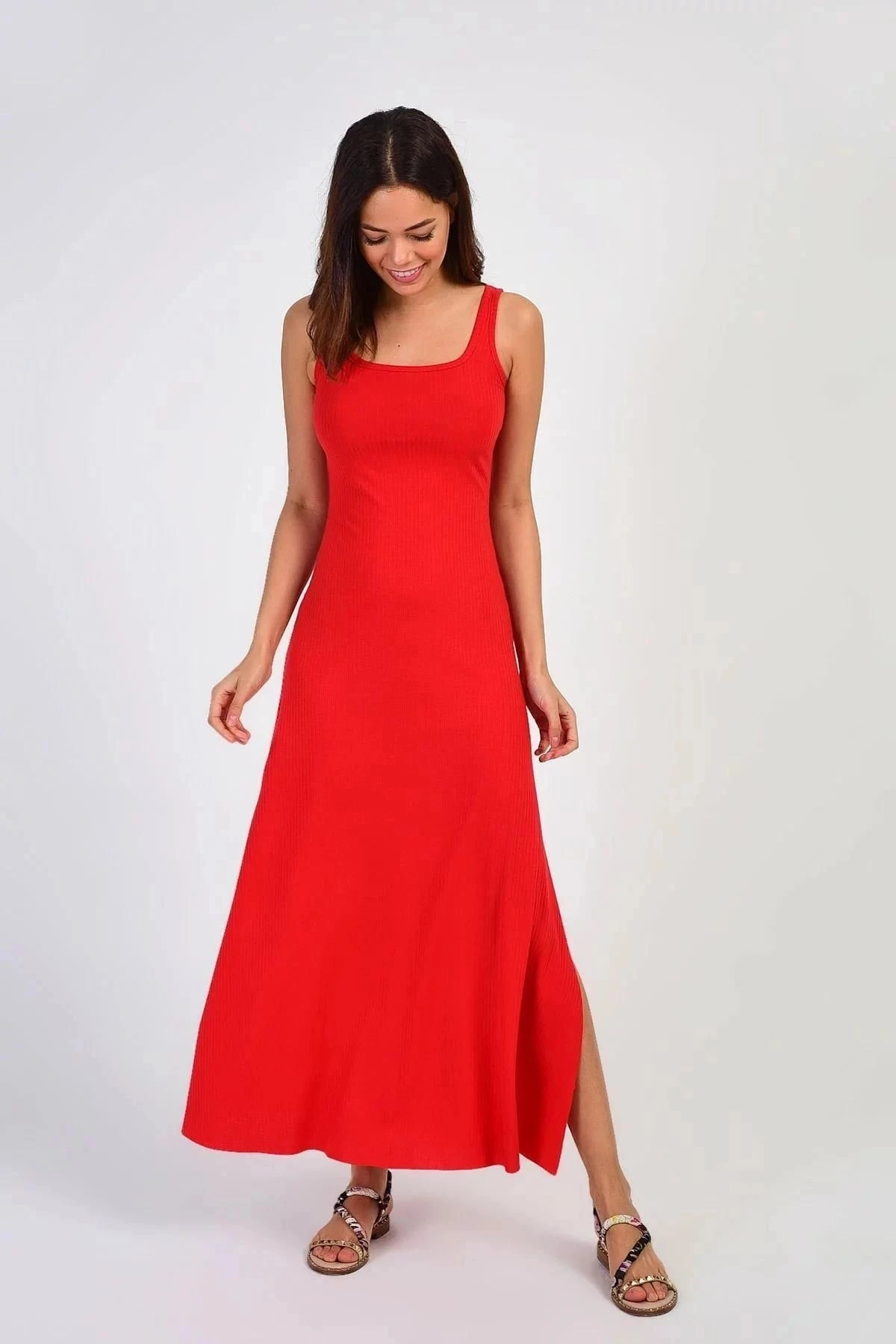 Kadın Kırmızı Kare Yaka Askılı Kol Yırtmaç Detaylı Basic li Maksi Boy Uzun Rahat Ve Günlük Elbise