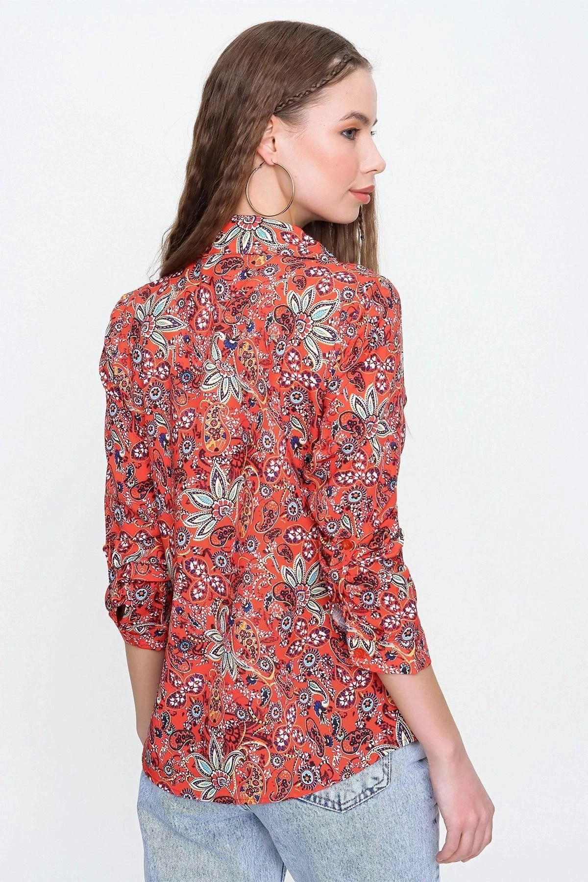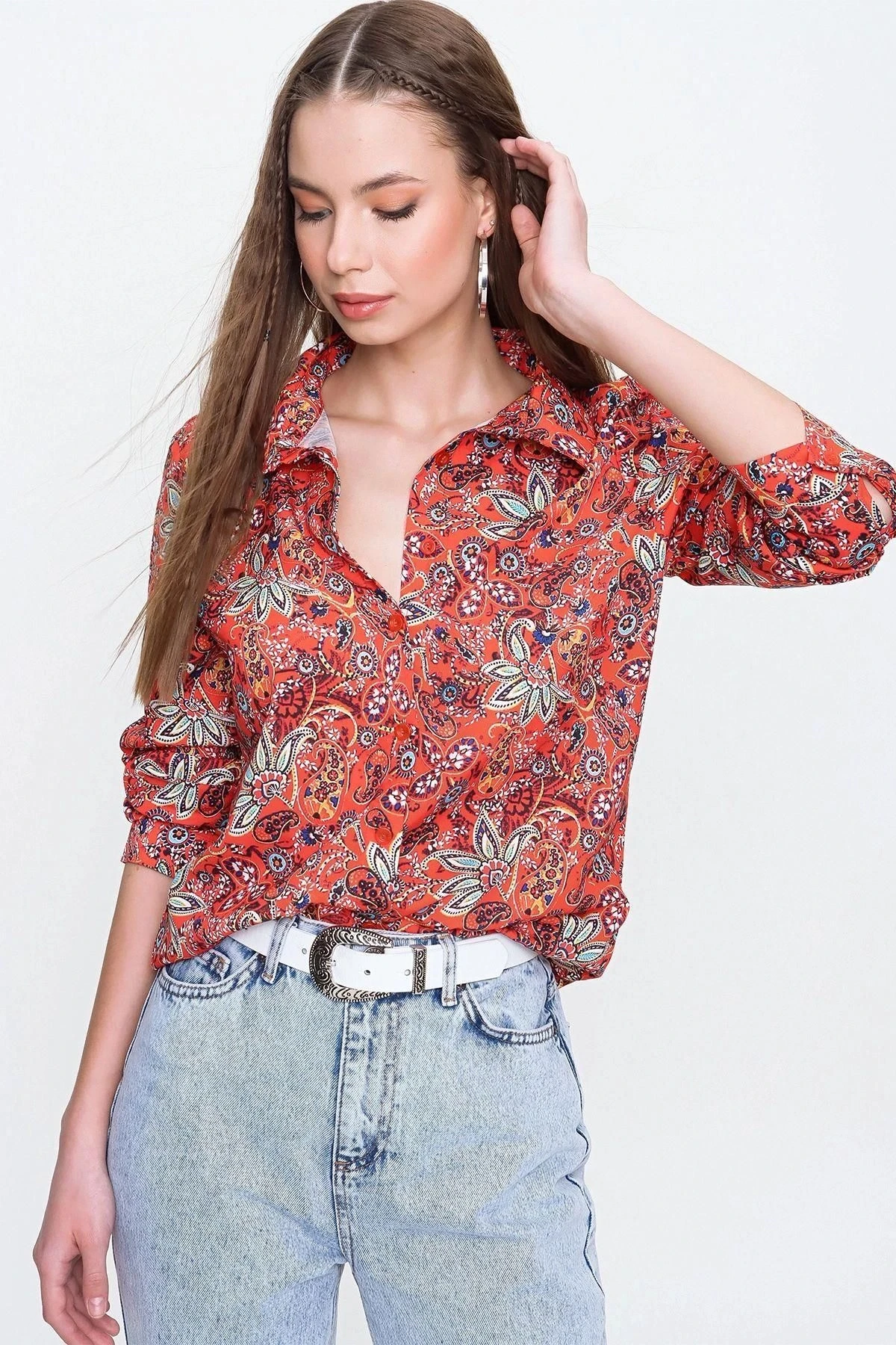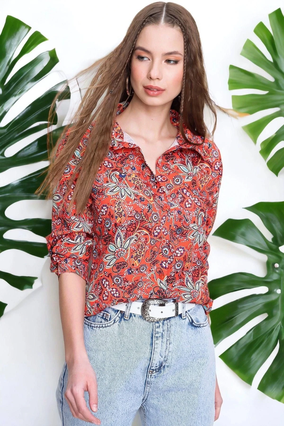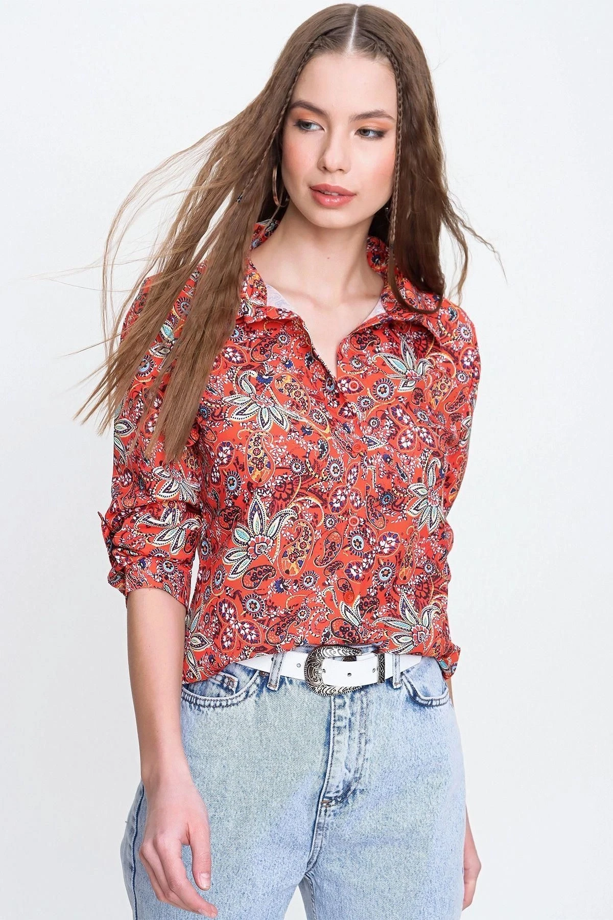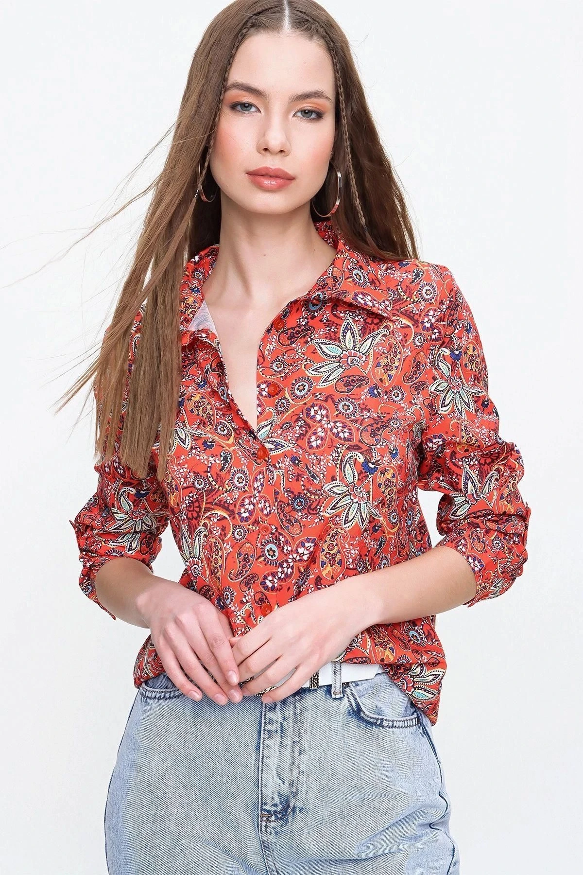 Bu kırmızı renkli klasik yaka çiçek desenli gömlek, zarif ve şık bir görünüm sunmak için özel olarak tasarlanmıştır.; Regular kesimiyle vücut hatlarınıza mükemmel uyum sağlar ve standart boyuyla her bedene uygunluk sağlar.; Gömleğin kumaş içeriği %100 polyesterdir, bu da hem dayanıklılık sağlar hem de kolay bakım imkanı sunar.; Polyester kumaş, kırışıklıklara dayanıklıdır ve uzun süreli kullanımda bile formunu korur.; Ayrıca, kumaşın nefes alabilir özelliği sayesinde rahat bir giyim deneyimi sunar.; Kırmızı renk, bu gömleği enerjik ve canlı kılar.; Cesur ve dikkat çekici bir renk olan kırmızı, tarzınıza özgüven ve canlılık katar.; Gömleğin üzerindeki çiçek deseni ise feminen bir hava yaratır ve kombinlerinize sofistike bir dokunuş ekler.; Klasik yaka tasarımı, gömleği daha resmi bir görünümle tamamlar.; Bu yaka stili, gömleği farklı etkinliklerde veya günlük hayatta rahatlıkla kullanmanızı sağlar.; Hem iş görüşmelerinde hem de özel davetlerde şık bir tercih olabilirsiniz.; Bu gömlek, kalıp ve tasarımıyla öne çıkan bir seçenektir.; Regular kesimi, rahat bir oturuş sağlarken vücut hatlarınızı zarif bir şekilde vurgular.; Standart boyu ise her bedene uygunluk sağlar.; Bu gömleği dolabınızda her zaman pratik bir tercih olarak bulundurabilirsiniz.; Tüm bu özelliklerle, kırmızı renkli çiçek desenli gömlek, tarzınıza renk ve şıklık katacak mükemmel bir seçenektir.; Kumaş kalitesi, tasarım detayları ve uyumuyla sizi memnun edecek bir giyim deneyimi sunar.