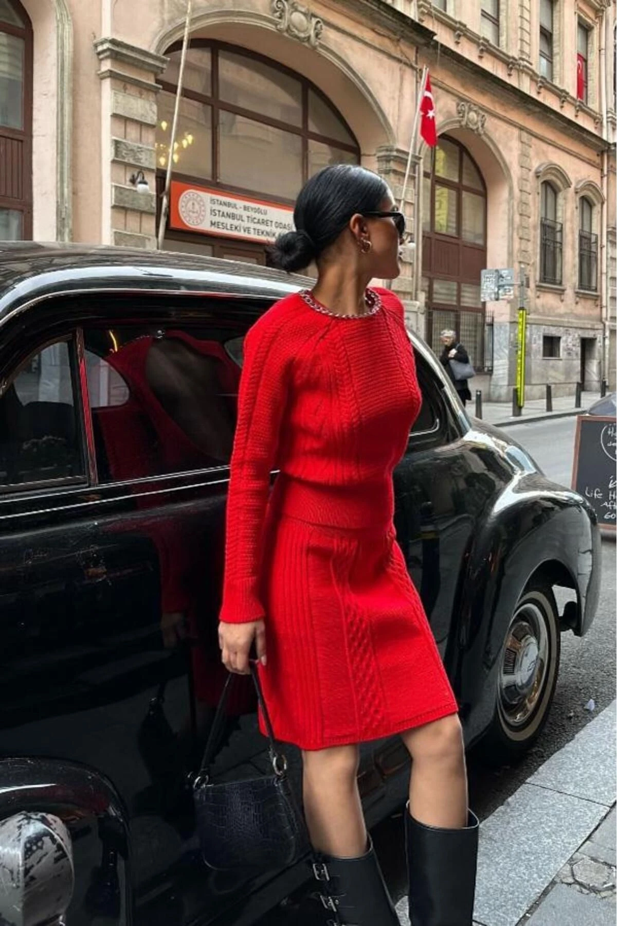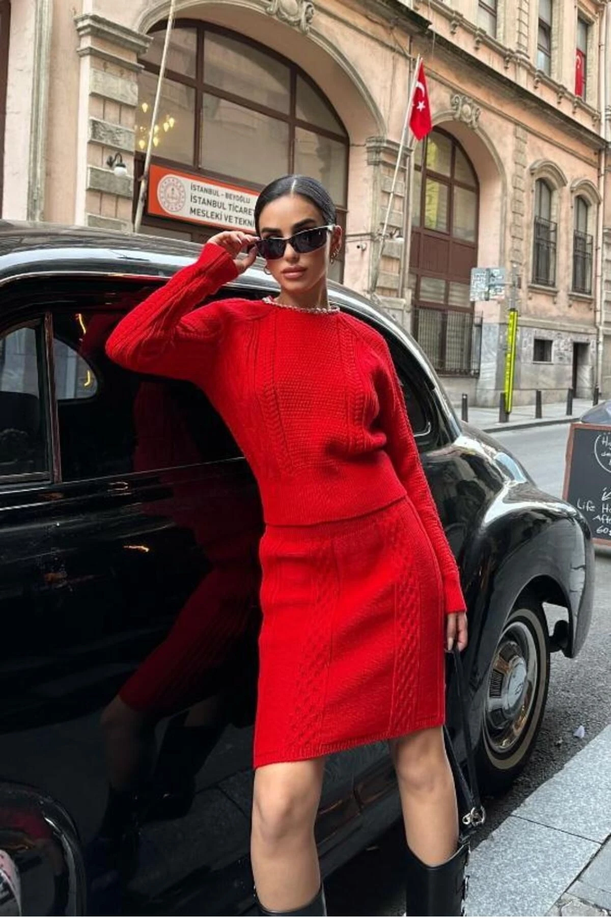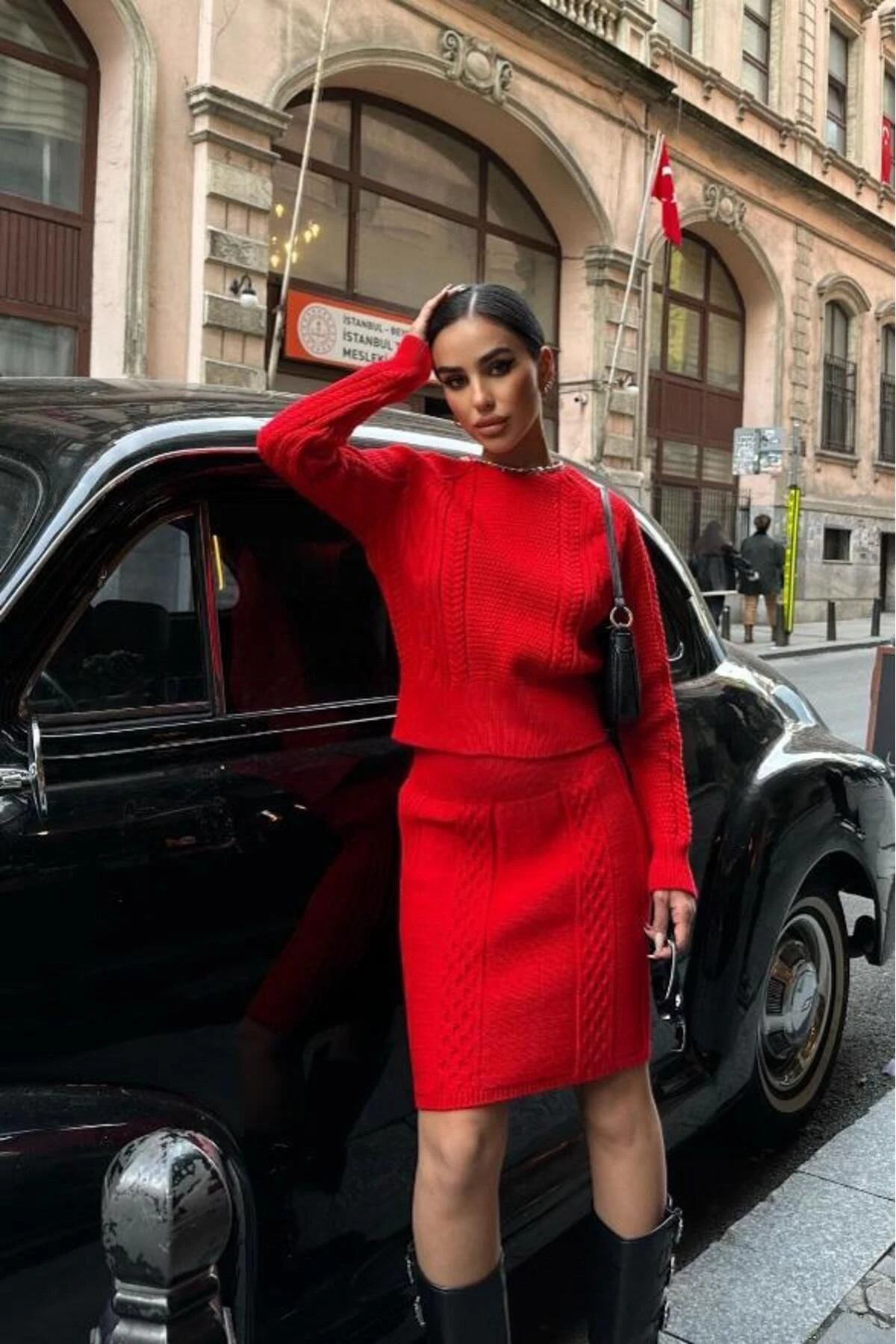 Kadın Kırmızı Örme Slim Bisiklet Yaka Uzun Kollu Takım