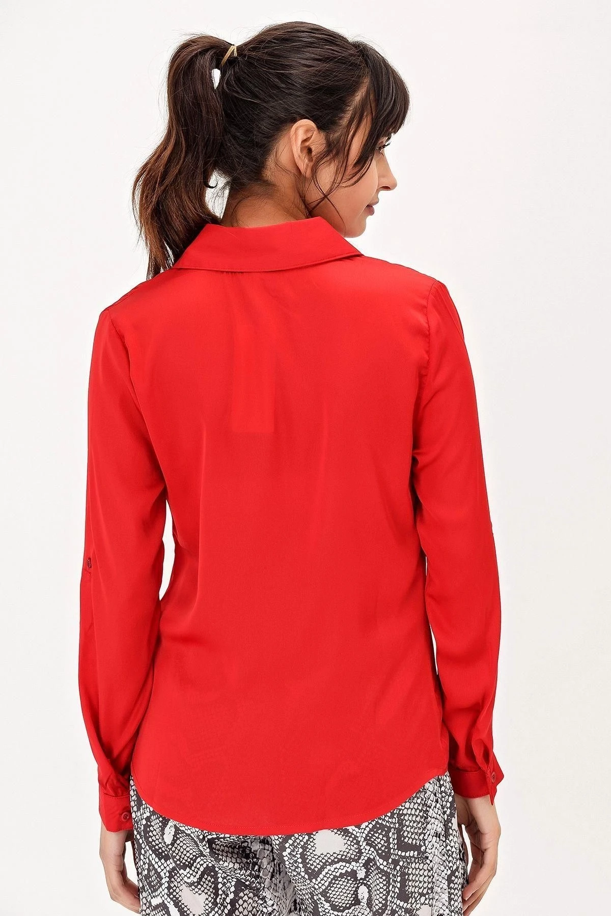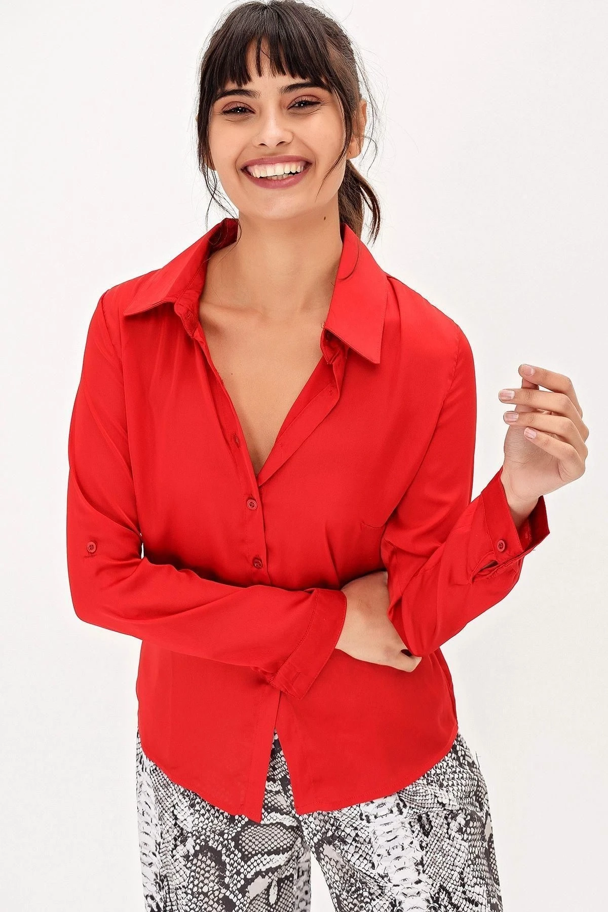 Kadın Kırmızı Rahat Klasik Yaka Uzun Kol düz kesim Standart Boy Gömlek