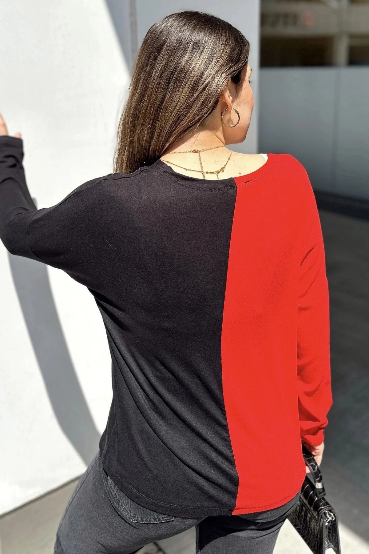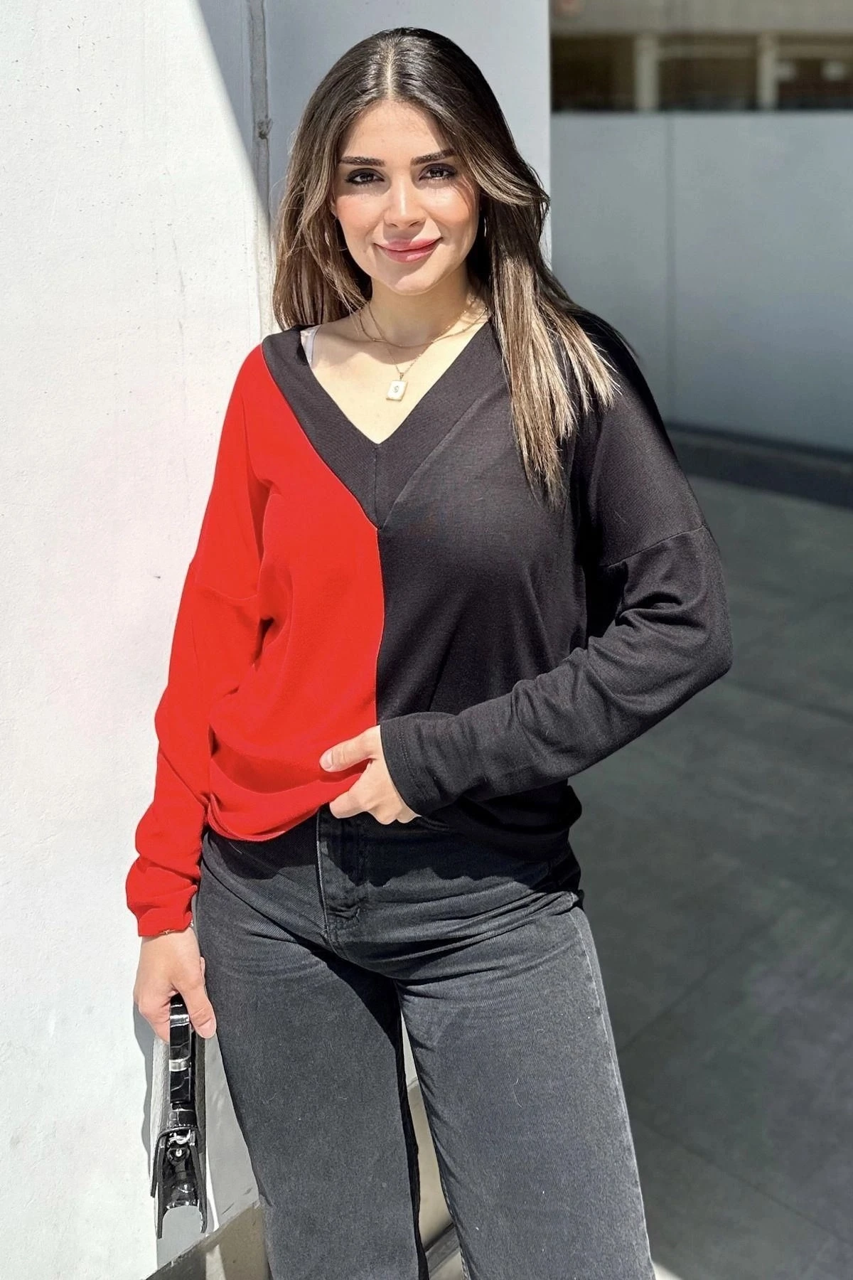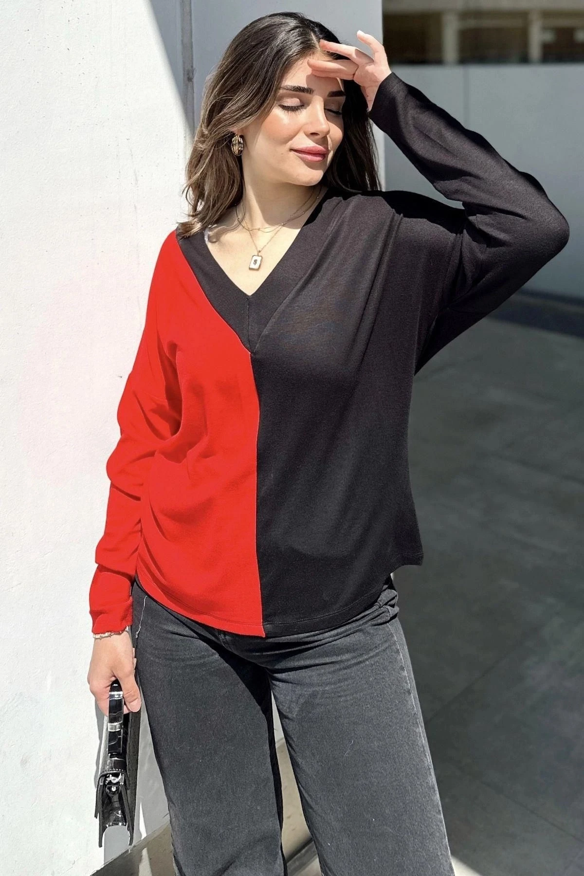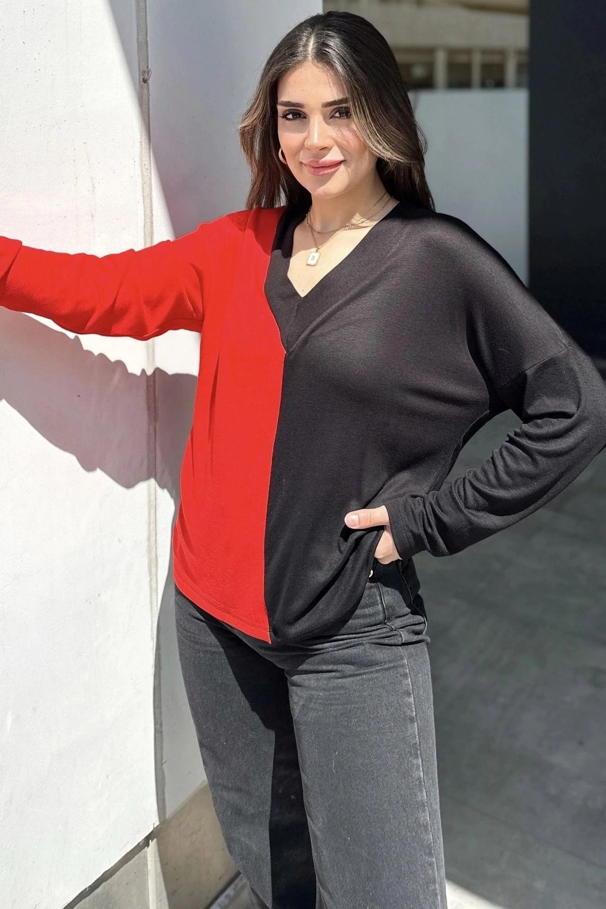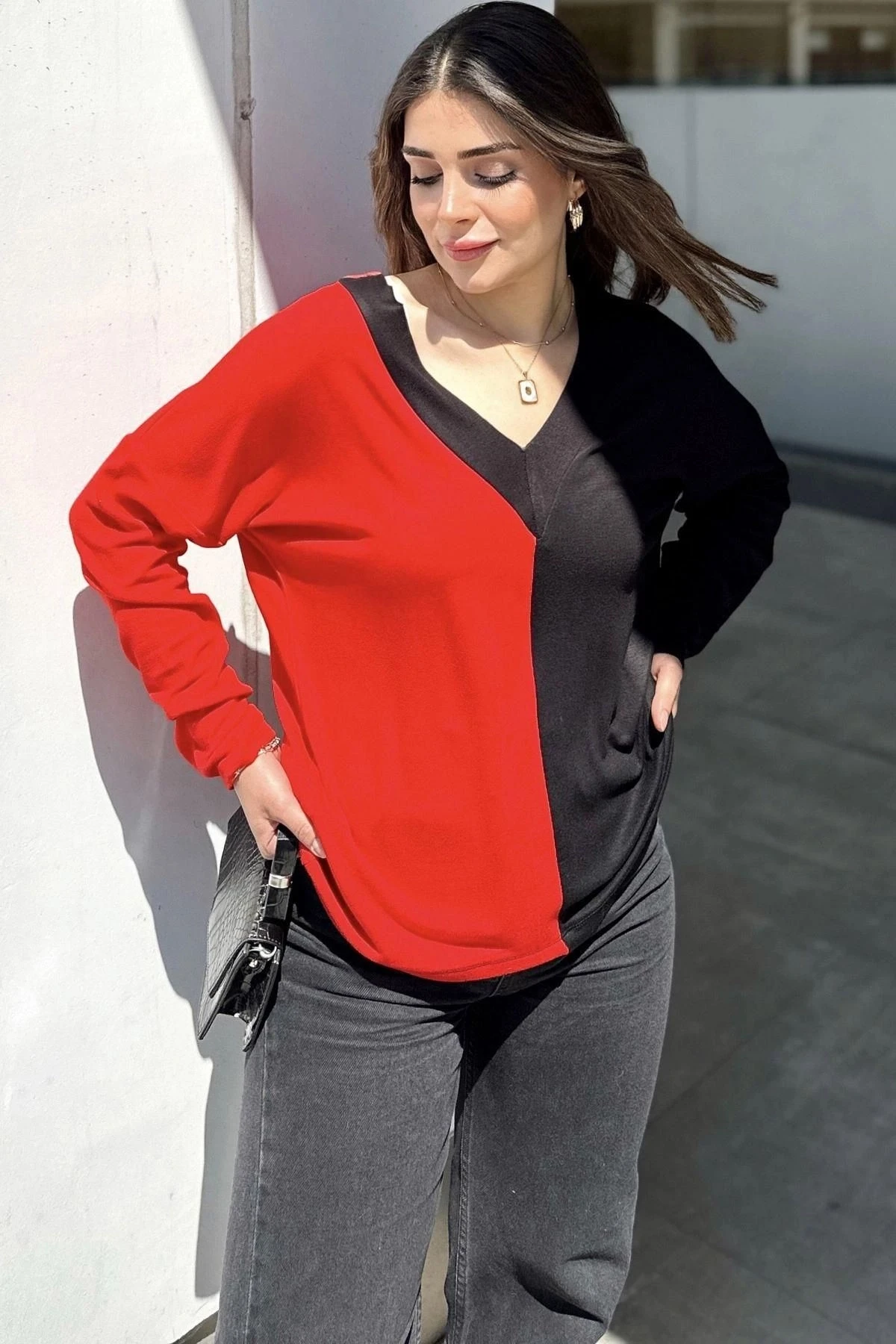 Kadın Kırmızı & Siyah Blok Renkli, V Yaka, Uzun Kollu, Pamuklu Salaş Bluz