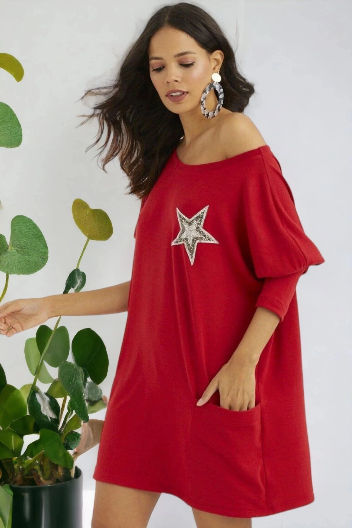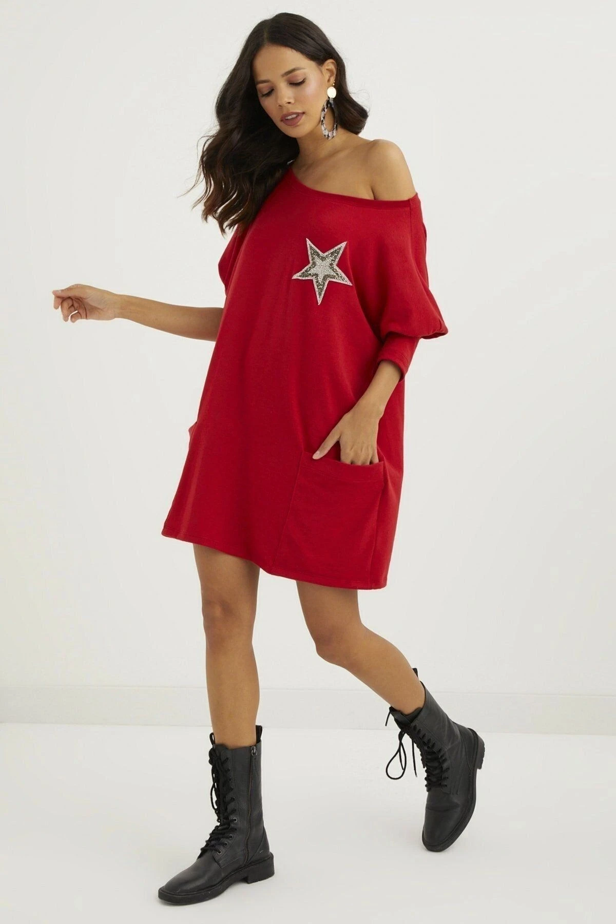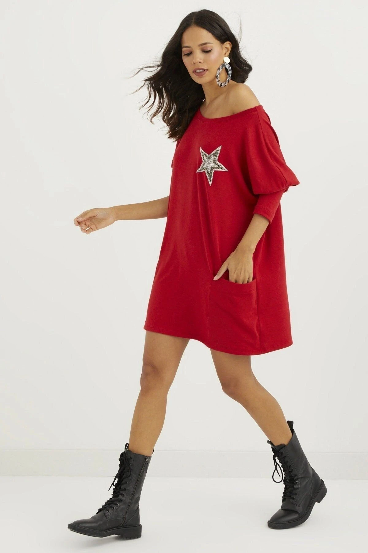Kadın Kırmızı Straplez Yaka Balon Kol Yıldız Detaylı Oversize Kesim Mini Kısa Tunik Elbise