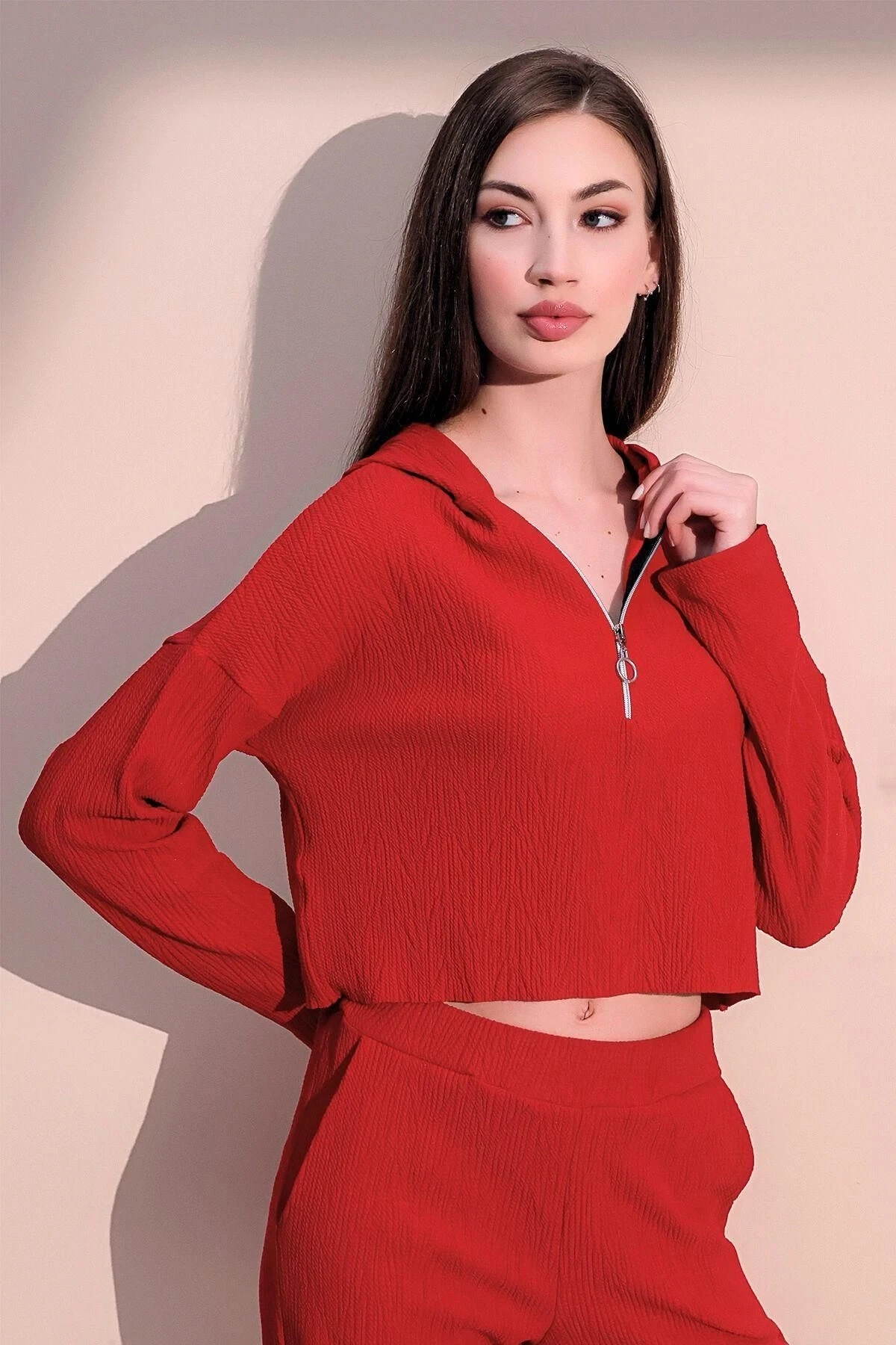 Bu muhteşem sweatshirt bluz, göz alıcı kırmızı renkte tasarlanmıştır.; Renk seçimi, enerji dolu ve canlı bir görünüm sunarak tarzınıza hareket katmaktadır.; Üstün kaliteli malzeme seçimiyle üretilmiştir ve kumaş içeriği %95 Polyester ve %5 Elastane'den oluşmaktadır.; Polyester, dayanıklı ve esnek yapısıyla giyim konforunu en üst seviyeye taşırken, Elastane eklenerek sweatshirtün şeklini koruması ve hareket özgürlüğü sağlanmıştır.; Bu sweatshirt bluzda kendinden desenli bir tasarım yer almaktadır.; Şık ve dikkat çekici desenler, ürünün benzersizliğini vurgulamakta ve tarzınıza özgünlük katmaktadır.; Kendinden desenli olması sayesinde ayrıca herhangi bir ekstra aksesuar veya süslemeye ihtiyaç duymazsınız, tek başına dikkat çekici bir görünüm sunar.; Bluzun uzun kol ve fermuarlı kapüşonlu tasarımı, hem şıklığı hem de işlevselliği bir araya getirir.; Uzun kollar, üstün konfor ve sıcaklık sağlarken, fermuarlı kapüşon, soğuk havalarda ek koruma sağlar ve stilinizi tamamlar.; Bu sweatshirt bluz, bir crop kesime sahiptir, yani bel hizasında sonlanır.; Bu modern kesim, tarzınıza genç ve trend bir hava katar.; Crop tasarımı, yüksek bel pantolonlar veya eteklerle mükemmel bir uyum sağlayarak çarpıcı bir kombin oluşturmanızı sağlar.; Özetlemek gerekirse, bu kırmızı renkli sweatshirt bluz, %95 Polyester ve %5 Elastane kumaş içeriğiyle üstün konfor sağlar.; Kendinden desenli tasarımıyla benzersiz bir tarz sunarken, uzun kol ve fermuarlı kapüşonu ile işlevselliği ön planda tutar.; Crop kesimiyle modern ve trend bir görünüm elde etmenizi sağlar.; Bu sweatshirt bluz, gardırobunuzun vazgeçilmez bir parçası olacak ve her seferinde şıklığınızı ön plana çıkaracaktır.