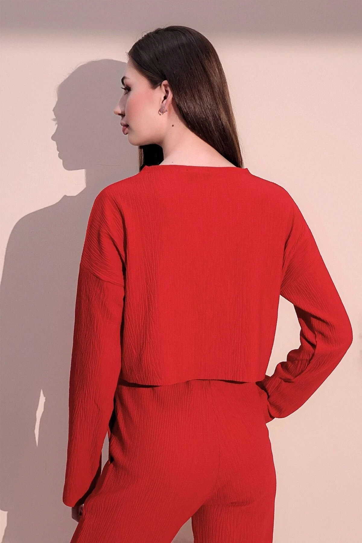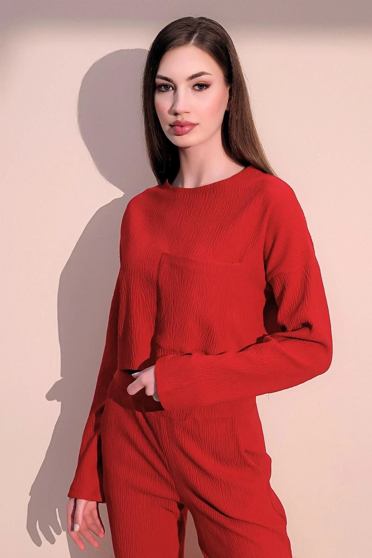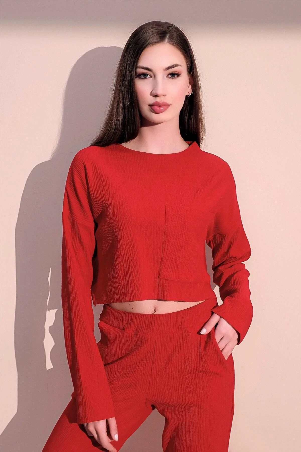 Bu muhteşem Kırmızı Renk Uzun Kol Kendinden Dokulu Cepli Crop Sweatshirt, Salaş Kesim Bluz, tarzınızı yansıtmak ve kendinizi rahat hissetmek için mükemmel bir seçenektir.; Bu sweatshirt, %95 Polyester ve %5 Elastan içeriği sayesinde yüksek kalitede bir kumaşa sahiptir.; Kırmızı renk, enerji dolu ve canlı bir ifade sunar.; Bu sweatshirt, cesur ve çarpıcı bir görünüm elde etmenize yardımcı olacak.; Uzun kollu tasarımı, soğuk havalarda sıcak tutarken, salaş kesimi ile rahat bir his sağlar.; Crop stili ise modern ve trendi yakalamanızı sağlar.; Sweatshirt'ün kendinden dokulu yapısı, stilinize ilgi çekici bir dokunuş katar.; Bu dokulu detaylar, göz alıcı bir görünüm sunarken, sweatshirt'ü sıradanlıktan uzaklaştırır.; Ek olarak, cepli tasarımı, kullanışlılık sağlar ve küçük eşyalarınızı güvenli bir şekilde saklamanızı sağlar.; Bu ürün, hem günlük hayatta rahatlıkla giyilebilecek hem de özel etkinliklerde tarzınızı tamamlayacak şekilde tasarlanmıştır.; Kıyafetinizi tamamlayan bu sweatshirt, hem şık hem de rahat olmanızı sağlar.; Eğer tarzınızı yansıtan bir sweatshirt arıyorsanız, bu Kırmızı Renk Uzun Kol Kendinden Dokulu Cepli Crop Sweatshirt tam size göre! Kaliteli kumaşı, cesur rengi ve şık tasarımı ile dikkatleri üzerinize çekeceksiniz.