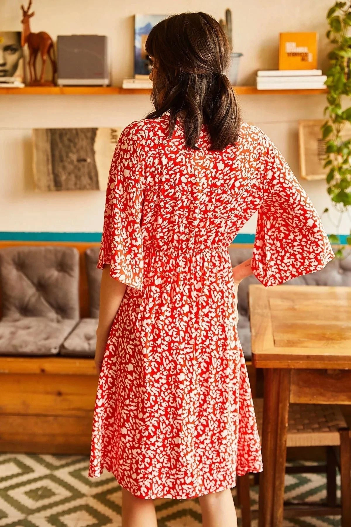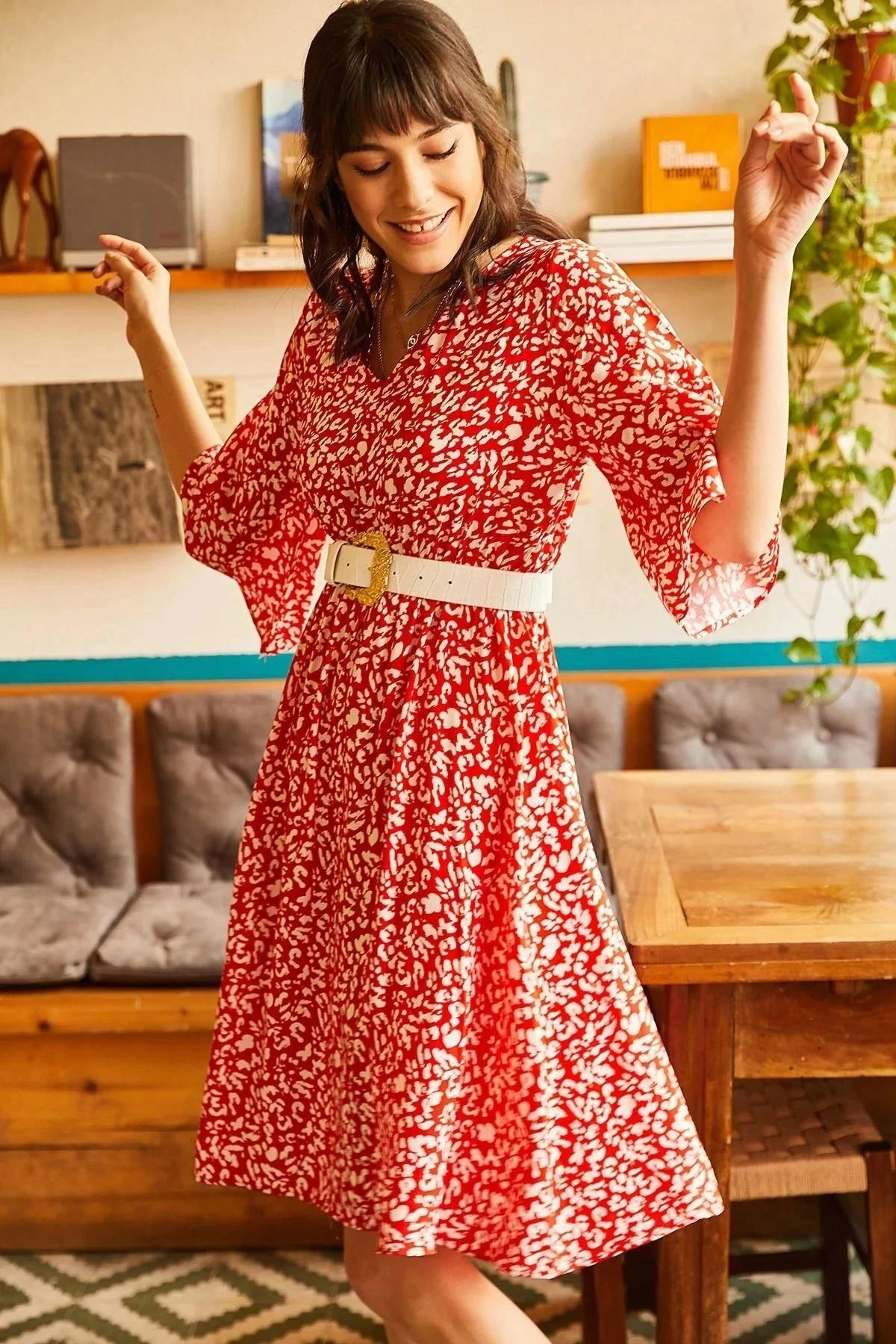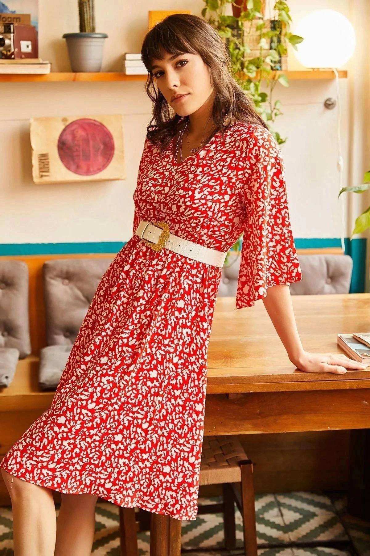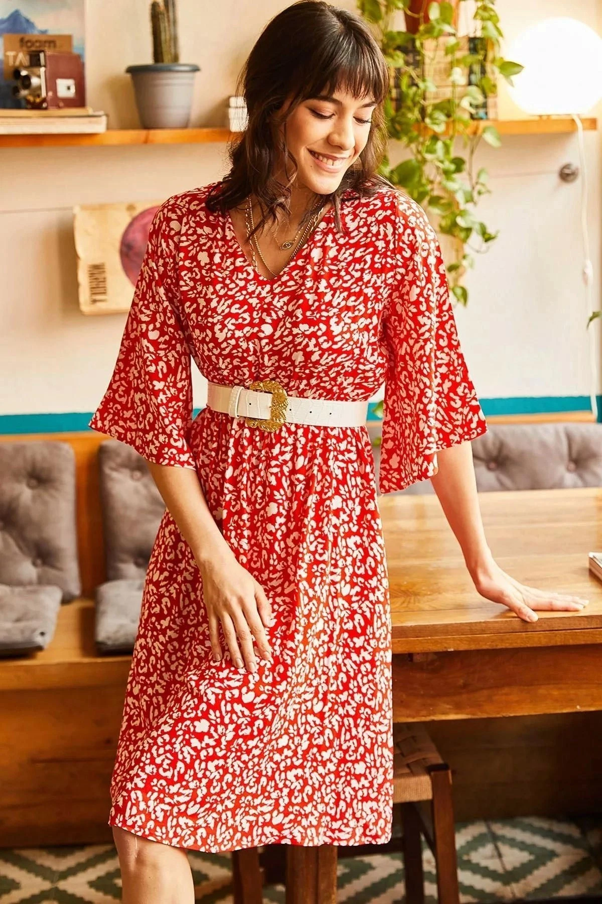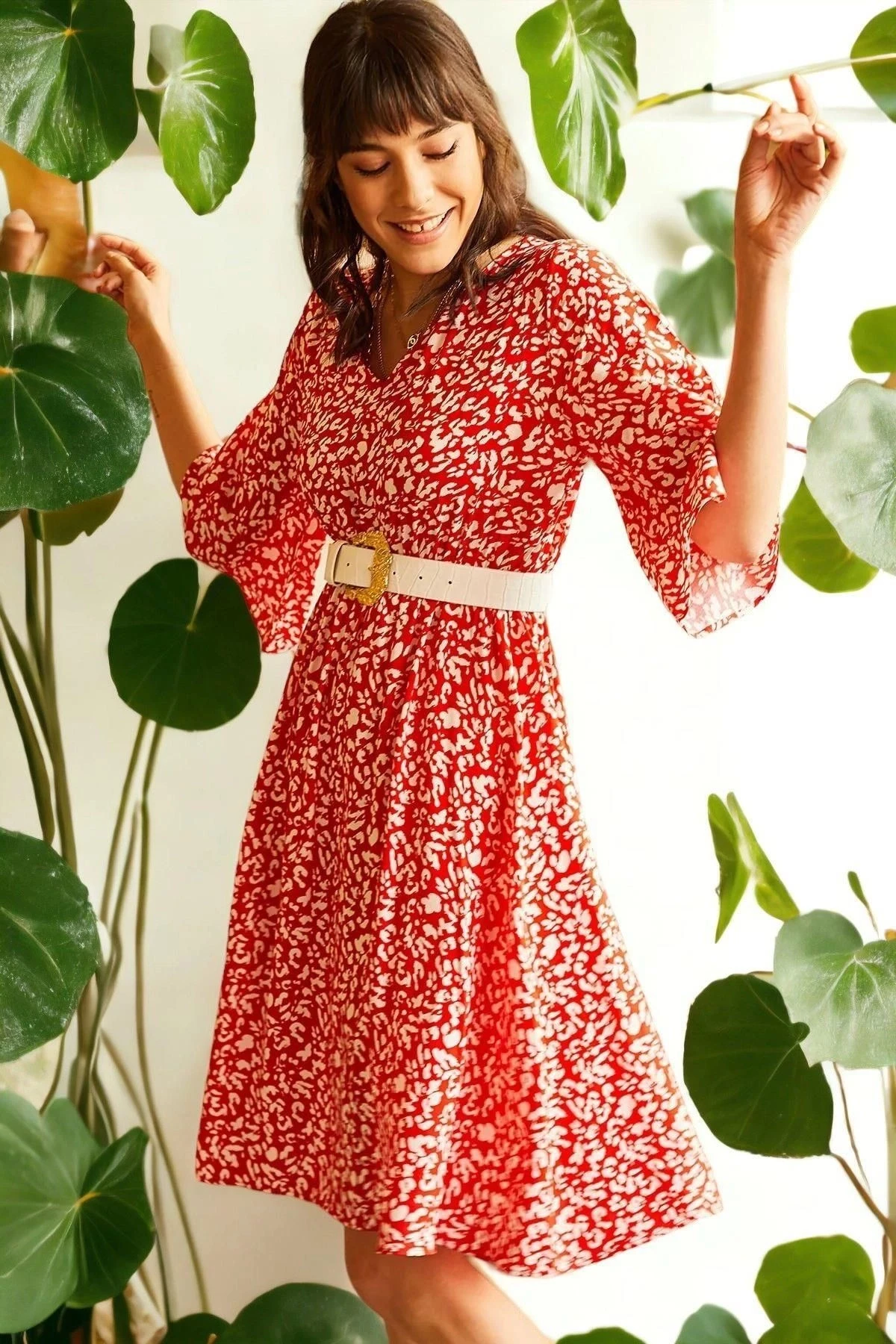 Bu zarif ve şık kırmızı renkli V yaka elbise, gardırobunuzun yeni favorisi olmaya aday! Çiçek desenleriyle süslenmiş olan bu elbise, feminen bir tarzı mükemmel bir şekilde yansıtıyor.; Kısa kollu tasarımıyla yaz aylarında serin ve rahat bir seçenek sunarken, kaliteli kumaşıyla da uzun süreli kullanım sağlıyor.; Elbisenin kaliteli kumaşı, %95 viskoz ve %5 elastan içeriğiyle öne çıkıyor.; Bu karışım, yumuşak ve esnek bir dokunuş sunarken, aynı zamanda dayanıklılık ve şekil koruma sağlar.; Kumaşın hafif ve nefes alabilen yapısı, gün boyu rahatlık ve serinlik sunar.; Midi boyuyla diz üstünde sonlanan bu elbise, ofis ortamında ve günlük hayatta şık bir görünüm elde etmek için ideal bir seçenektir.; Kırmızı renk, özgüveninizi yansıtan ve enerji dolu bir ifade sunan canlı bir seçimdir.; Çiçek desenleri, elbiseye zarif bir dokunuş katarak taze ve feminen bir hava katmaktadır.; V yaka detayı, boyun bölgesini zarif bir şekilde vurgularken, A kesimli modeli ise her vücut tipine uyum sağlayacak şekilde tasarlanmıştır.; Bu elbise, her mevsimde ve her fırsatta şık bir tercih olacaktır.; Ofis ortamında profesyonel bir görünüm elde etmek için mükemmel bir seçimdir.; Aynı zamanda günlük hayatta da stil sahibi olmak isteyenler için pratik ve şık bir seçenektir.; Bu kırmızı renkli, çiçek desenli, kısa kollu elbise, gardırobunuzun vazgeçilmez parçalarından biri olacak.; Kaliteli kumaşı, benzersiz tasarımı ve zarif detaylarıyla sizi etkileyecek.; Hem şık hem de rahat olmak istediğinizde bu elbiseyi tercih edebilirsiniz.