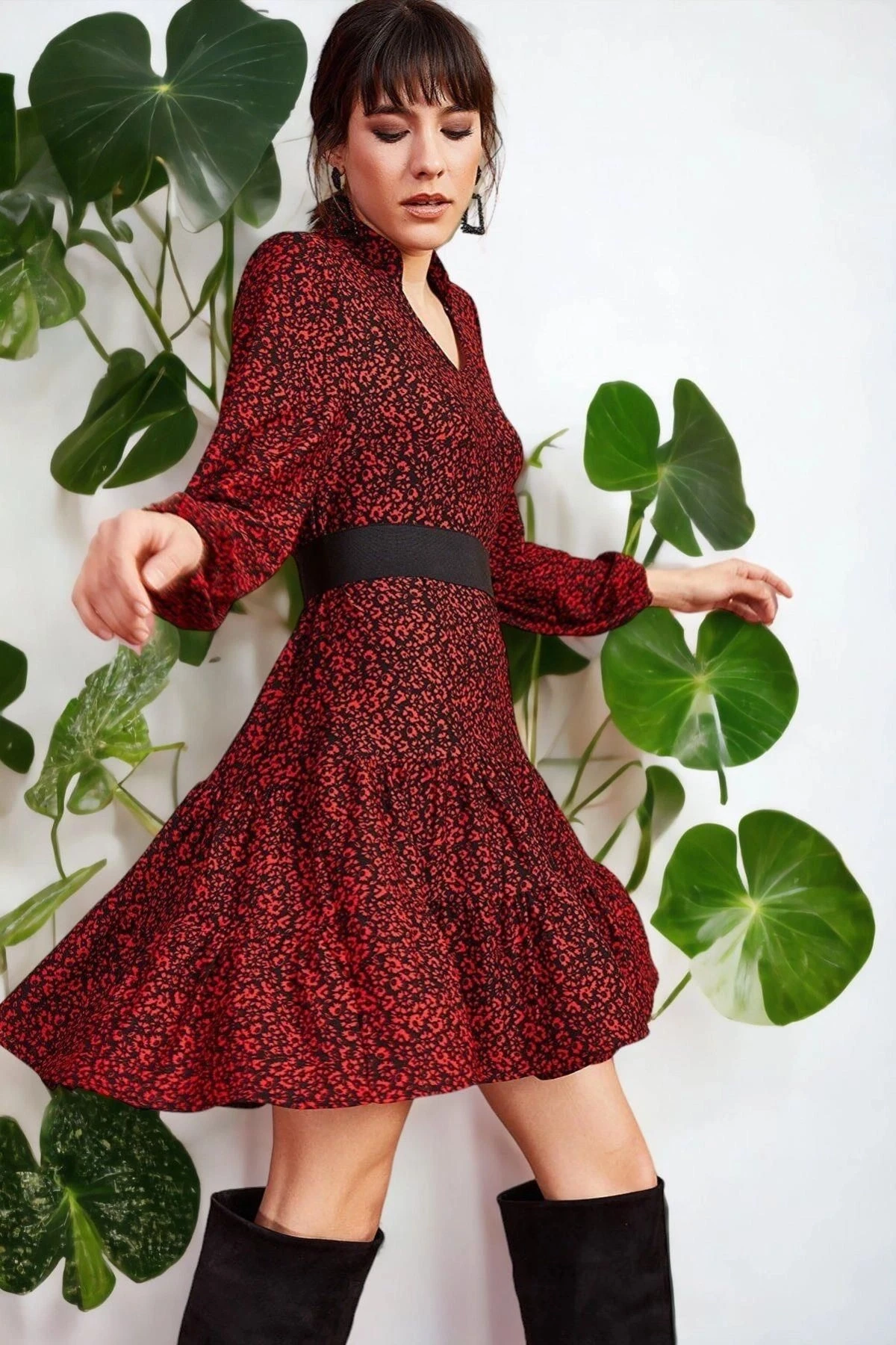 Kadın Kırmızı V Yaka Uzun Kol Volan Detaylı Kemeriyle Regular Kesim Midi Boy Diz üstü Elbise
