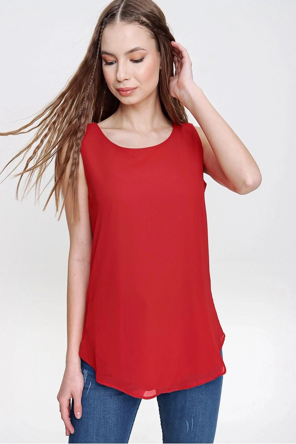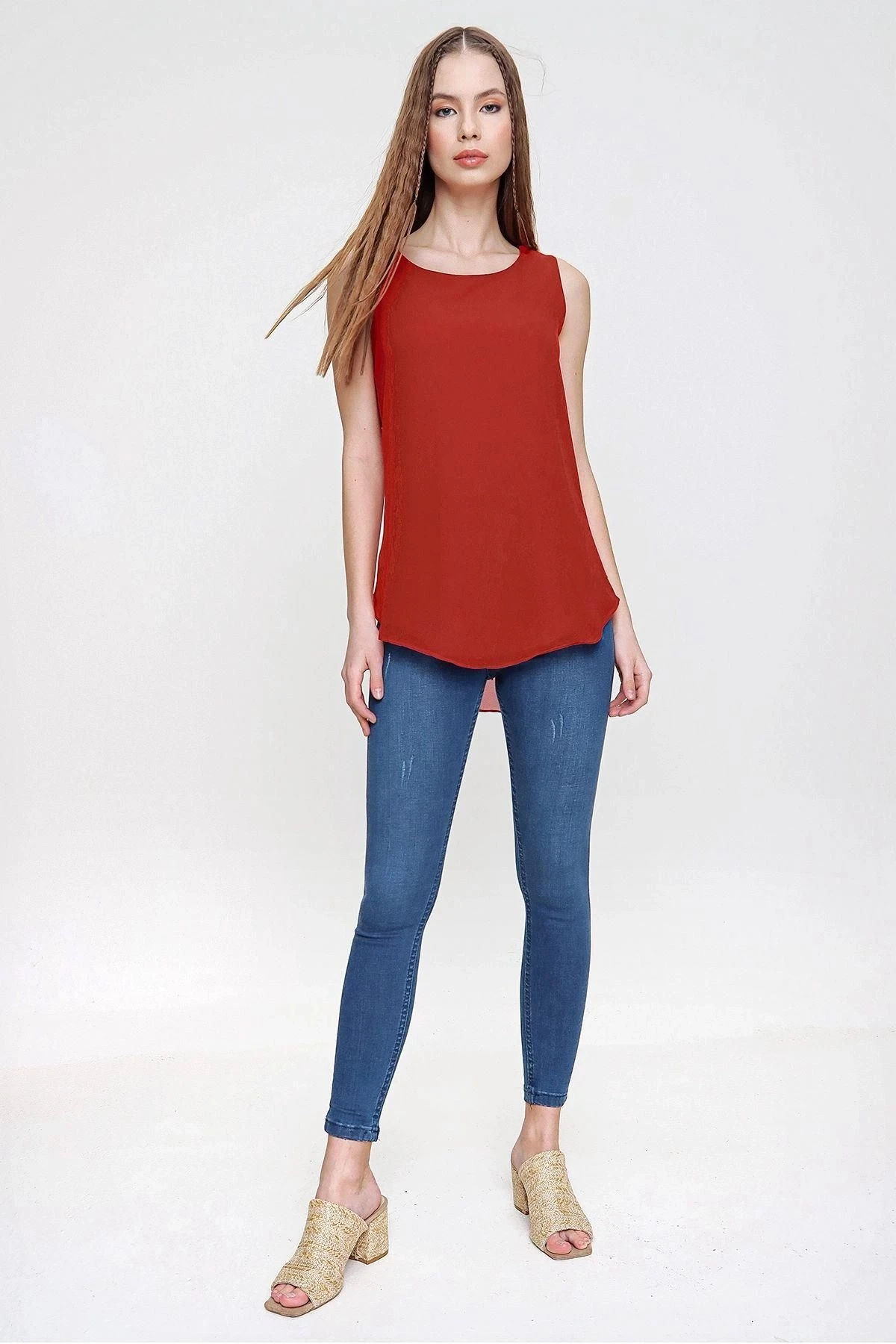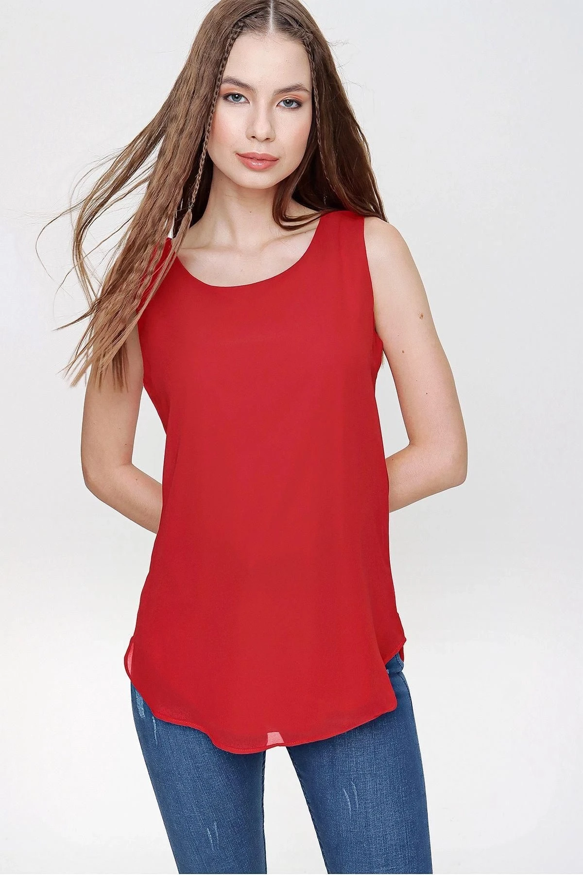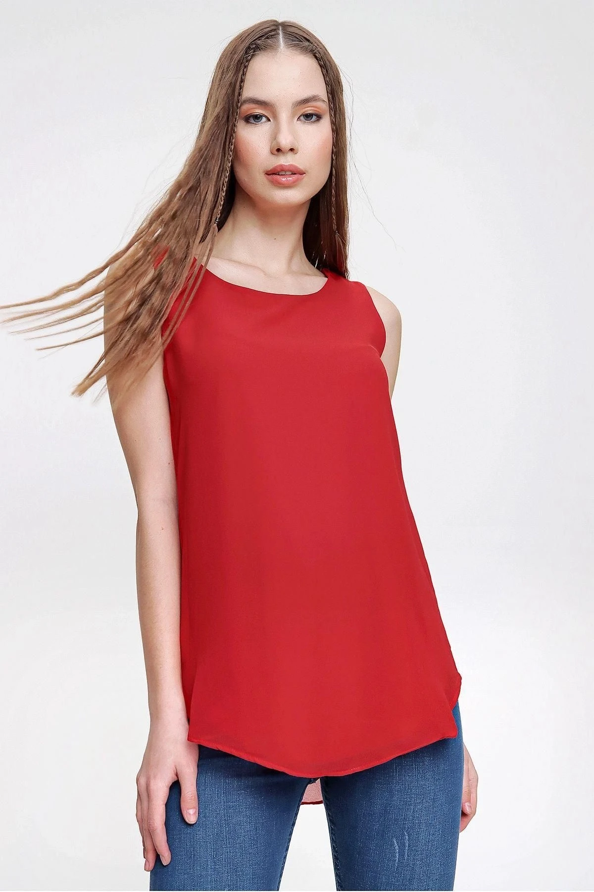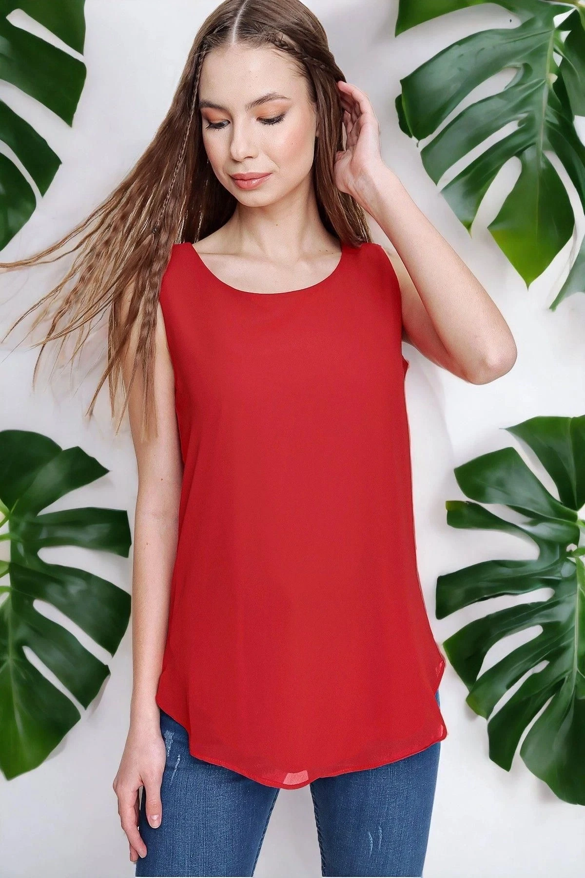 Şık ve zarif bir görünüm elde etmek isteyenler için Kırmızı Renk Yuvarlak Yaka Sıfır Kol Basic Bluz mükemmel bir seçenektir.; Bu bluz, günlük kullanıma uygun olan regular kesimi ve standart boyuyla rahatlık sunar.; Kumaş içeriği %95 pamuk ve %5 likra ile mükemmel bir denge sağlar.; Kumaşın kalitesi ve dokusu, rahatlık ve dayanıklılık sunar.; %95 pamuk içeriği, yumuşaklık ve nefes alabilirlik sağlar, böylece gün boyu konforlu hissedersiniz.; %5 likra, esneklik katıp bluzun hareket özgürlüğünü artırır.; Böylece, her hareketinizde rahat hissedersiniz.; Kırmızı renk, canlılık ve enerjiyi simgeler.; Bu bluzdaki kırmızı tonu, sizi öne çıkaracak ve her ortamda dikkat çekmenizi sağlayacak bir etki yaratır.; Klasik yuvarlak yaka tasarımı, her yaştan kadına uygun ve şık bir görünüm sunar.; Sıfır kol kesimi ise serinletici ve modern bir stil katarken, kolay kombinlenebilirlik sağlar.; Bu bluz, basic tasarımı sayesinde her mevsimde ve her farklı tarzla uyum sağlar.; Onu şortlar, etekler, pantolonlar veya ceketlerle kombinleyebilirsiniz.; Gündüz şık bir görünüm elde etmek için spor ayakkabılarla tamamlayabilir veya gece için topuklu ayakkabılarla kombinleyebilirsiniz.; Kısacası, Kırmızı Renk Yuvarlak Yaka Sıfır Kol Basic Bluz, kumaş kalitesi, canlı renk seçimi ve şık tasarımıyla gardırobunuzun vazgeçilmez parçalarından biri olacak.; Hem günlük kullanıma hem de özel durumlara uygun olmasıyla size çok yönlülük sunar.; Tarzınızı ve özgüveninizi yansıtan bir seçenek olan bu bluzu deneyimleyerek kendinizi özel hissedin.