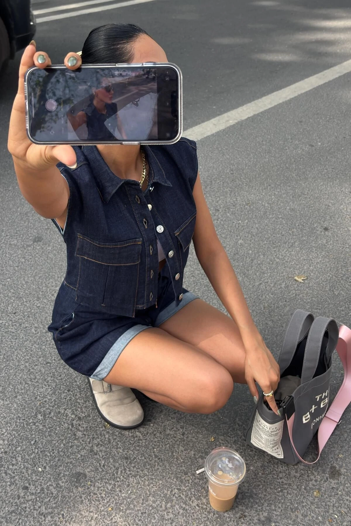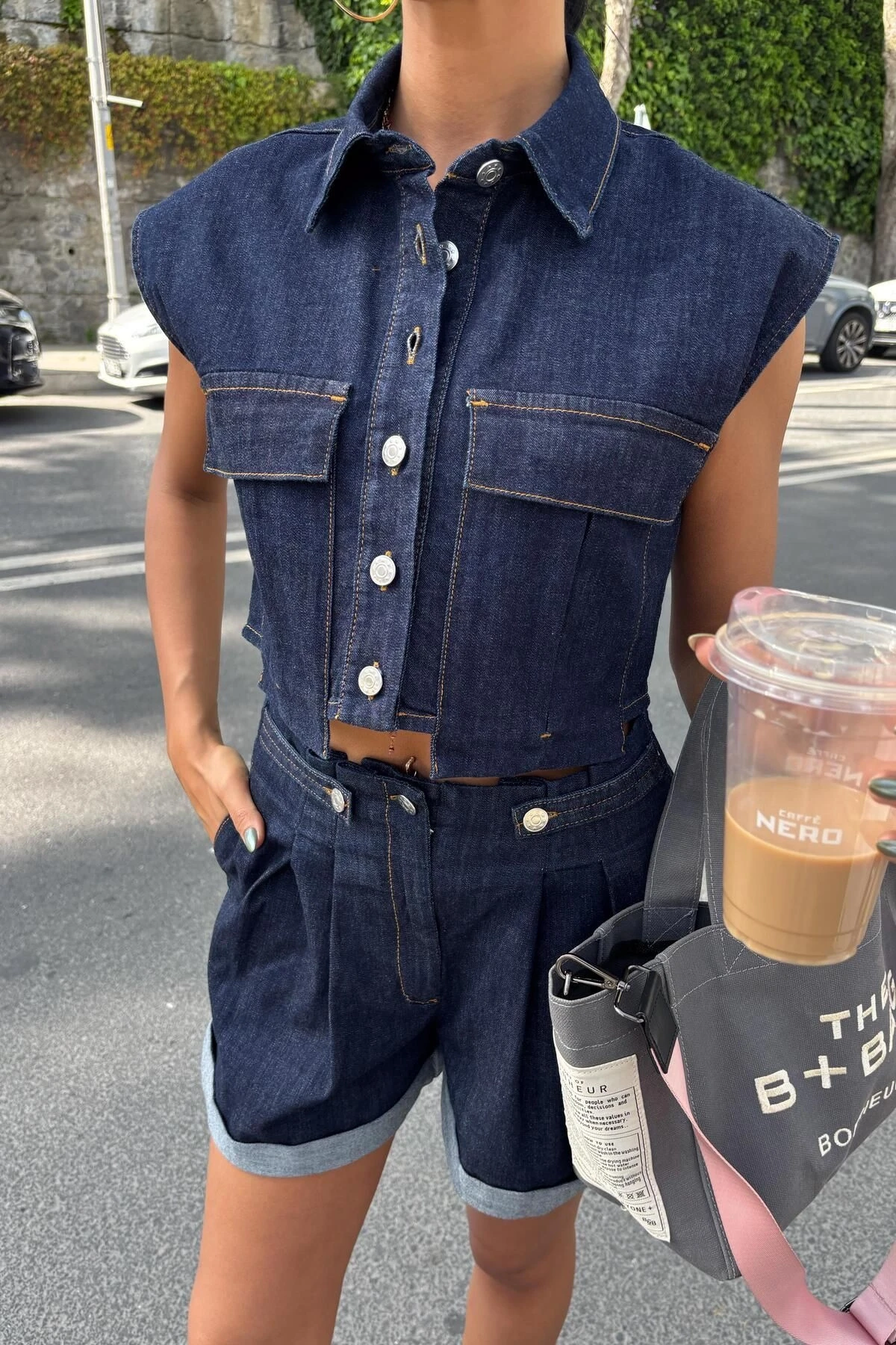 Kadın Kot Mavi Kolsuz Düz Denim İkili Takım