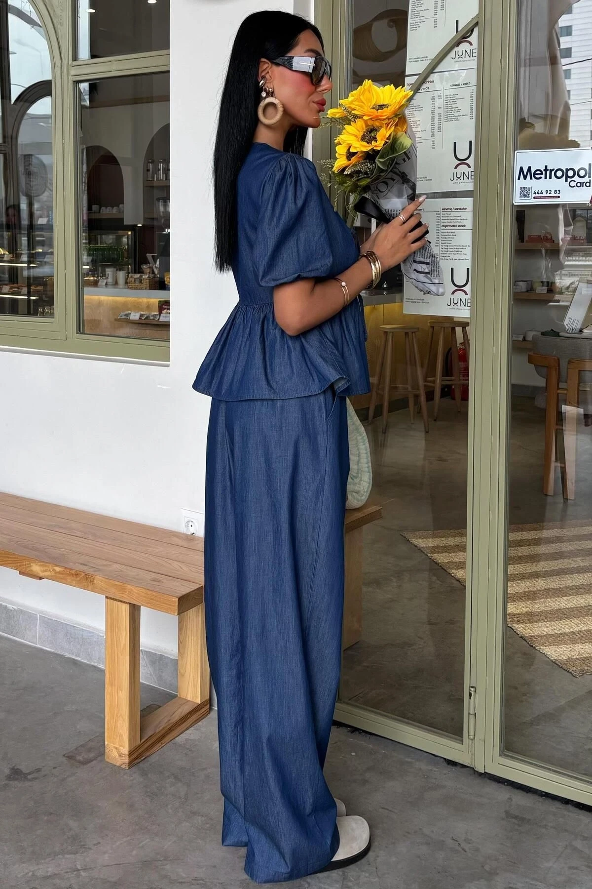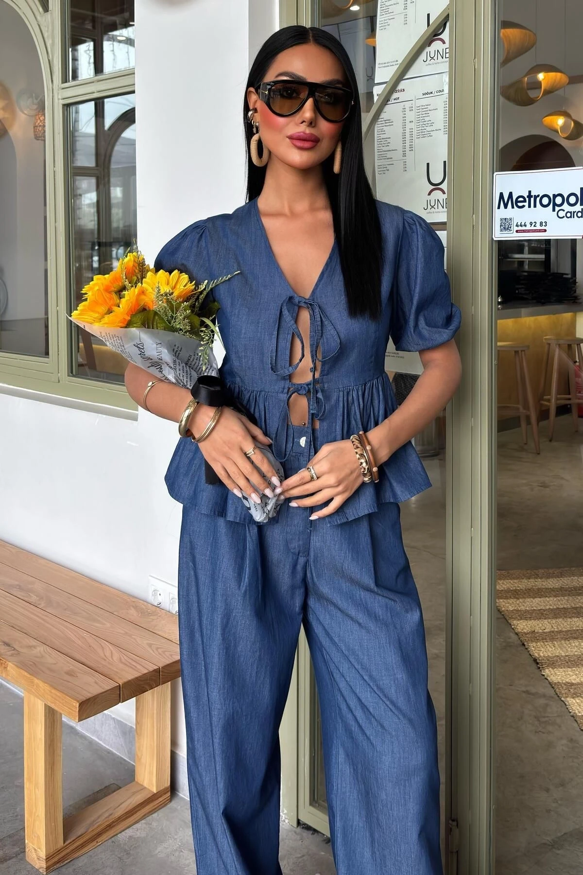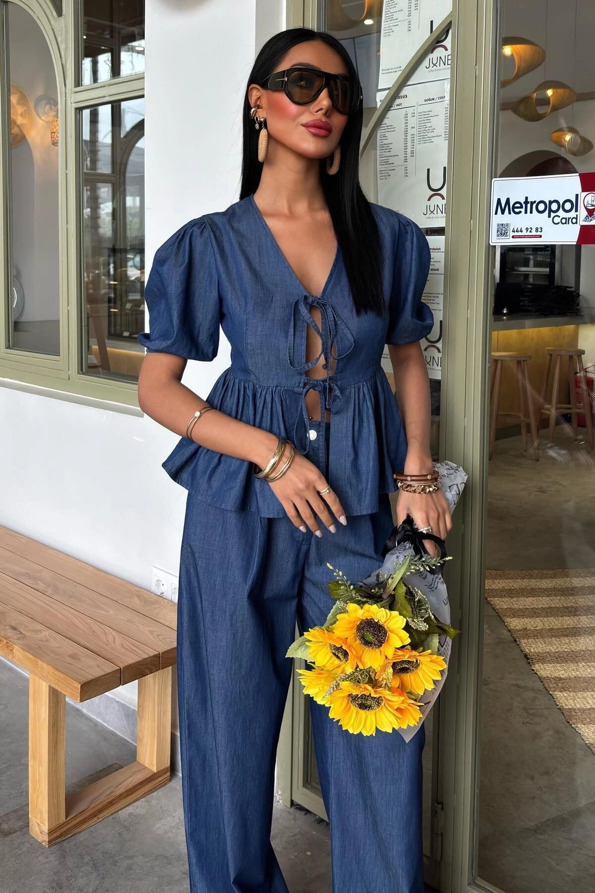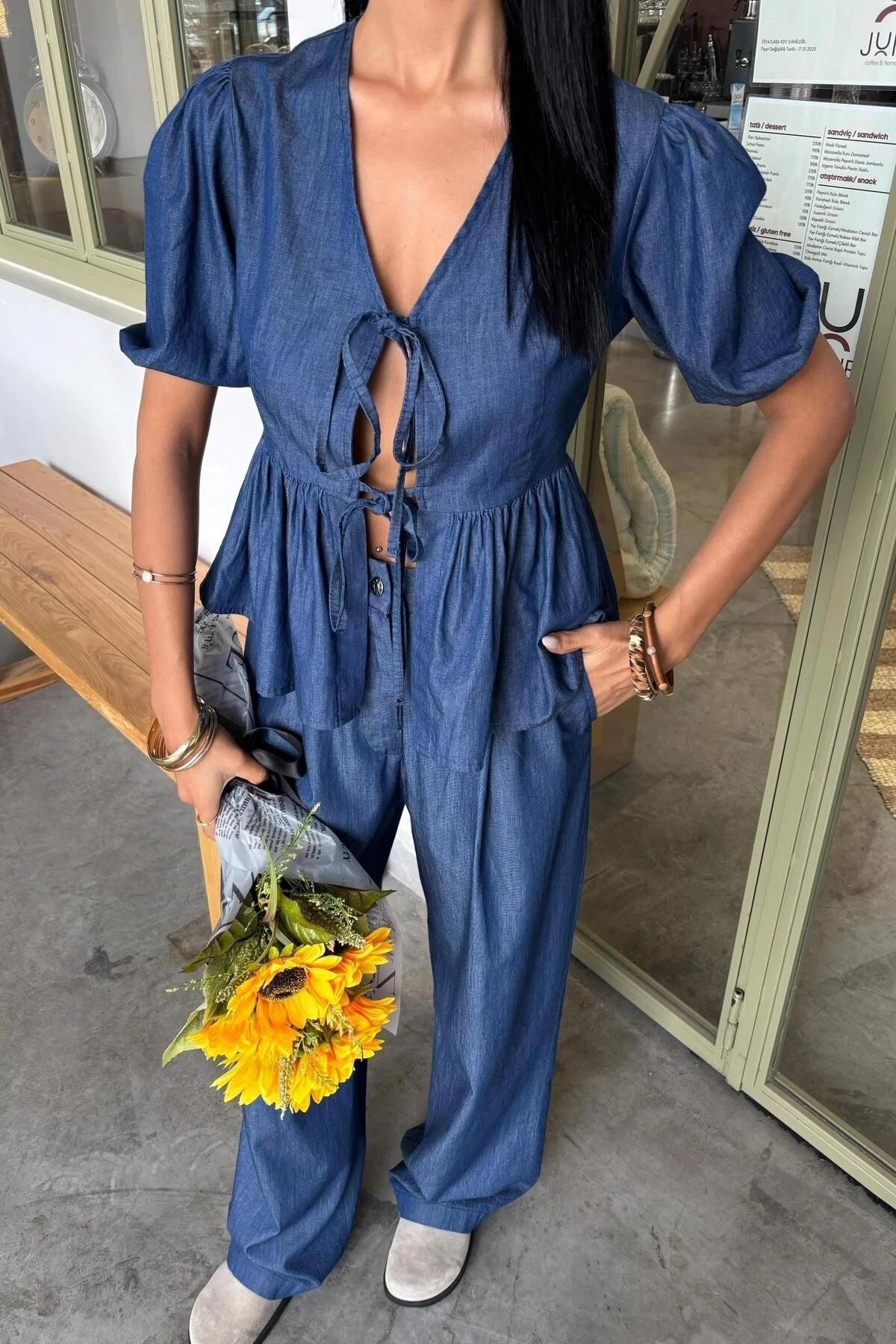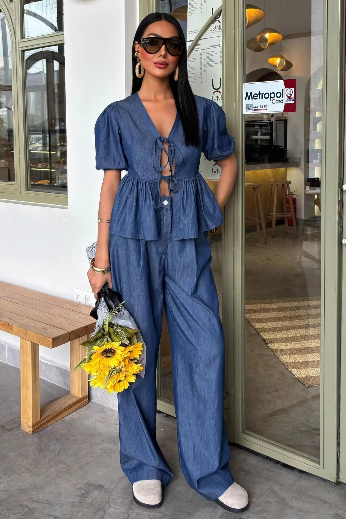 Kadın Kot Mavi V Yaka Pamuk Karpuz Kollu Uzun Takım