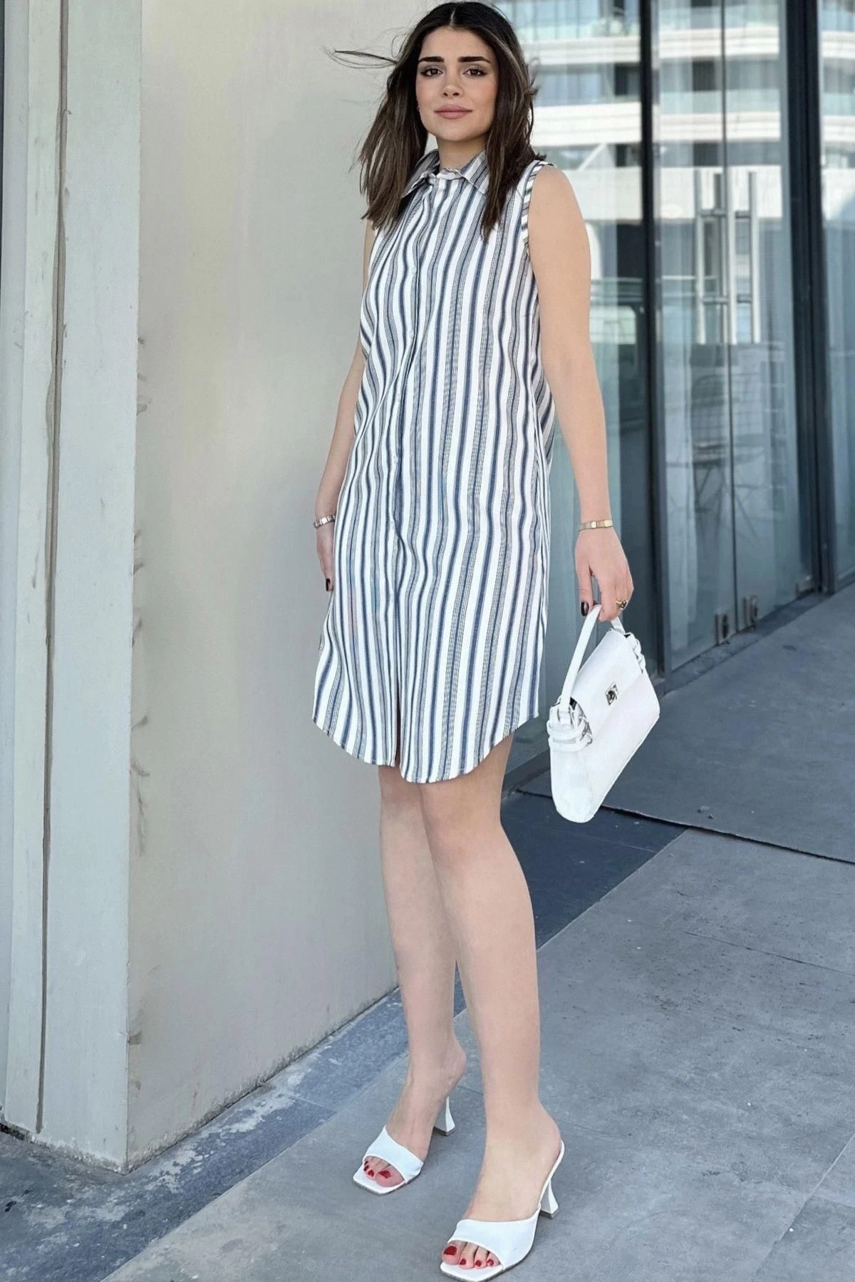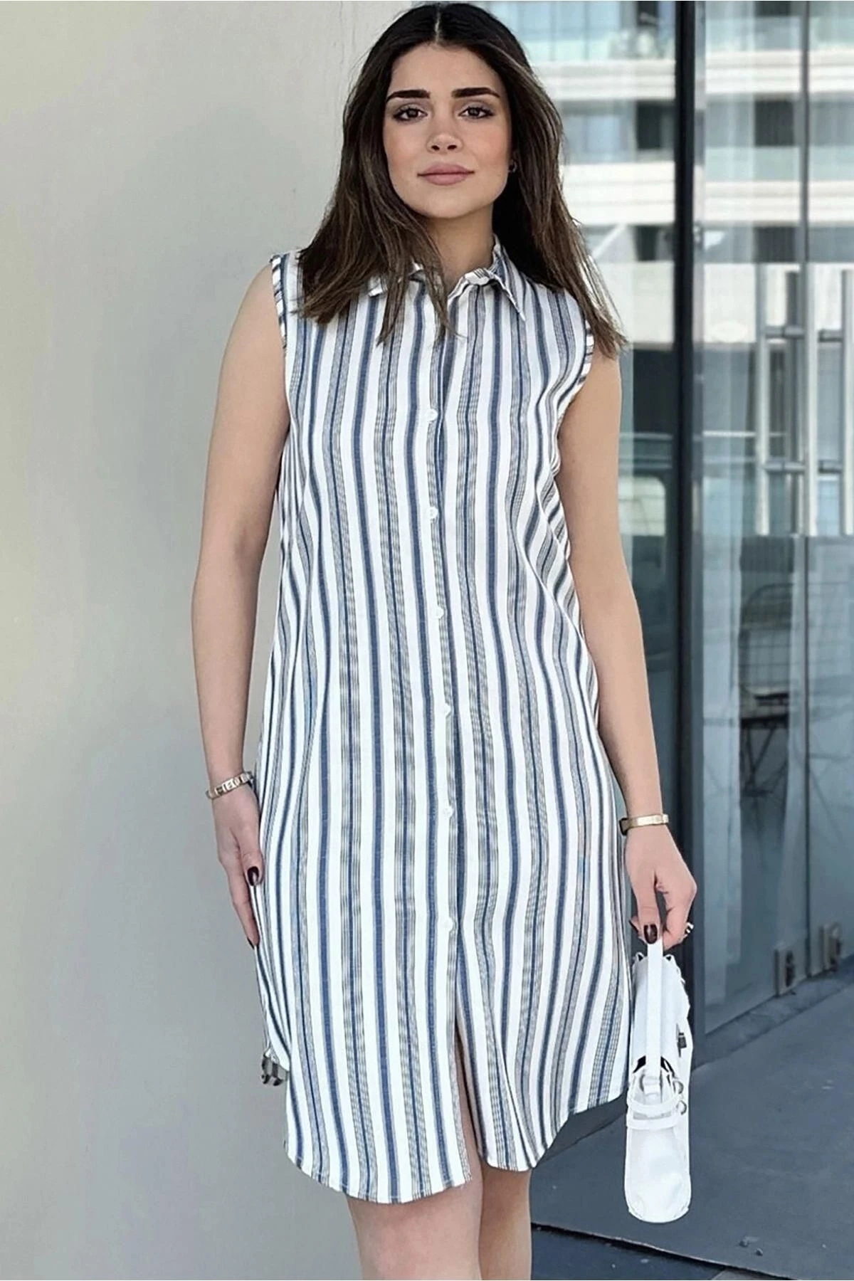 Kadın Laci Çizgili Desen, İthal Kumaş, Kolsuz, Rahat Kesim, Midi Gömlek Elbise