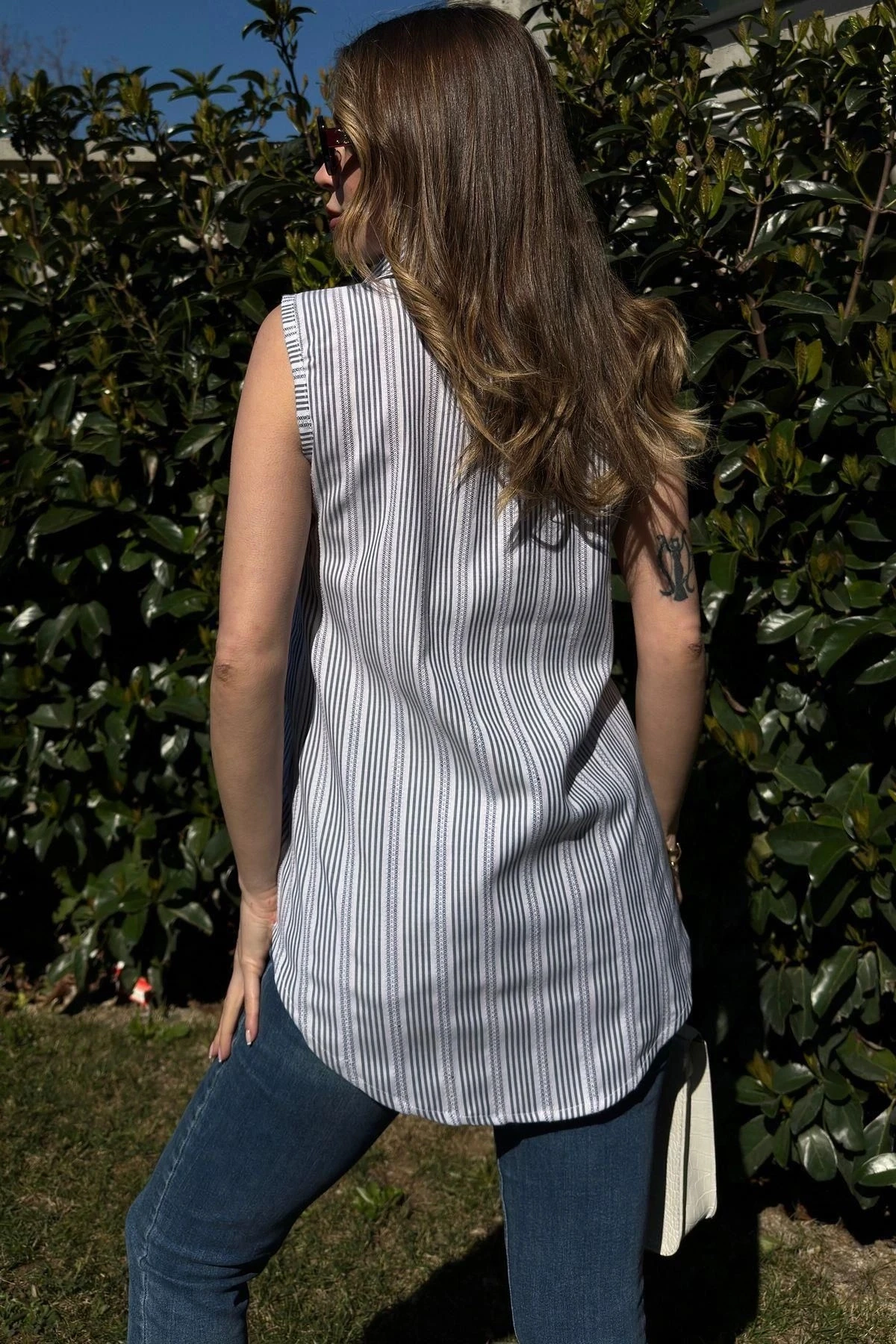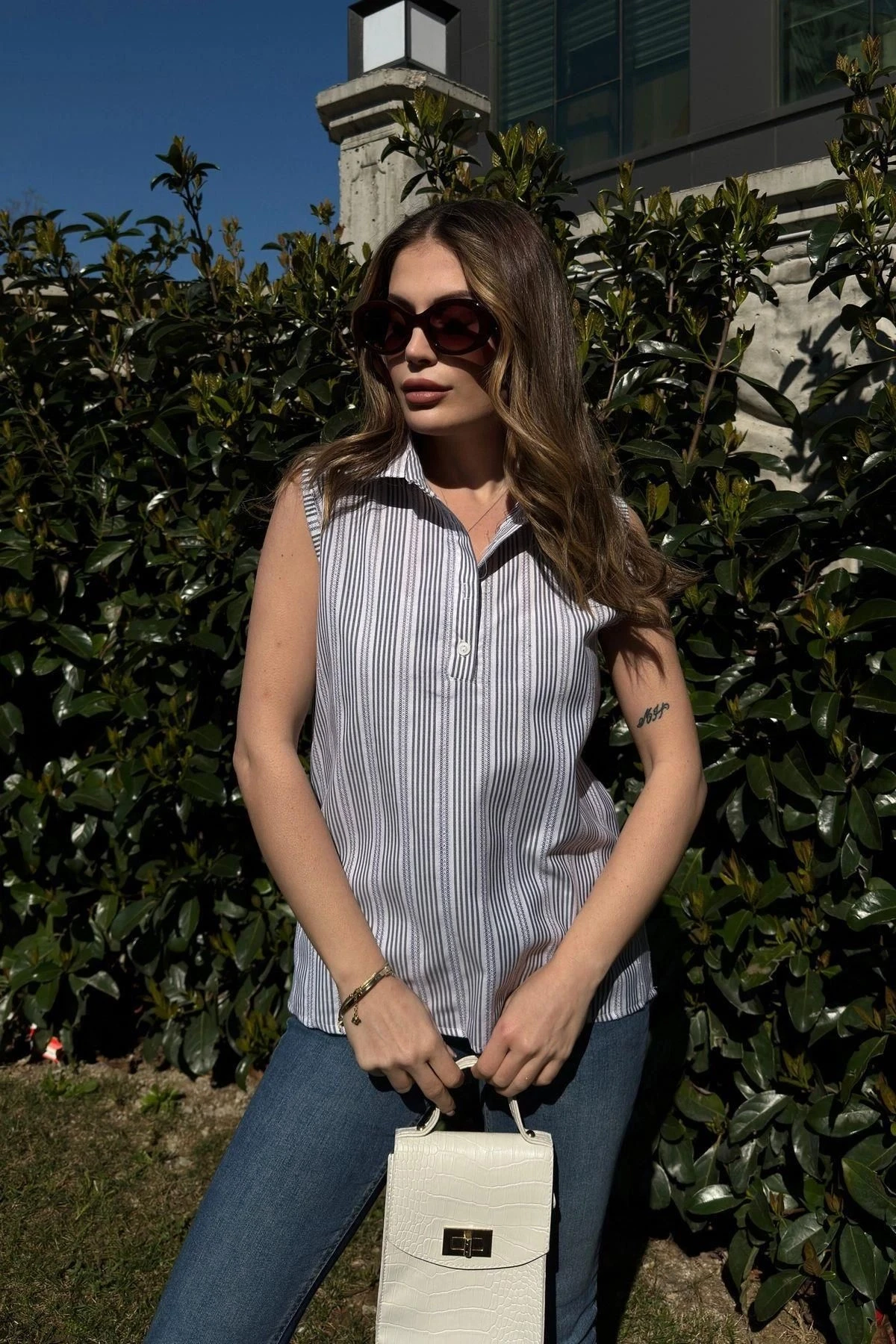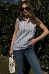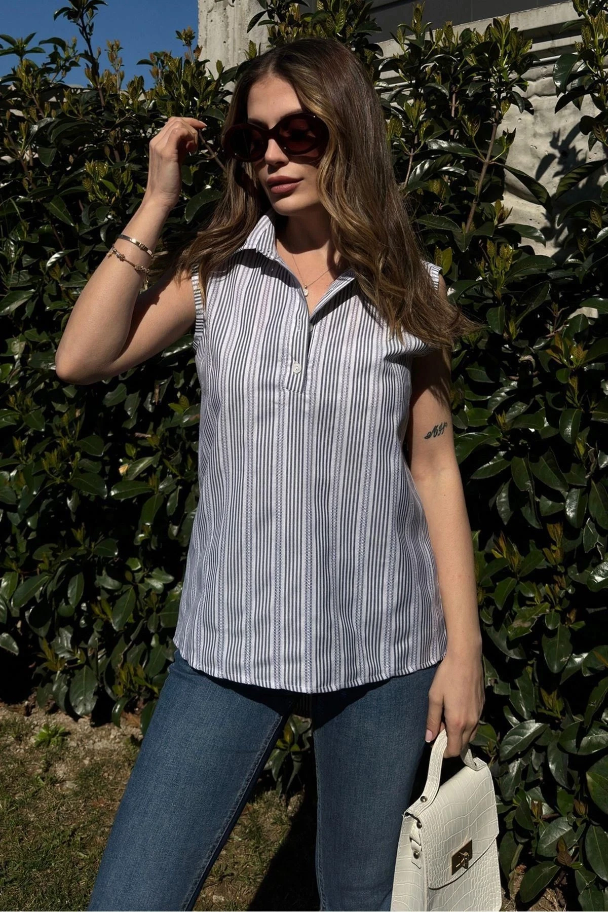 Kadın Laci Çizgili, Dokulu Yazlık Kumaş, Yarım Patlı, Sıfır Kollu Bluz