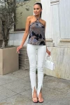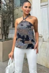 Kadın Laci & Ekru Desenli, Boyundan Bağlamalı, Tokalı Straplez, Dökümlü Salaş Bluz