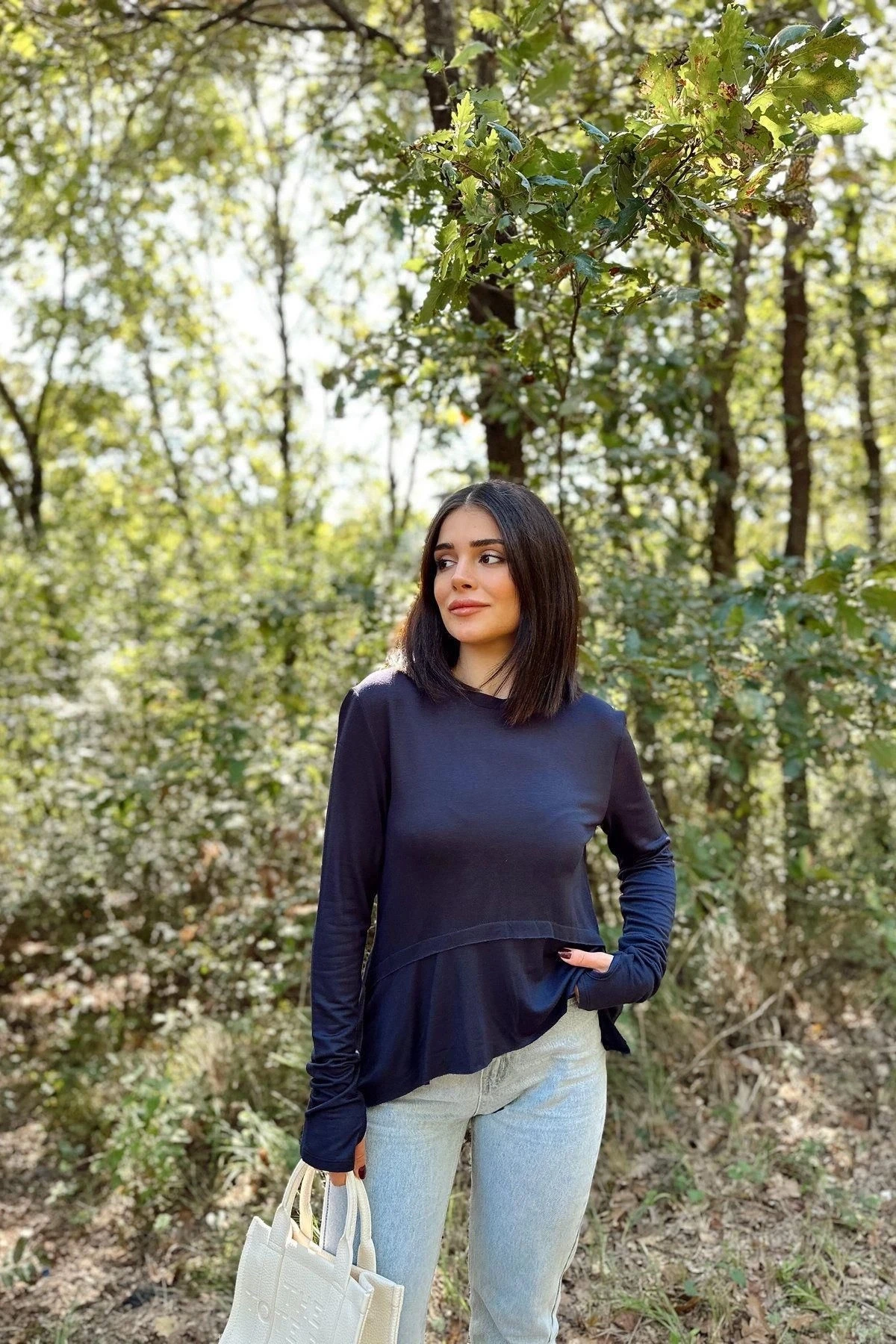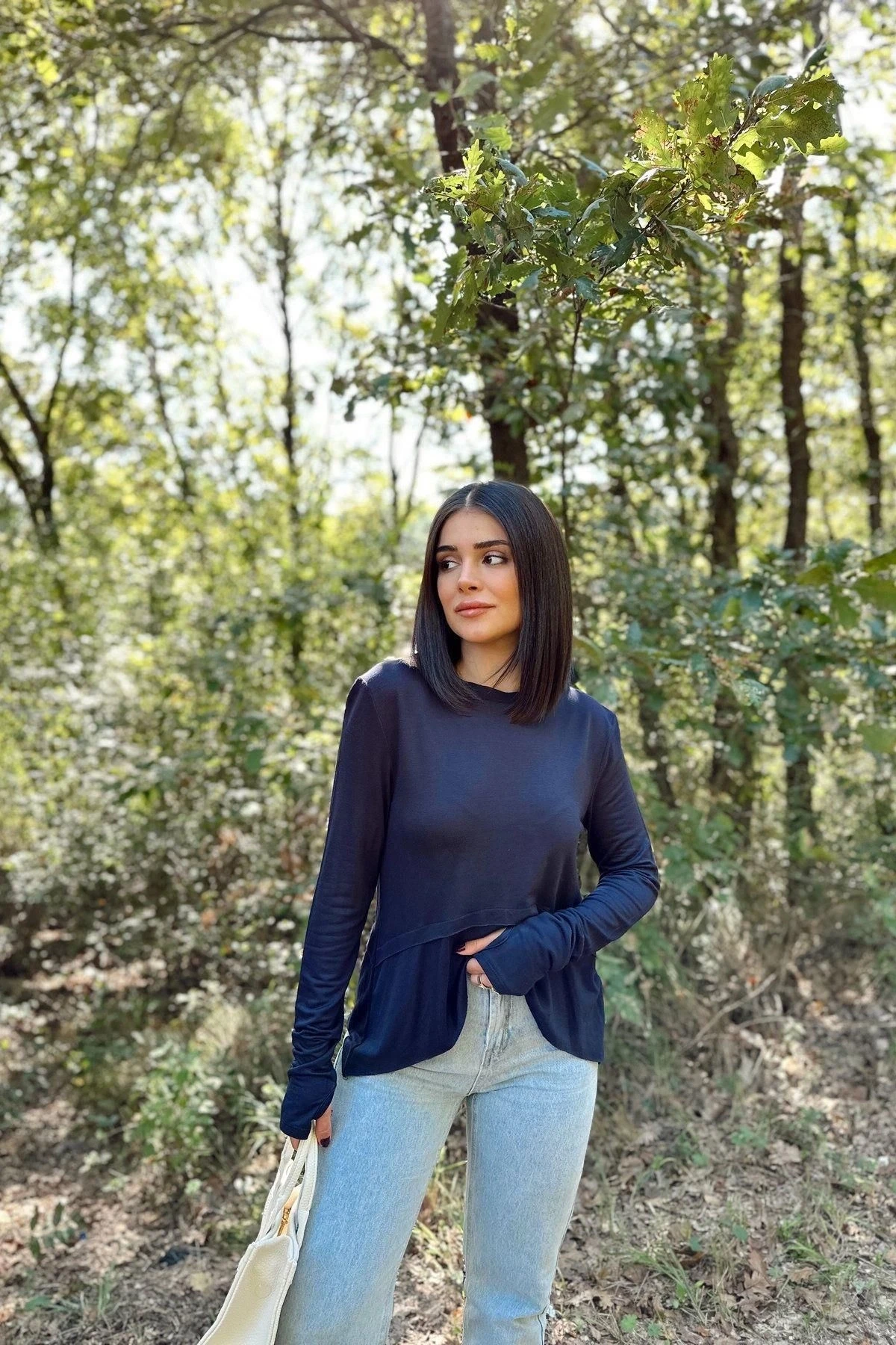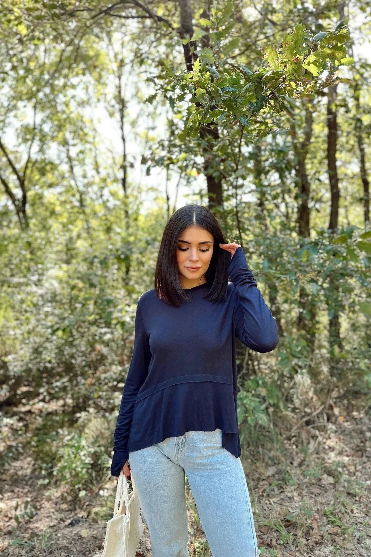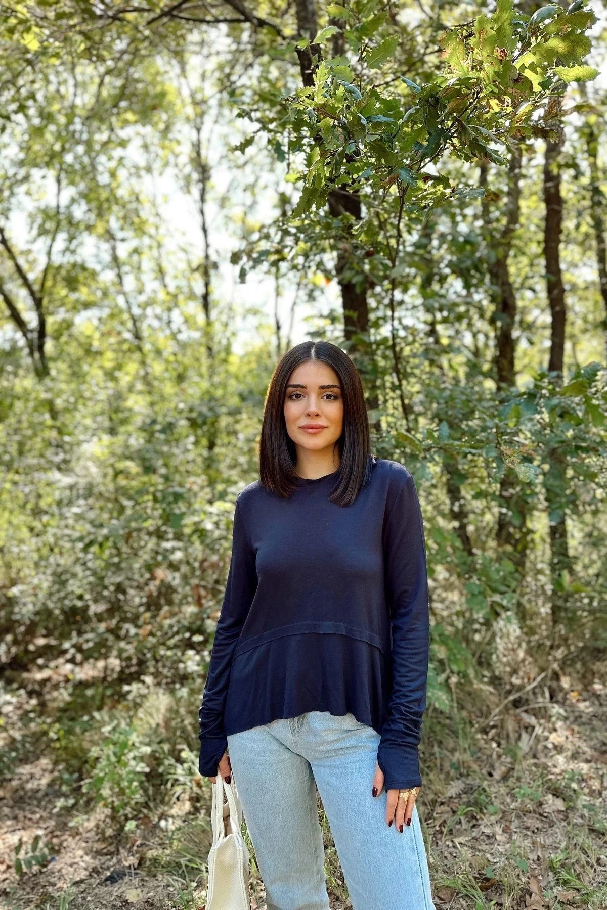 Kadın Laci Elleri Eldiven Detaylı, Asimetrik Kesim, Bisiklet Yaka, Eteği Pliseli, Salaş Spor Bluz